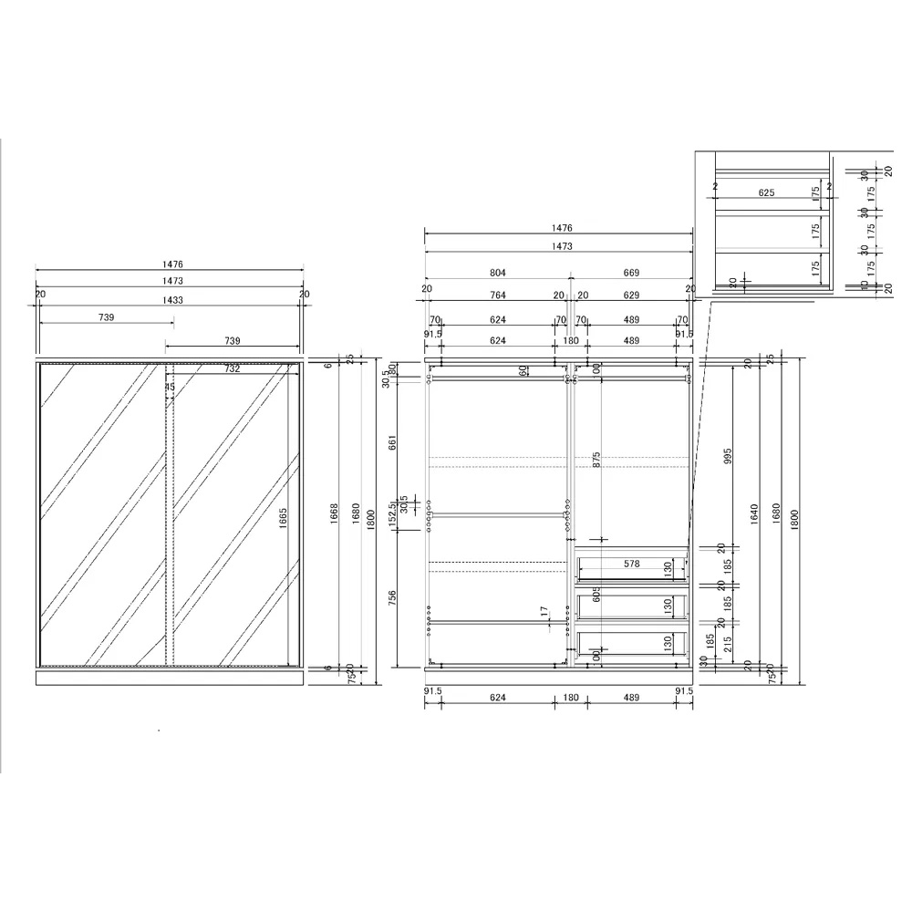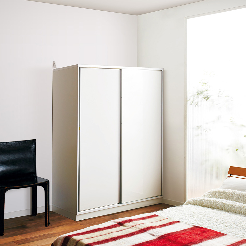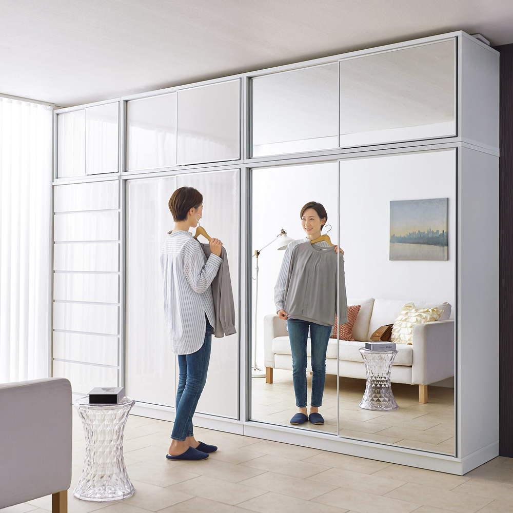 輝くミラーで憧れのクローゼットルームを演出する総ミラー貼りのワードローブ。開閉スペースをとらない引き戸仕様なので、他の家具との距離感などレイアウトの自由度がよりアップ。別売りの上置きを組み合わせて壁一面が収納スペースに。毎日のコーディネートを、こころゆくまで楽しめる◆ウォークインクローゼット並みの収納も可能。衣替えの手間いらずで、お気に入りの服を通年スタンバイしておけます。◆前面ミラータイプは、映り込み効果により、お部屋が明るく、広く感じます。◆板扉タイプは前面に丈夫なオレフィンシートを採用。光沢感たっぷりのホワイトです。◆美しさと収納力を兼ね備え、見た目は、まるで造り付け(オーダー)家具の様な印象です。◆上置き(別売り)と組み合わせれば、壁一面が優雅な収納スペースに生まれ変わります。リノベーションしない収納計画にも、リノベーションしたお部屋にも◆大容量の衣類収納を叶えるワードローブシリーズ。ハンガーや棚、チェストを備えた充実機能で、お手持ちの衣類をすっきりまとめることができます。リノベーションよりもぐっと低予算で、衣類収納をより使いやすく、美しくバージョンアップできます。◆リノベーションして広くなったお部屋にもおすすめ!天井までの壁一面を生かして大きな収納空間を作れるので、お部屋がいつも片づいた状態を保てます。前面ミラータイプなら、リノベーションできれいになったお部屋が映り込み、より広く感じさせてくれる効果もあります。【製品情報】[色の種類]◆落ち着いたモダンな印象のダークブラウン。◆明るく清潔感のあるホワイト。◆お部屋に溶け込む優しいメイプルナチュラル。[サイズ・バリエーション]◆奥行は引き戸式の3タイプ、チェストタイプ全て58cmの共通サイズ。◆引き戸式3タイプの幅は88cmと118cm、さらに超ワイドの148cmまで3サイズをご用意。◆タイプは、ワイシャツやブラウス、バッグなどアレコレしまえる棚タイプと、ジャケットなどの上着やスカートなどがたっぷりしまえるハンガータイプ、さらにその両方を兼ね備えた充実のハンガー棚タイプをご用意。◆スライドレール仕様の引き出しが3杯付いています。◆扉の枠にはアルミを使用し、美しくスタイリッシュな印象をさらに高めます。◆チェストタイプは幅57.5cmと77.5cmの2サイズをご用意。◆引き出しは全部で7杯付いています。◆上置き(別売り)は天井高さ208〜272cmの範囲で1cm単位でのオーダーが可能。◆幅57.5cmはプッシュ扉タイプになります。[機能・構造・仕様]◆可動棚板は収納物に合わせて3cmピッチで可動できます。◆本体には転倒防止バンド付きで、安全性にも配慮。◆上置き(別売り)は、天井突っ張り式で、安定度の高い仕様。