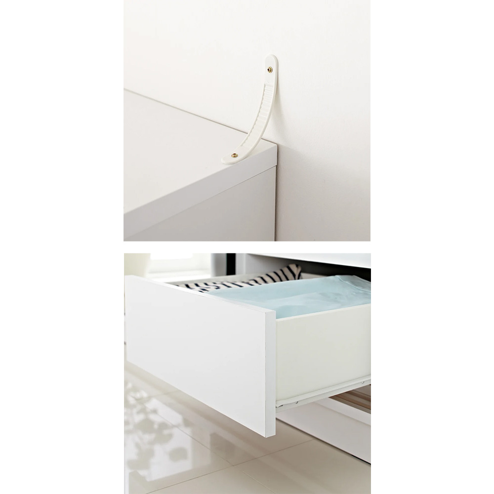 (写真上)転倒防止バンド付きで、安全性にも配慮。(写真下)引き出しはすべてスムーズに開閉できるストッパー付きスライドレール。