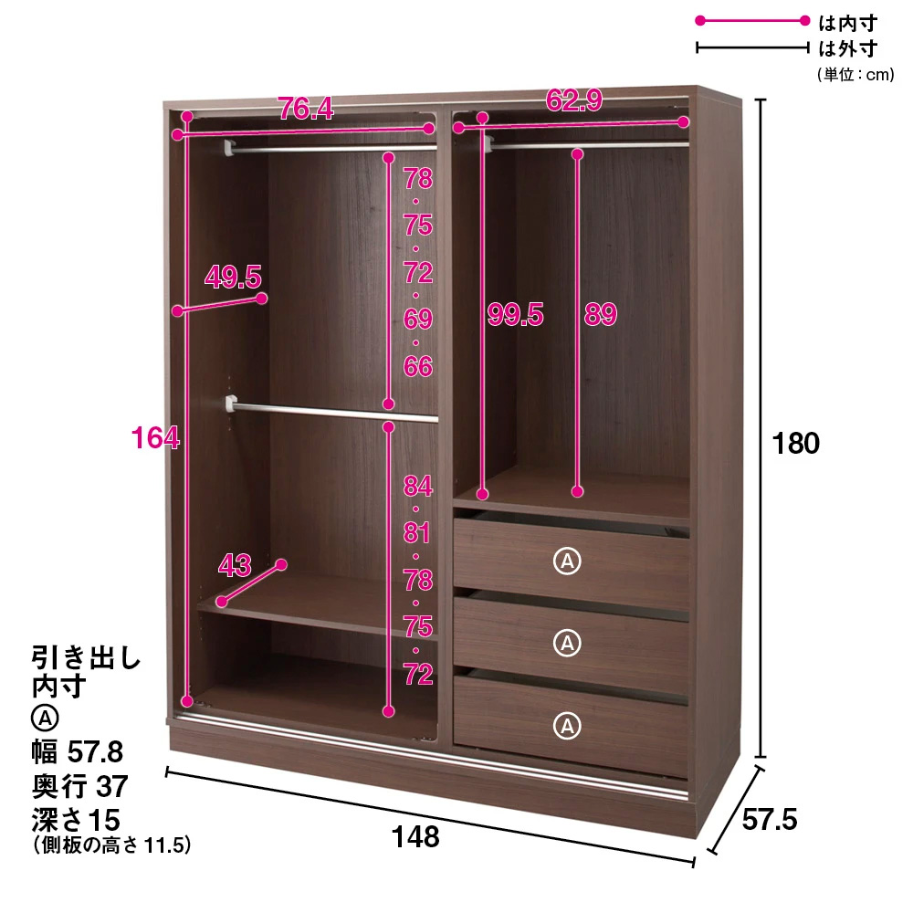 (扉を外した状態) 引き出しが3杯付いています。左側下段ハンガーと棚板は取り外せて、ロングコートも収納可能。