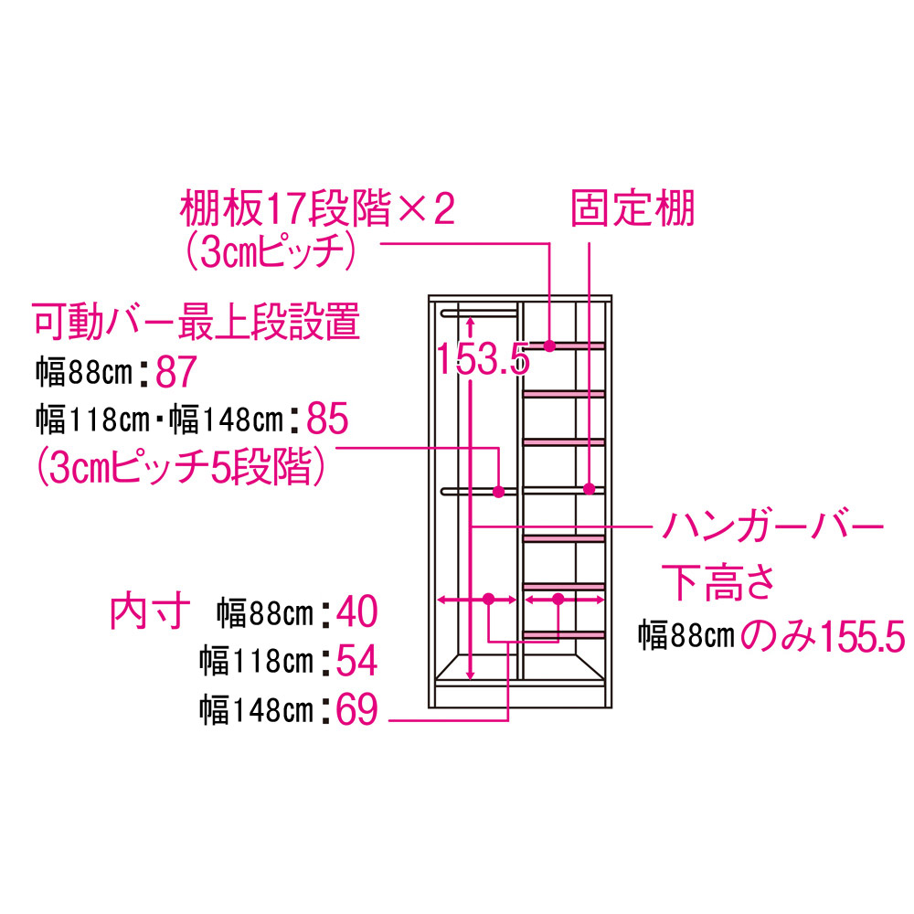 引き戸のワードローブにしか出来ない省スペース衣類収納!豊富なバリエーションと間仕切り仕様の高級仕上げでリビングルームの壁面収納として、寝室の間仕切りとして便利なクローゼットハンガーシリーズ。スライド扉に出来る省スペース機能をクローゼットハンガーラックに。デザインも今の住宅トレンドに合わせた木目の横柄と、高級感のある光沢ホワイトから選べます。機能満載。シンプルだけど洗練された収納家具。家具は部屋の雰囲気を左右する大きなファクターです。ウォークインクローゼットだけでなく、寝室やリビングルーム置いても使いやすく、様になるクローゼットハンガーです。【Check Point 1】高級感のある横目のダークブラウン木目柄。そして清潔感あふれる光沢仕様のホワイト色の壁面衣類収納。・住宅事情のトレンドに合わせた、高級感のあるダークブラウン色の横目木目柄。建具に合わせてリビングルームでも、寝室、ウォークインクローゼットでも置き場所を選びません。・間仕切り仕様の背面も木パネルを貼り合わせた高級仕様。間仕切り家具として使用した場合でもしっかりと壁面になってくれます。・取っ手などの細部もアルミ取っ手を使用するなどこだわりました。特にお客様が来る場所などでは嬉しい仕上げになっています。【Check Point 2】間仕切り収納としてタンスとしての機能を考えるて、引き戸収納にしました。・省スペース収納は日本の住宅事情を考えると、備えておきたい機能。扉が前に出てこない開閉スペース不要なので、動線や家具の置き場に困りません。・幅のバリエーションも88、118、148cmから選べ、普通のタンスサイズから大量収納サイズまで。洋服量に合わせてご購入下さい。・使う場所に応じて、収納物に応じて、お好みで上置きもご購入できます。日本の住宅では上に収納力を伸ばすのが賢い選択です。・ハンガーラックだけではなく、バッグ収納に便利なハンガー+棚タイプも選べるので、一つのタンスで衣類収納まわりが整理できるのも便利です。【Check Point 3】都会的なデザイン性、住宅事情を考えた機能、そしてワードローブとしての収納力を備えてます!収納家具のデザイン性はやはり重視したいものです。モダンなデザインは洗練された雰囲気をつくってくれます。もちろん機能も外せません。開閉スペース不要の引き戸仕様。さらに上置きもオプション購入できる収納力。ハンガーラック収納、バッグ収納、靴収納にも使えます。ウォークインクローゼットやリビングの壁面収納家具として、寝室のクローゼットハンガーとして、シューズクローゼットでもご使用できるかしれません。【Check Point 4】収納力をUPさせながら、本体をしっかりと固定する突っ張り式上置きが別売であります。・上置き(別売り)は1cm単位でオーダーできます。・上置きとの組合せ次第(高さの低いタイプと、高いタイプがあります)で天井高208〜272cmに対応。・上置きを使用すると壁面収納家具として収納力をさらにUPできます。