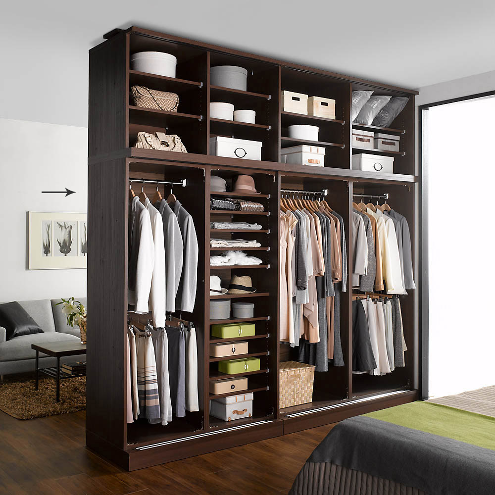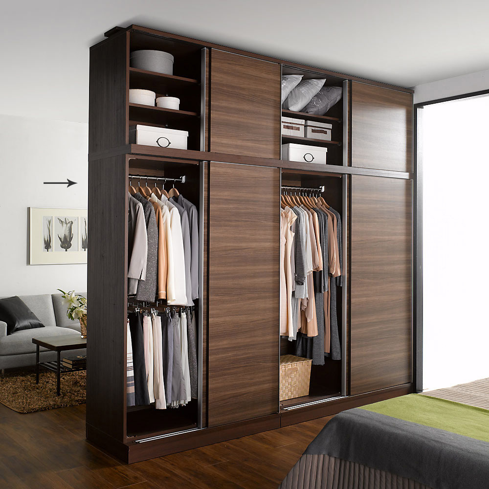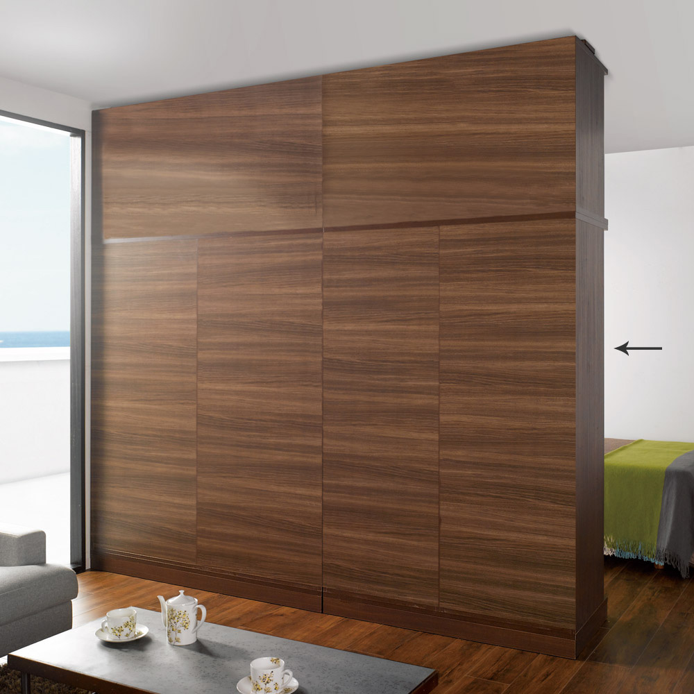 引き戸式で開閉スペース不要省スペースワードローブ。背面も間仕切りパネルの高級仕様。 ≪組合せ例≫※左からハンガー・棚幅118、ハンガー幅148cm 上置き(別売)を置いて撮影しています。 ダークブラウン
