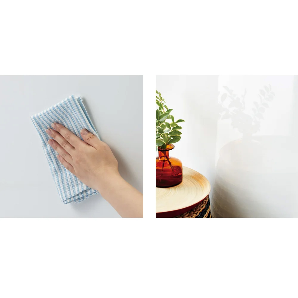 (写真左)耐汚性・耐傷性に優れた素材で、美しさが長持ち。お手入れも簡単です。 (写真右)(エ)前面には光沢感が美しいピュアフィールを使用。お部屋に高級感を演出します。