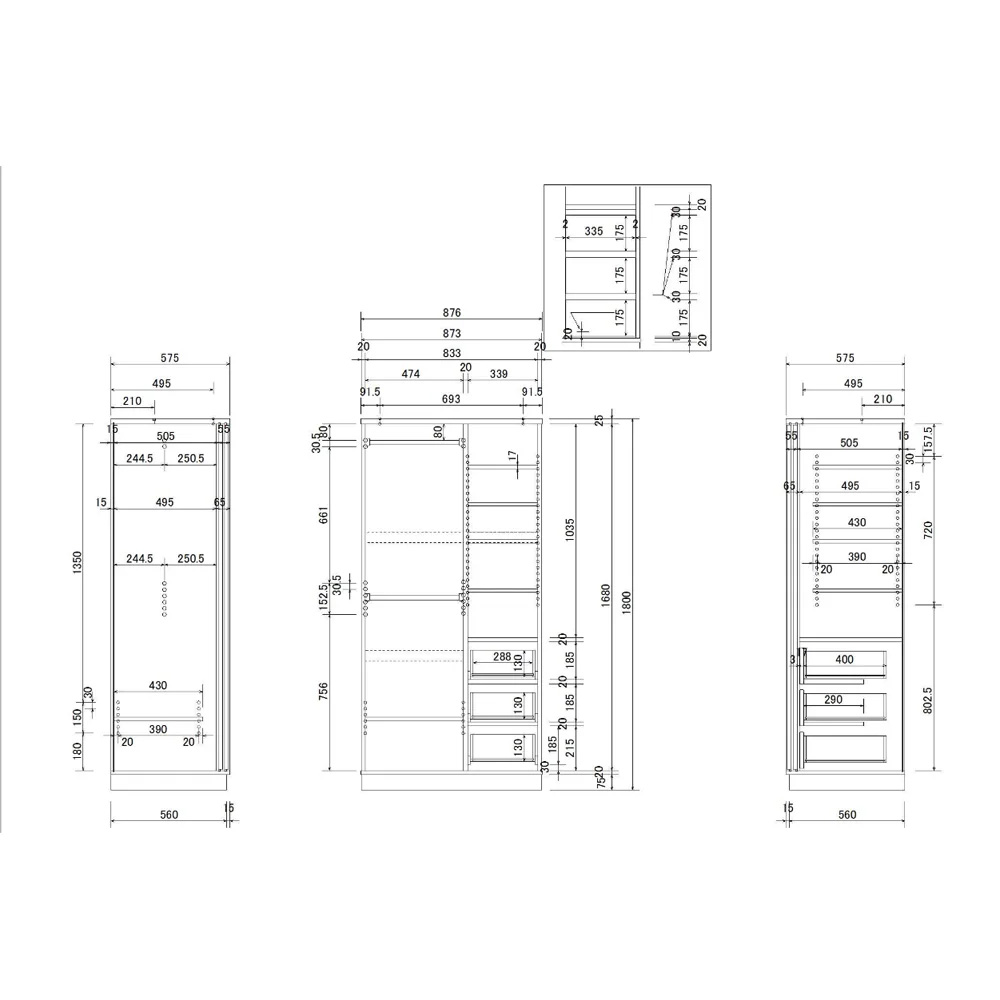 (扉を外した状態)左側下段ハンガーと棚板は取り外せて、ロングコートも収納可能。