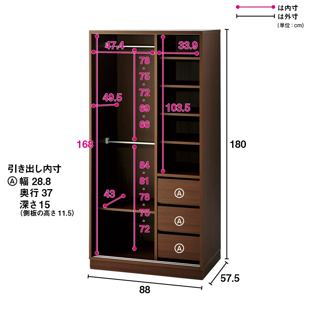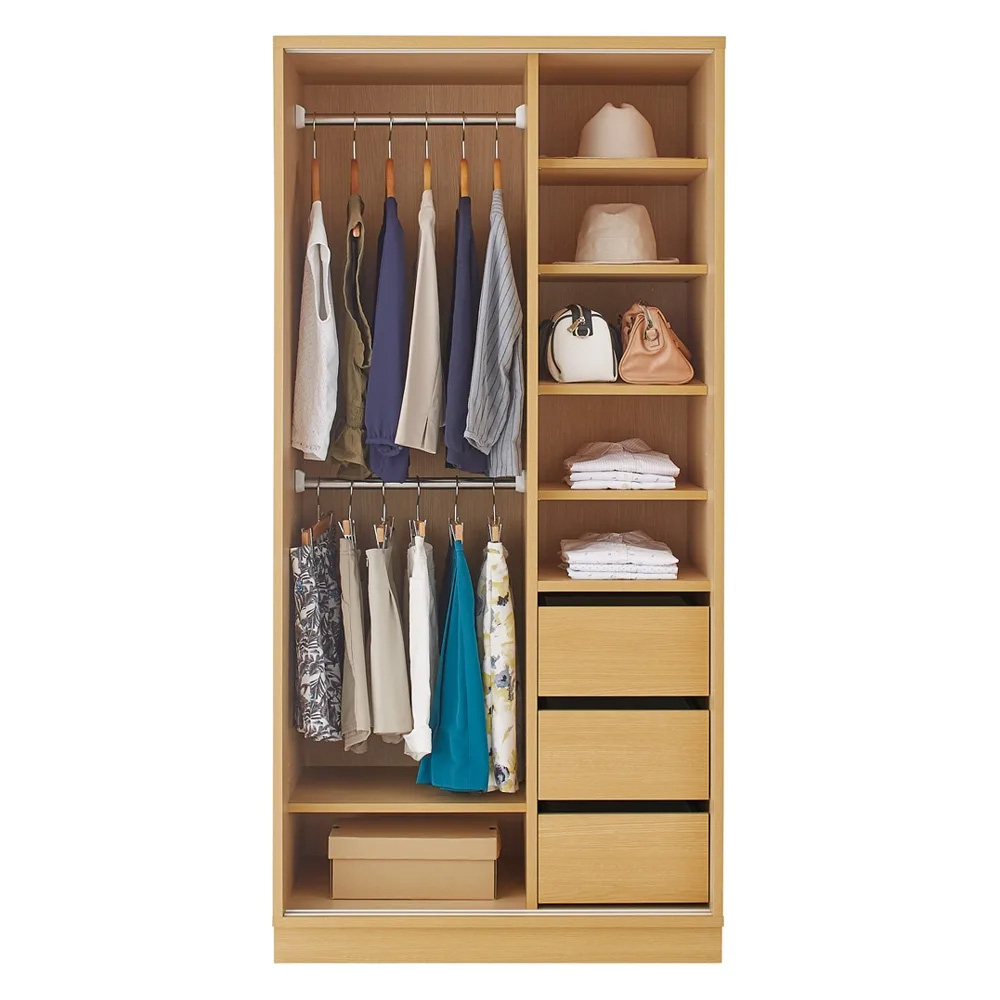 輝くミラーで憧れのクローゼットルームを演出する総ミラー貼りのワードローブ。開閉スペースをとらない引き戸仕様なので、他の家具との距離感などレイアウトの自由度がよりアップ。別売りの上置きを組み合わせて壁一面が収納スペースに。毎日のコーディネートを、こころゆくまで楽しめる◆ウォークインクローゼット並みの収納も可能。衣替えの手間いらずで、お気に入りの服を通年スタンバイしておけます。◆前面ミラータイプは、映り込み効果により、お部屋が明るく、広く感じます。◆板扉タイプは前面に丈夫なオレフィンシートを採用。光沢感たっぷりのホワイトです。◆美しさと収納力を兼ね備え、見た目は、まるで造り付け(オーダー)家具の様な印象です。◆上置き(別売り)と組み合わせれば、壁一面が優雅な収納スペースに生まれ変わります。リノベーションしない収納計画にも、リノベーションしたお部屋にも◆大容量の衣類収納を叶えるワードローブシリーズ。ハンガーや棚、チェストを備えた充実機能で、お手持ちの衣類をすっきりまとめることができます。リノベーションよりもぐっと低予算で、衣類収納をより使いやすく、美しくバージョンアップできます。◆リノベーションして広くなったお部屋にもおすすめ!天井までの壁一面を生かして大きな収納空間を作れるので、お部屋がいつも片づいた状態を保てます。前面ミラータイプなら、リノベーションできれいになったお部屋が映り込み、より広く感じさせてくれる効果もあります。【製品情報】[色の種類]◆落ち着いたモダンな印象のダークブラウン。◆明るく清潔感のあるホワイト。◆お部屋に溶け込む優しいメイプルナチュラル。[サイズ・バリエーション]◆奥行は引き戸式の3タイプ、チェストタイプ全て58cmの共通サイズ。◆引き戸式3タイプの幅は88cmと118cm、さらに超ワイドの148cmまで3サイズをご用意。◆タイプは、ワイシャツやブラウス、バッグなどアレコレしまえる棚タイプと、ジャケットなどの上着やスカートなどがたっぷりしまえるハンガータイプ、さらにその両方を兼ね備えた充実のハンガー棚タイプをご用意。◆スライドレール仕様の引き出しが3杯付いています。◆扉の枠にはアルミを使用し、美しくスタイリッシュな印象をさらに高めます。◆チェストタイプは幅57.5cmと77.5cmの2サイズをご用意。◆引き出しは全部で7杯付いています。◆上置き(別売り)は天井高さ208〜272cmの範囲で1cm単位でのオーダーが可能。◆幅57.5cmはプッシュ扉タイプになります。[機能・構造・仕様]◆可動棚板は収納物に合わせて3cmピッチで可動できます。◆本体には転倒防止バンド付きで、安全性にも配慮。◆上置き(別売り)は、天井突っ張り式で、安定度の高い仕様。