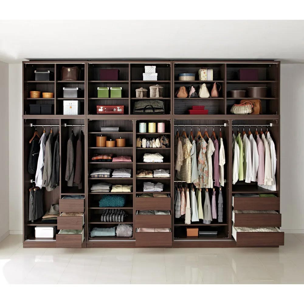 使用イメージ(ウ)前板:ミラー・本体:ダークブラウン ※写真は別売りの幅148cmハンガータイプ、幅88cmハンガータイプ、幅118cm棚タイプ、上置き3本との組合せです。 ※天井高さ260cmで撮影しています。
