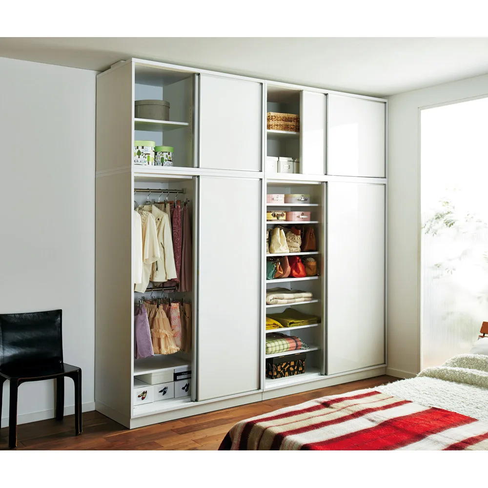 使用イメージ(エ)前板:ホワイト・本体:ホワイト ※写真は別売りの幅118cmハンガー棚タイプ、幅148cm棚タイプ、上置きの組合せです。