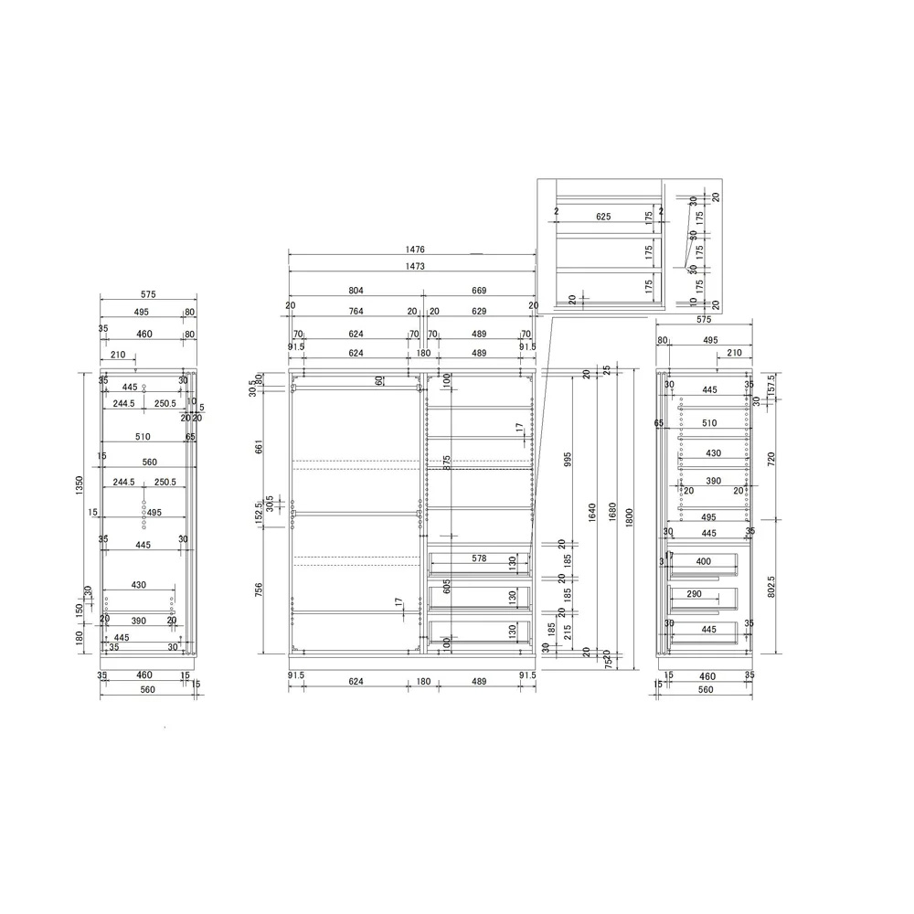 コーディネート例(イ)前板:ミラー・本体:メイプルナチュラル ※お届けは写真右奥の幅148cmハンガー棚タイプです。 ※写真は別売りの幅118cmハンガータイプ、幅88cm棚タイプ、上置き3本との組合せです。 ※天井高さ260cmで撮影しています。