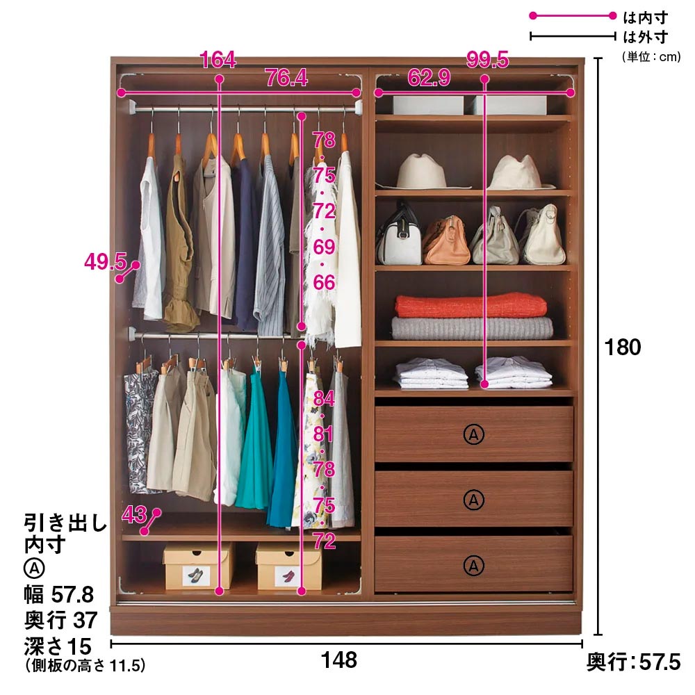 構造見本 (扉を外した状態)左側下段ハンガーと棚板は取り外せて、ロングコートも収納可能。 ※写真は別売りの幅88cmタイプです。