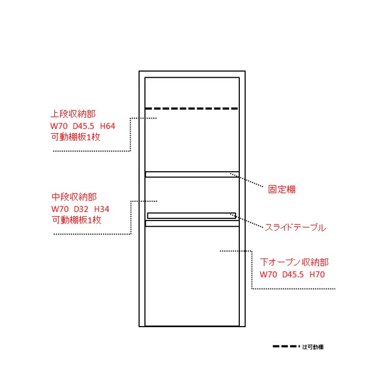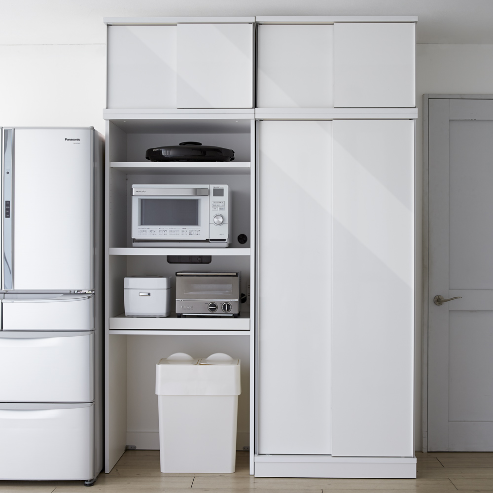 キッチンをリフォーム気分で収納力アップできる収納庫シリーズに合わせたキッチンラック。下部分にゴミ箱などを収納できるオープンスペースが付いているので空間を無駄なく活用。大型レンジ対応のレンジ台です。リフォームみたいにキッチンすっきり!ごみ箱収納スペース付き家電収納どんなにキレイにしていても雑多な雰囲気がどうしても拭えないキッチン周り。そんなキッチンをあっという間にすっきり空間に変えるアイデアキッチン収納シリーズです。下部分は床の見えるオープンタイプで、お手持ちのダストボックスを収納すれば空間を無駄なく活用できておしゃれなキッチンに。ダストボックススペースを確保した家電ラック◆下オープン部分は部屋の床が見える地板のないタイプ。◆脚ペダル式のダストボックスも収まるので空間を無駄なく活用できます。◆ダストボックスだけでなく、置き場所に困るダンボールなどの大きなものの仮置きスペースとしても。◆空間を無駄なく活用できるので一人暮らしのキッチンインテリアや狭いキッチンへの設置にも適したコンパクトレンジ台です。家電が使いやすいこだわり設計のレンジ台◆炊飯器などを置くスライドテーブルは床から70cmほどの高さに設定し、腰を丸めずにご飯がよそえるデザインの家電台です。◆レンジも床から100cmほどの高さになるように設定し、中を覗き込みやすいように設計しました。◆上部には可動棚付きで、レンジの高さに合わせてたなを設置し、ホットプレートなどを乗せることができるマルチラック仕様のカップボードです。◆レンジ、トースター、炊飯器、ホットプレートなどキッチン家電は全てこれ1台にまとめて収納できます。空間を無駄にせずしっかり固定、高さオーダー突っ張り上置き。◆天井までの空間を収納スペースに変える、1cm単位高さオーダーの上置きを別売りでご用意。◆キッチンの天井高に合わせた突っ張りタイプの上置きでキッチンボードの安定感もアップ。◆レンジラック専用の上置きをご希望の方はシリーズ商品一覧をご覧ください。◆上置きは天井総高208cm〜272cmまでに対応しています。安心と信頼の国内生産品のキッチン収納◆熟練の家具職人がひとつずつ丁寧に仕上げたワンランク上のダイニングボード・キッチンラックです。◆細部の丁寧な仕上がりなど、国産品ならではの高品質を台所でお楽しみください。