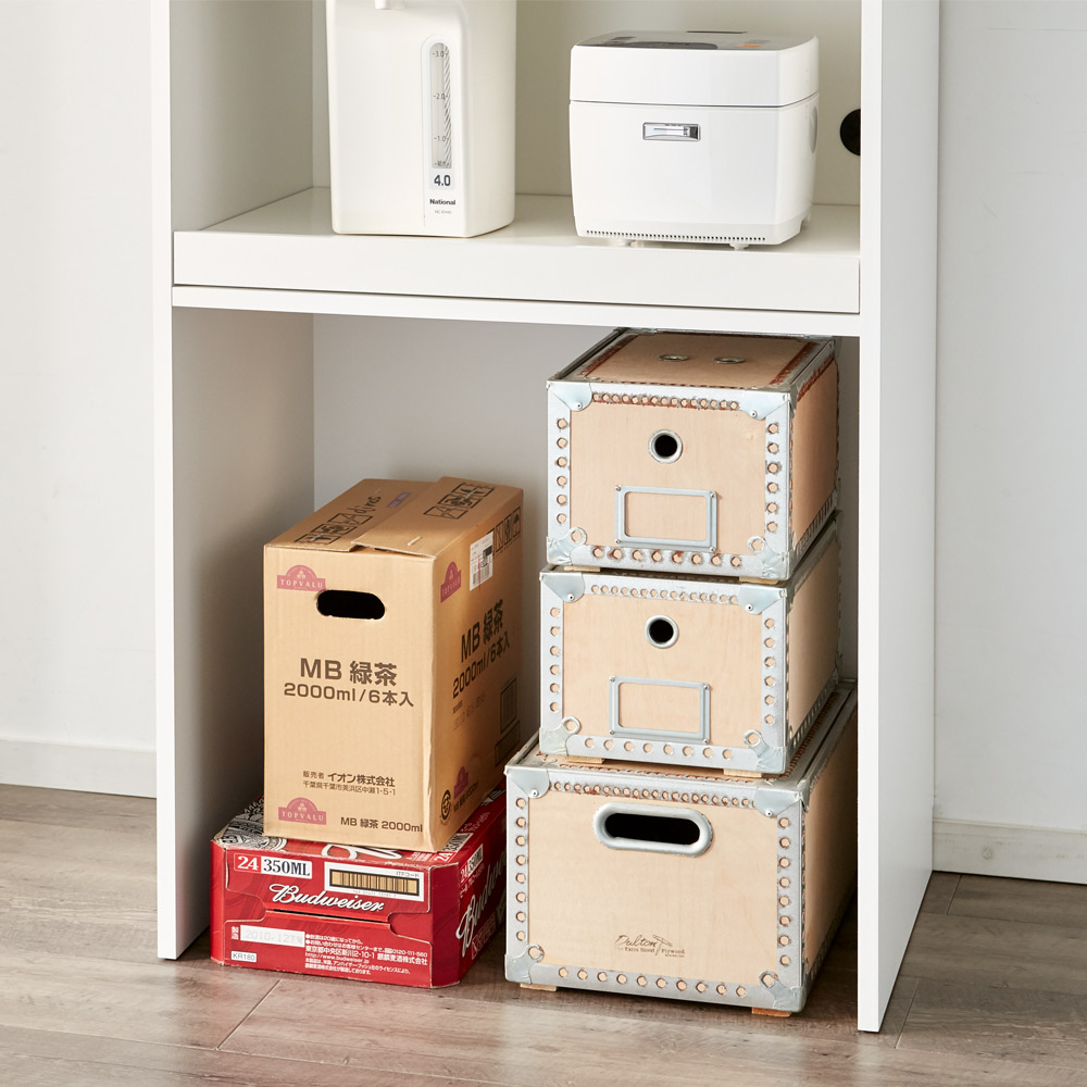 最下段のオープン収納は、重たい箱やごみ箱の指定席に。