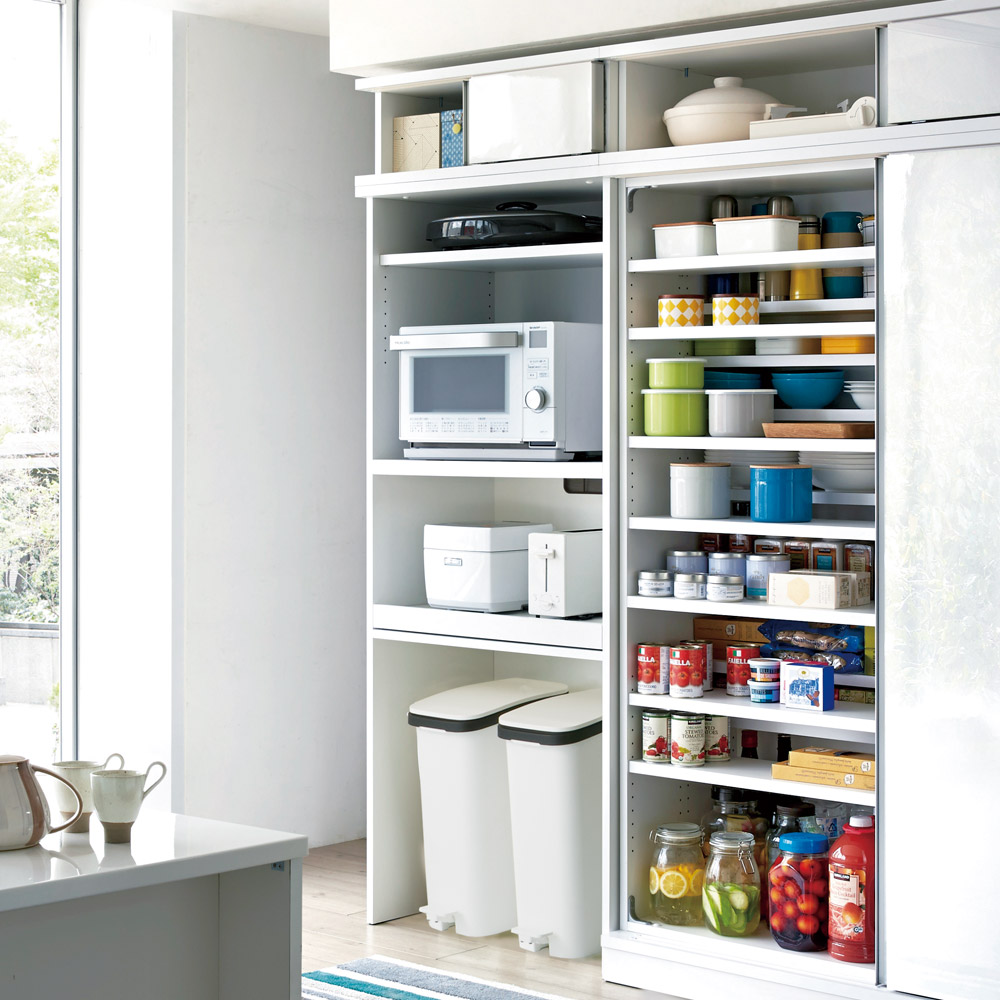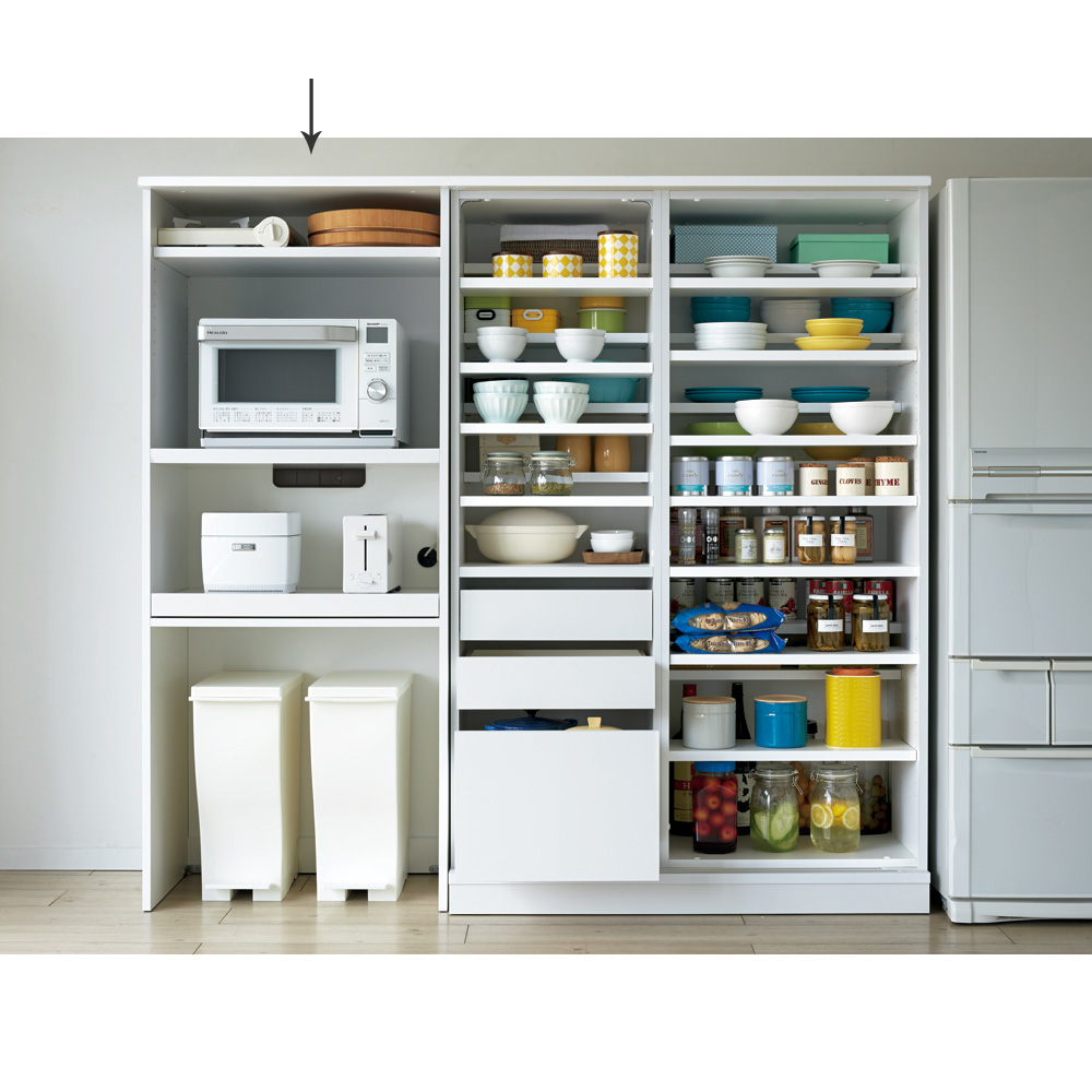 コーディネート例(ア)ホワイト 同シリーズのパントリー収納庫と合わせればキッチンに必要なものを一括して管理できる効率の良いキッチンに。 ≪シリーズ組合せ例≫ ※写真の天井高さ210cm