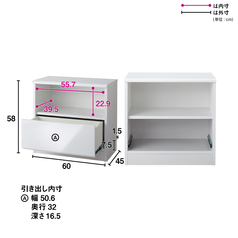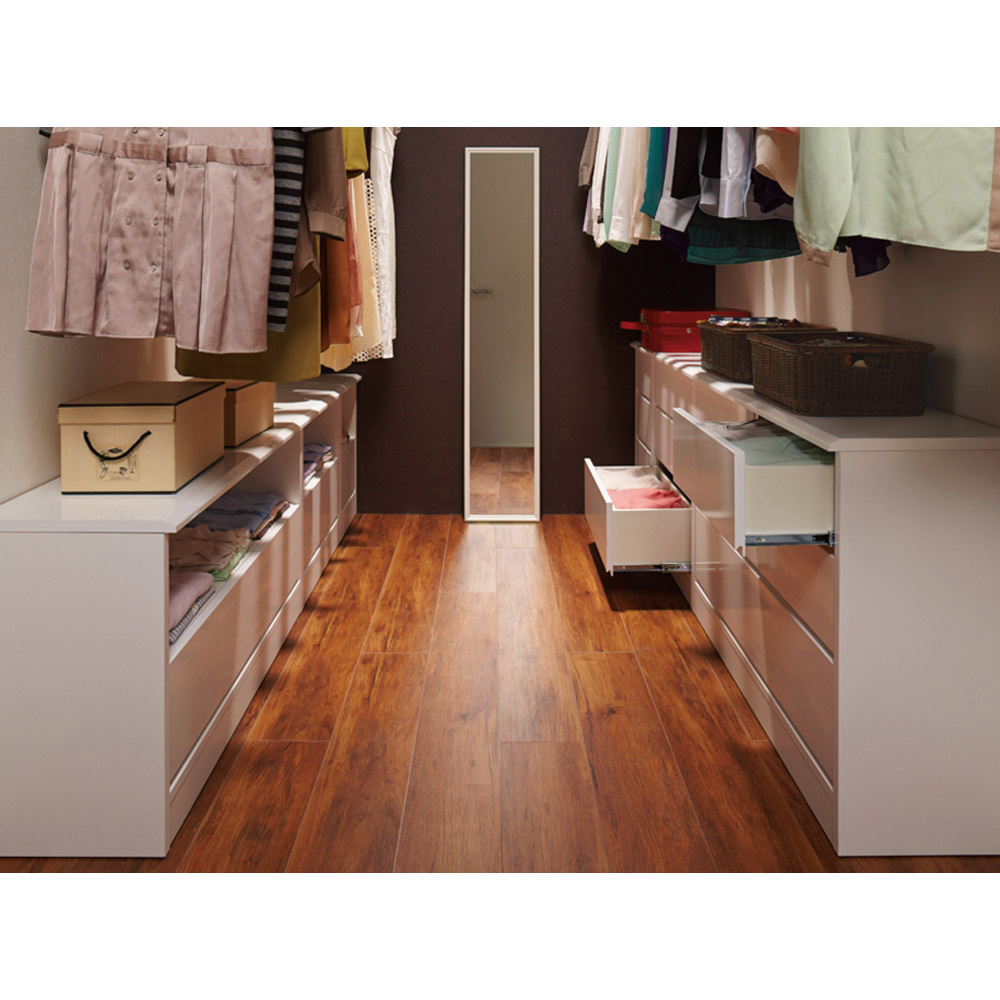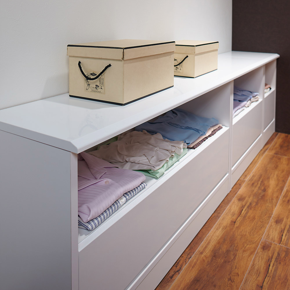 世界でただひとつ、ここはあなただけの衣装部屋。ウォークインクローゼットのハンガー下の空間を無駄なく有効活用。見た目に美しく機能的な収納システム。幅60・100の2サイズと幅29〜59cmオーダータイプを組み合わせれば、まるで作り付け家具のように収納スペースを創ることができるローチェスト。収納空間のクローゼット、ウォークインクローゼットを有効に使えていますか?備え付けのハンガーにたくさんの洋服がかかっていると思いますが、その下の空間はどうでしょうか。無造作に箱が積み重なっていたり、バッグが散らばっていたり、無駄に空間が空いていたりしていませんか?この商品は、そんな問題を解消できて、すっきり片付いた美しい収納空間を実現するための衣類収納家具です。このシリーズには、幅サイズ:29〜59cmサイズオーダー・60cm・100cm の3サイズ奥行:35cm・45cm・56cm の3サイズ高さ:58cm・72cm型:オープン収納&引き出しタイプ・フルスライドチェストタイプ以上36種類をご用意しております。さらに色は、ホワイト、ライトナチュラル、ダークブラウンの3色ご用意。設置スペースのサイズ、床や扉や壁の色に合わせて自由にお選びいただけます。ハンガー下の空間にぴったり収まった棚&引き出し収納を創り、誰でも整理しやすく、美しさを持続できるクローゼット収納を手に入れましょう。こちらは、幅60cmサイズオーダー高さ58cm・72cm オープン棚&引き出しタイプです。・オープン棚は高さ58cmは1段・高さ78cmは2段、引き出し収納1段という構造です。オープン部に使用頻度の高いYシャツやTシャツ、バッグを、引き出しに嵩張る冬物などを整理するのにオススメです。・引き出しはストッパー付きフルスライドレール仕様で全開でます。収納物の出し入れがしやすいのが特長です。・奥行サイズを35・45・56cmから設置場所に合わせてお選びください。・同シリーズの幅29〜59cmオーダータイプ、幅100cmタイプと組み合わせるとハンガー下スペースにぴったり設置できます。