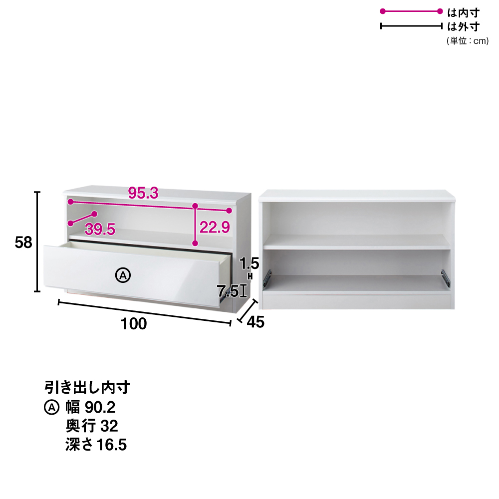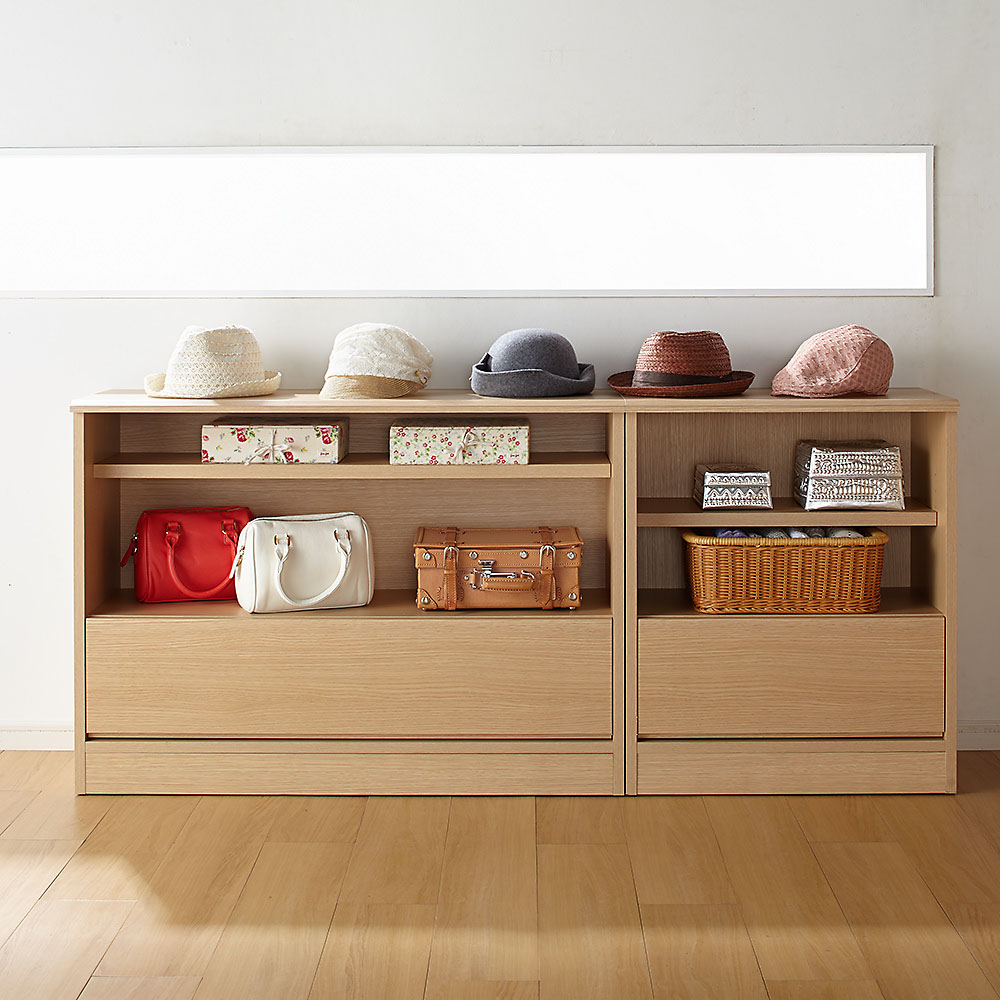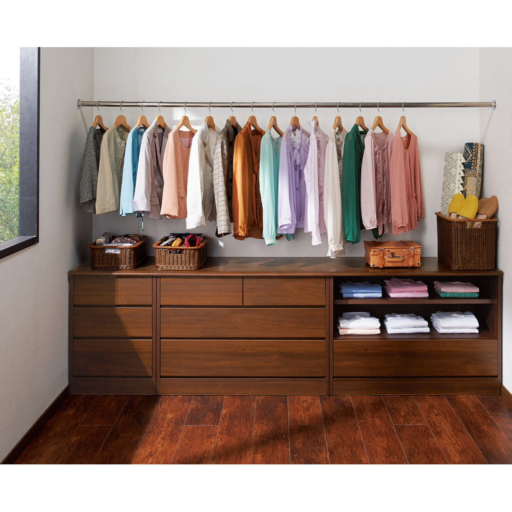 世界でただひとつ、ここはあなただけの衣装部屋。ウォークインクローゼットのハンガー下の空間を無駄なく有効活用。見た目に美しく機能的な収納システム。幅60・100の2サイズと幅29〜59cmオーダータイプを組み合わせれば、まるで作り付け家具のように収納スペースを創ることができるローチェスト。収納空間のクローゼット、ウォークインクローゼットを有効に使えていますか?備え付けのハンガーにたくさんの洋服がかかっていると思いますが、その下の空間はどうでしょうか。無造作に箱が積み重なっていたり、バッグが散らばっていたり、無駄に空間が空いていたりしていませんか?この商品は、そんな問題を解消できて、すっきり片付いた美しい収納空間を実現するための衣類収納家具です。このシリーズには、幅サイズ:29〜59cmサイズオーダー・60cm・100cm の3サイズ奥行:35cm・45cm・56cm の3サイズ高さ:58cm・72cm型:オープン収納&引き出しタイプ・フルスライドチェストタイプ以上36種類をご用意しております。さらに色は、ホワイト、ライトナチュラル、ダークブラウンの3色ご用意。設置スペースのサイズ、床や扉や壁の色に合わせて自由にお選びいただけます。ハンガー下の空間にぴったり収まった棚&引き出し収納を創り、誰でも整理しやすく、美しさを持続できるクローゼット収納を手に入れましょう。こちらは、幅100cm高さ58cm・72cm オープン棚&引き出しタイプです。・オープン棚は高さ58cmは1段・高さ78cmは2段、引き出し収納1段という構造です。オープン部に使用頻度の高いYシャツやTシャツ、バッグを、引き出しに嵩張る冬物などを整理するのにオススメです。・引き出しはストッパー付きフルスライドレール仕様で全開でます。収納物の出し入れがしやすいのが特長です。・奥行サイズを35・45・56cmから設置場所に合わせてお選びください。・同シリーズの幅29〜59cmオーダータイプ、幅60cmタイプと組み合わせるとハンガー下スペースにぴったり設置できます。