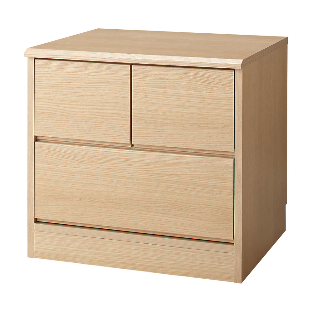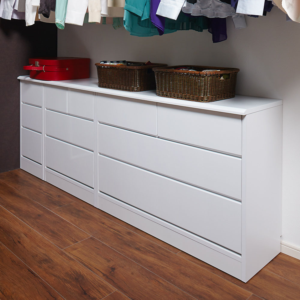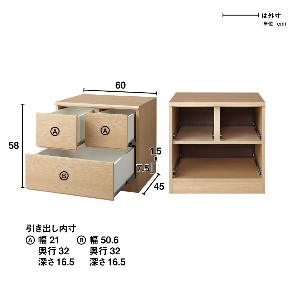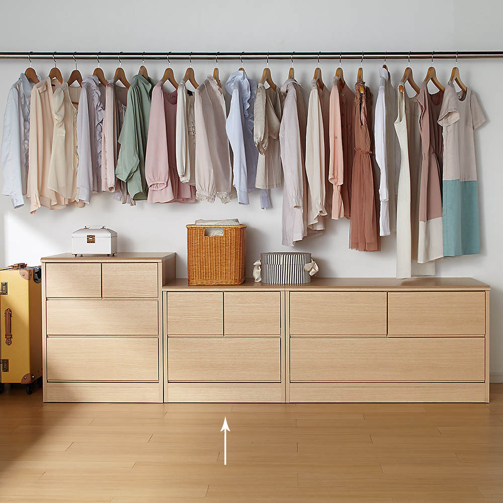 世界でただひとつ、ここはあなただけの衣装部屋。ウォークインクローゼットのハンガー下の空間を無駄なく有効活用。見た目に美しく機能的な収納システム。幅60・100の2サイズと幅29〜59cmオーダータイプを組み合わせれば、まるで作り付け家具のように収納スペースを創ることができるローチェスト。収納空間のクローゼット、ウォークインクローゼットを有効に使えていますか?備え付けのハンガーにたくさんの洋服がかかっていると思いますが、その下の空間はどうでしょうか。無造作に箱が積み重なっていたり、バッグが散らばっていたり、無駄に空間が空いていたりしていませんか?この商品は、そんな問題を解消できて、すっきり片付いた美しい収納空間を実現するための衣類収納家具です。このシリーズには、幅サイズ:29〜59cmサイズオーダー・60cm・100cm の3サイズ奥行:35cm・45cm・56cm の3サイズ高さ:58cm・72cm型:オープン収納&引き出しタイプ・フルスライドチェストタイプ以上36種類をご用意しております。さらに色は、ホワイト、ライトナチュラル、ダークブラウンの3色ご用意。設置スペースのサイズ、床や扉や壁の色に合わせて自由にお選びいただけます。ハンガー下の空間にぴったり収まった棚&引き出し収納を創り、誰でも整理しやすく、美しさを持続できるクローゼット収納を手に入れましょう。こちらは、幅60cm高さ58cm・72cm フルスライドチェストタイプです。・高さ58cmは引き出し収納2段(上は小引き出し、下は大引き出し)、高さ72cmは引き出し収納3段(最上段は小引き出し、下2段は大引き出し)という構造です。Tシャツやトレーナー、セーターはもちろんダウンジャケット、コートなどのかさばる冬物の収納にもオススメです。・引き出しはストッパー付きフルスライドレール仕様で全開でます。収納物の出し入れがしやすいのが特長です。・奥行サイズを35・45・56cmから設置場所に合わせてお選びください。・同シリーズの幅29〜59cmオーダータイプ、幅100cmタイプと組み合わせるとハンガー下スペースにぴったり設置できます。