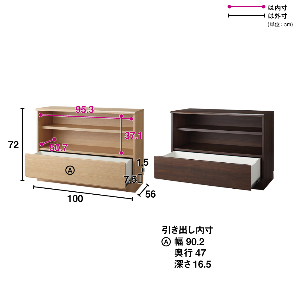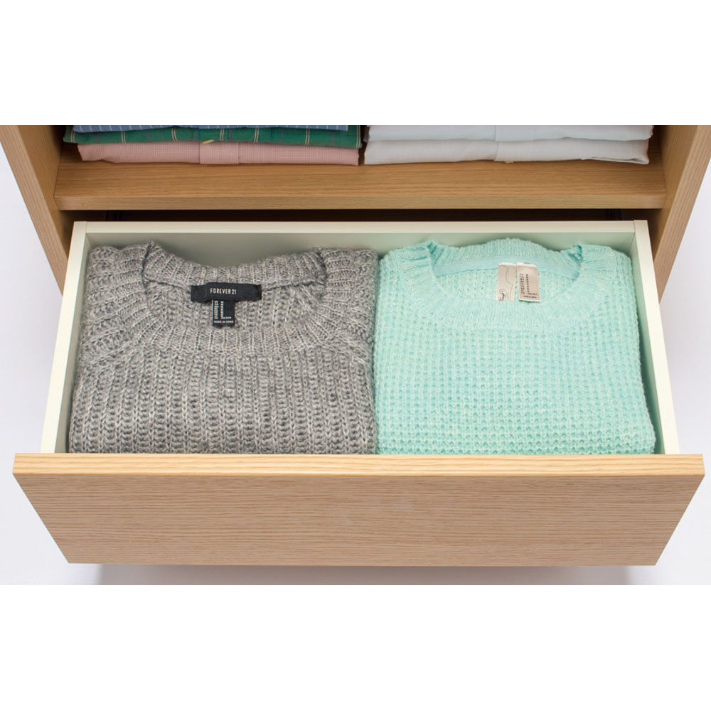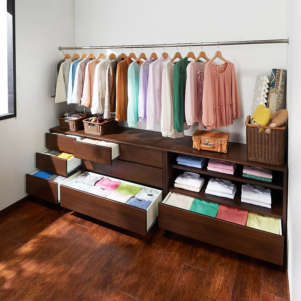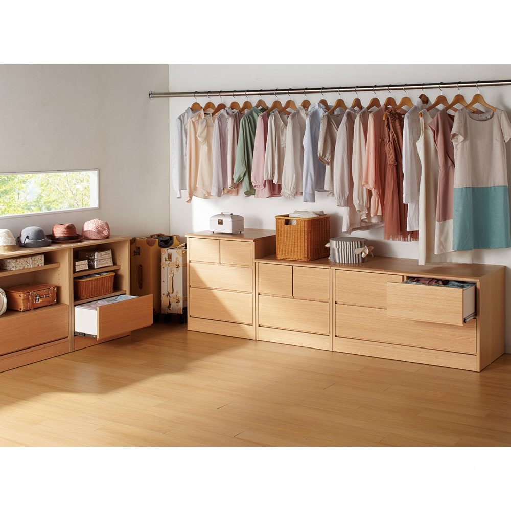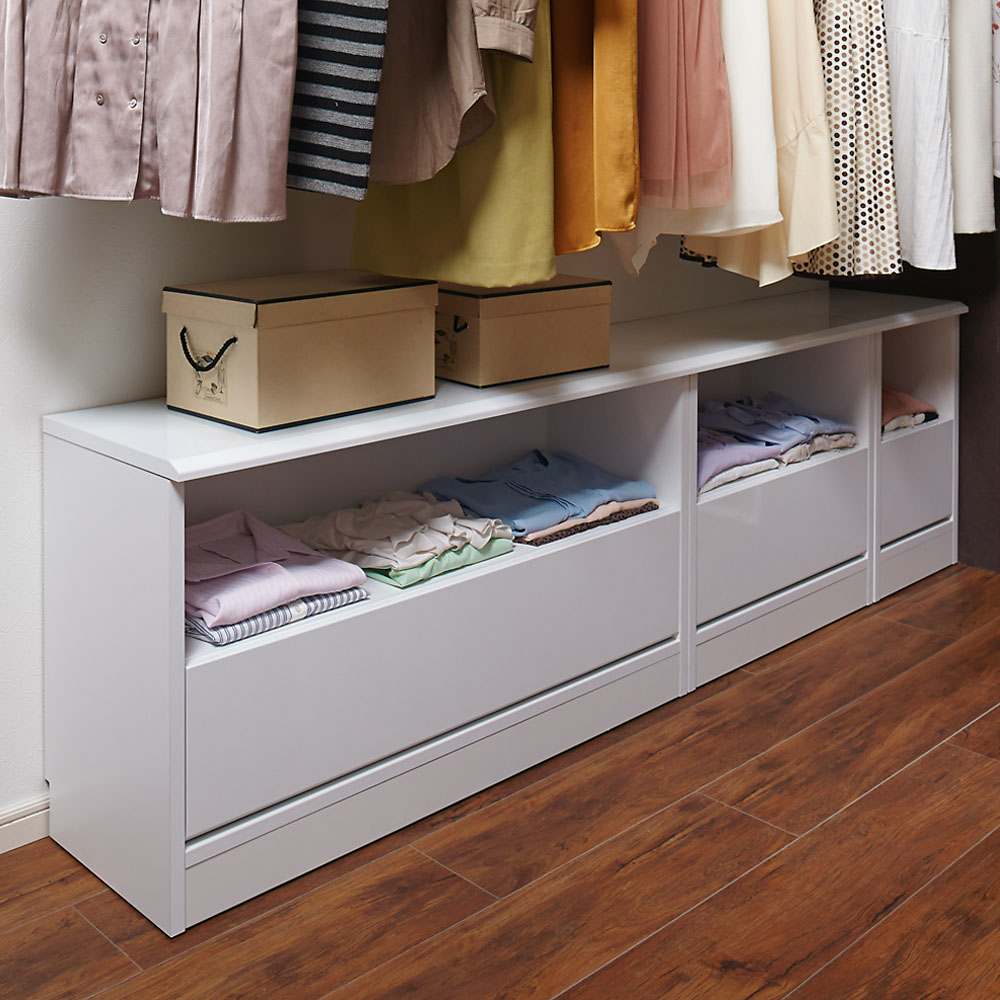 世界でただひとつ、ここはあなただけの衣装部屋。ウォークインクローゼットのハンガー下の空間を無駄なく有効活用。見た目に美しく機能的な収納システム。幅60・100の2サイズと幅29〜59cmオーダータイプを組み合わせれば、まるで作り付け家具のように収納スペースを創ることができるローチェスト。収納空間のクローゼット、ウォークインクローゼットを有効に使えていますか?備え付けのハンガーにたくさんの洋服がかかっていると思いますが、その下の空間はどうでしょうか。無造作に箱が積み重なっていたり、バッグが散らばっていたり、無駄に空間が空いていたりしていませんか?この商品は、そんな問題を解消できて、すっきり片付いた美しい収納空間を実現するための衣類収納家具です。このシリーズには、幅サイズ:29〜59cmサイズオーダー・60cm・100cm の3サイズ奥行:35cm・45cm・56cm の3サイズ高さ:58cm・72cm型:オープン収納&引き出しタイプ・フルスライドチェストタイプ以上36種類をご用意しております。さらに色は、ホワイト、ライトナチュラル、ダークブラウンの3色ご用意。設置スペースのサイズ、床や扉や壁の色に合わせて自由にお選びいただけます。ハンガー下の空間にぴったり収まった棚&引き出し収納を創り、誰でも整理しやすく、美しさを持続できるクローゼット収納を手に入れましょう。こちらは、幅100cm高さ58cm・72cm オープン棚&引き出しタイプです。・オープン棚は高さ58cmは1段・高さ78cmは2段、引き出し収納1段という構造です。オープン部に使用頻度の高いYシャツやTシャツ、バッグを、引き出しに嵩張る冬物などを整理するのにオススメです。・引き出しはストッパー付きフルスライドレール仕様で全開でます。収納物の出し入れがしやすいのが特長です。・奥行サイズを35・45・56cmから設置場所に合わせてお選びください。・同シリーズの幅29〜59cmオーダータイプ、幅60cmタイプと組み合わせるとハンガー下スペースにぴったり設置できます。