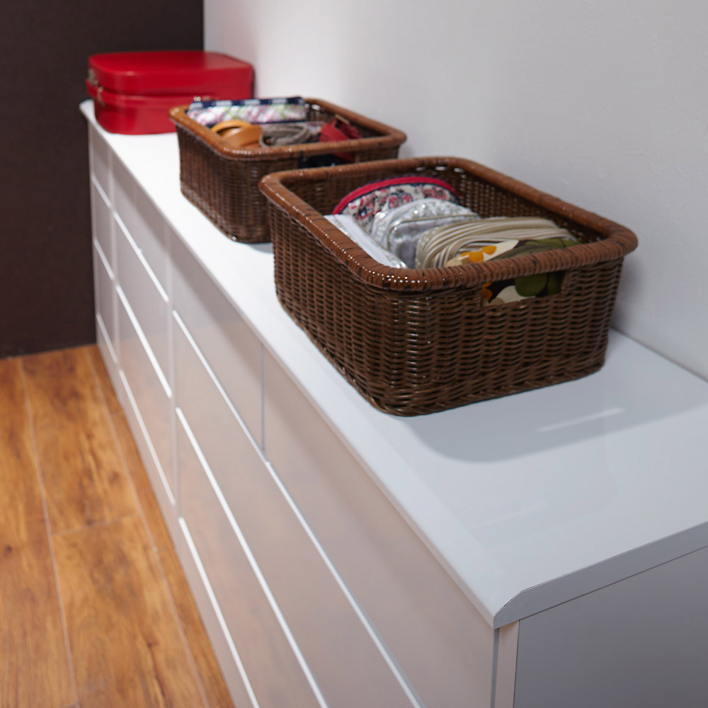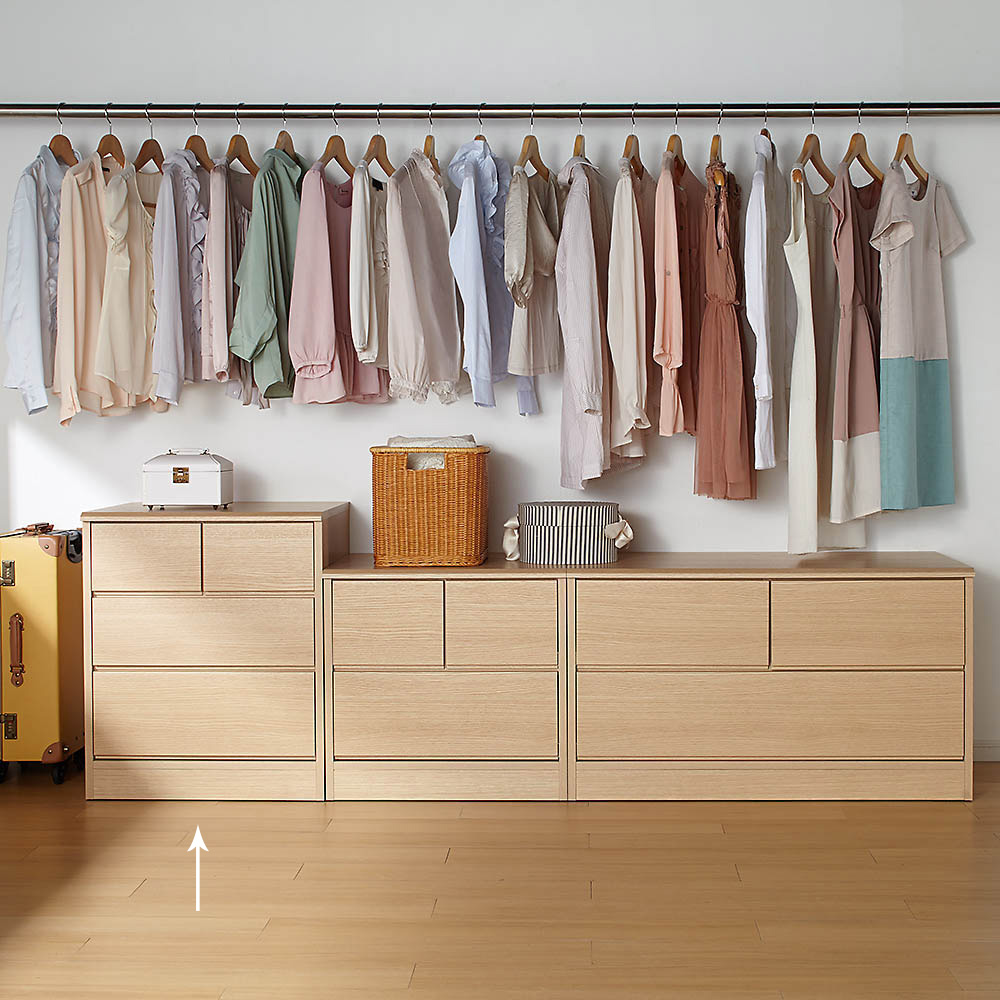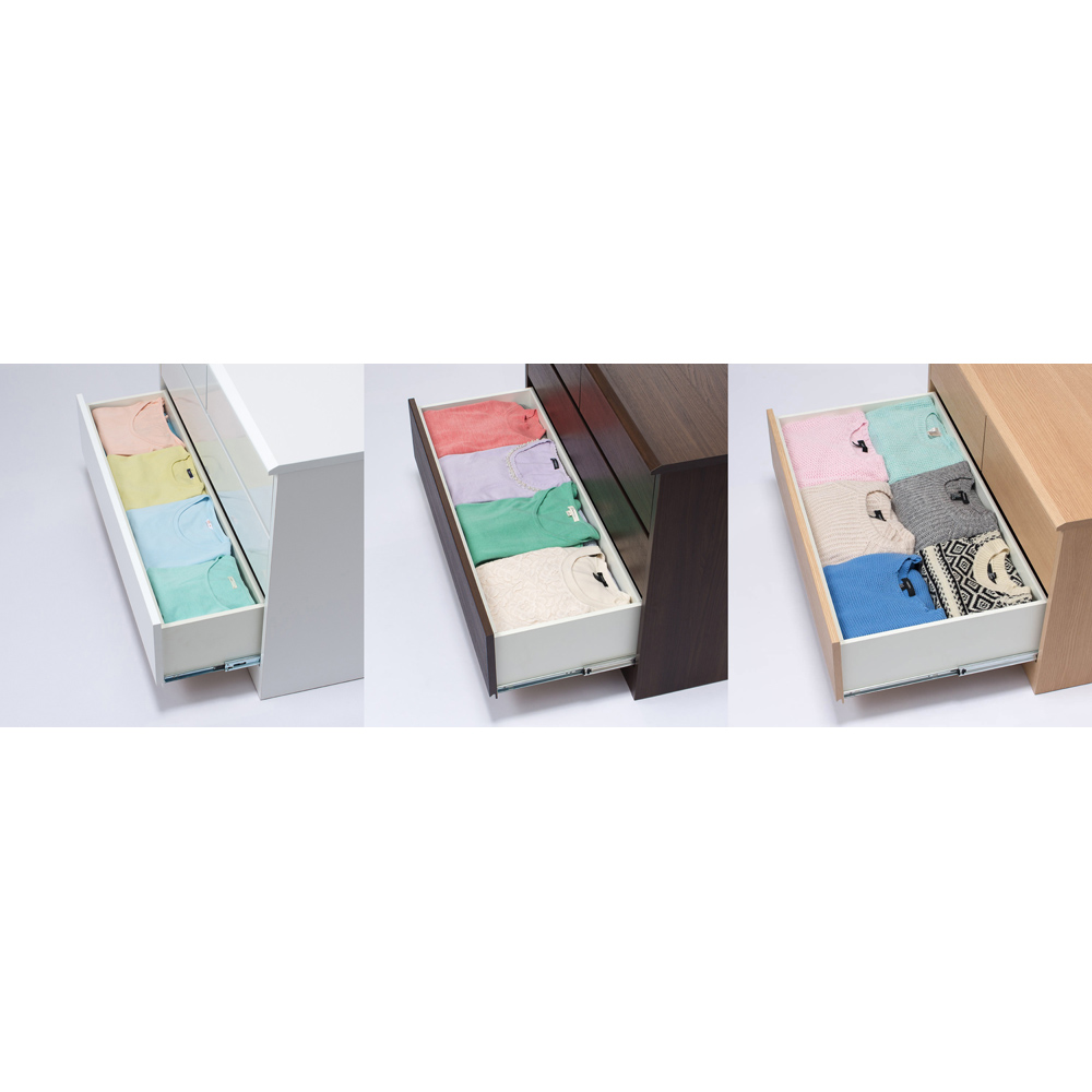 世界でただひとつ、ここはあなただけの衣装部屋。ウォークインクローゼットのハンガー下の空間を無駄なく有効活用。見た目に美しく機能的な収納システム。幅60・100の2サイズと幅29〜59cmオーダータイプを組み合わせれば、まるで作り付け家具のように収納スペースを創ることができるローチェスト。収納空間のクローゼット、ウォークインクローゼットを有効に使えていますか?備え付けのハンガーにたくさんの洋服がかかっていると思いますが、その下の空間はどうでしょうか。無造作に箱が積み重なっていたり、バッグが散らばっていたり、無駄に空間が空いていたりしていませんか?この商品は、そんな問題を解消できて、すっきり片付いた美しい収納空間を実現するための衣類収納家具です。このシリーズには、幅サイズ:29〜59cmサイズオーダー・60cm・100cm の3サイズ奥行:35cm・45cm・56cm の3サイズ高さ:58cm・72cm型:オープン収納&引き出しタイプ・フルスライドチェストタイプ以上36種類をご用意しております。さらに色は、ホワイト、ライトナチュラル、ダークブラウンの3色ご用意。設置スペースのサイズ、床や扉や壁の色に合わせて自由にお選びいただけます。ハンガー下の空間にぴったり収まった棚&引き出し収納を創り、誰でも整理しやすく、美しさを持続できるクローゼット収納を手に入れましょう。こちらは、幅60cm高さ58cm・72cm フルスライドチェストタイプです。・高さ58cmは引き出し収納2段(上は小引き出し、下は大引き出し)、高さ72cmは引き出し収納3段(最上段は小引き出し、下2段は大引き出し)という構造です。Tシャツやトレーナー、セーターはもちろんダウンジャケット、コートなどのかさばる冬物の収納にもオススメです。・引き出しはストッパー付きフルスライドレール仕様で全開でます。収納物の出し入れがしやすいのが特長です。・奥行サイズを35・45・56cmから設置場所に合わせてお選びください。・同シリーズの幅29〜59cmオーダータイプ、幅100cmタイプと組み合わせるとハンガー下スペースにぴったり設置できます。