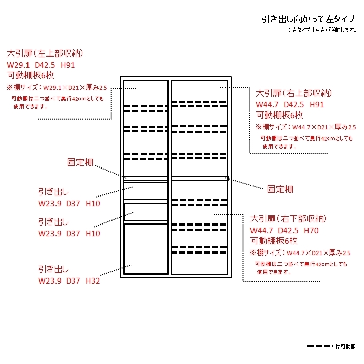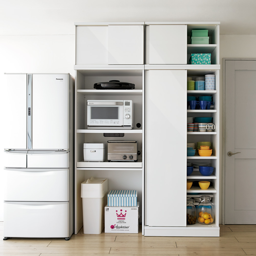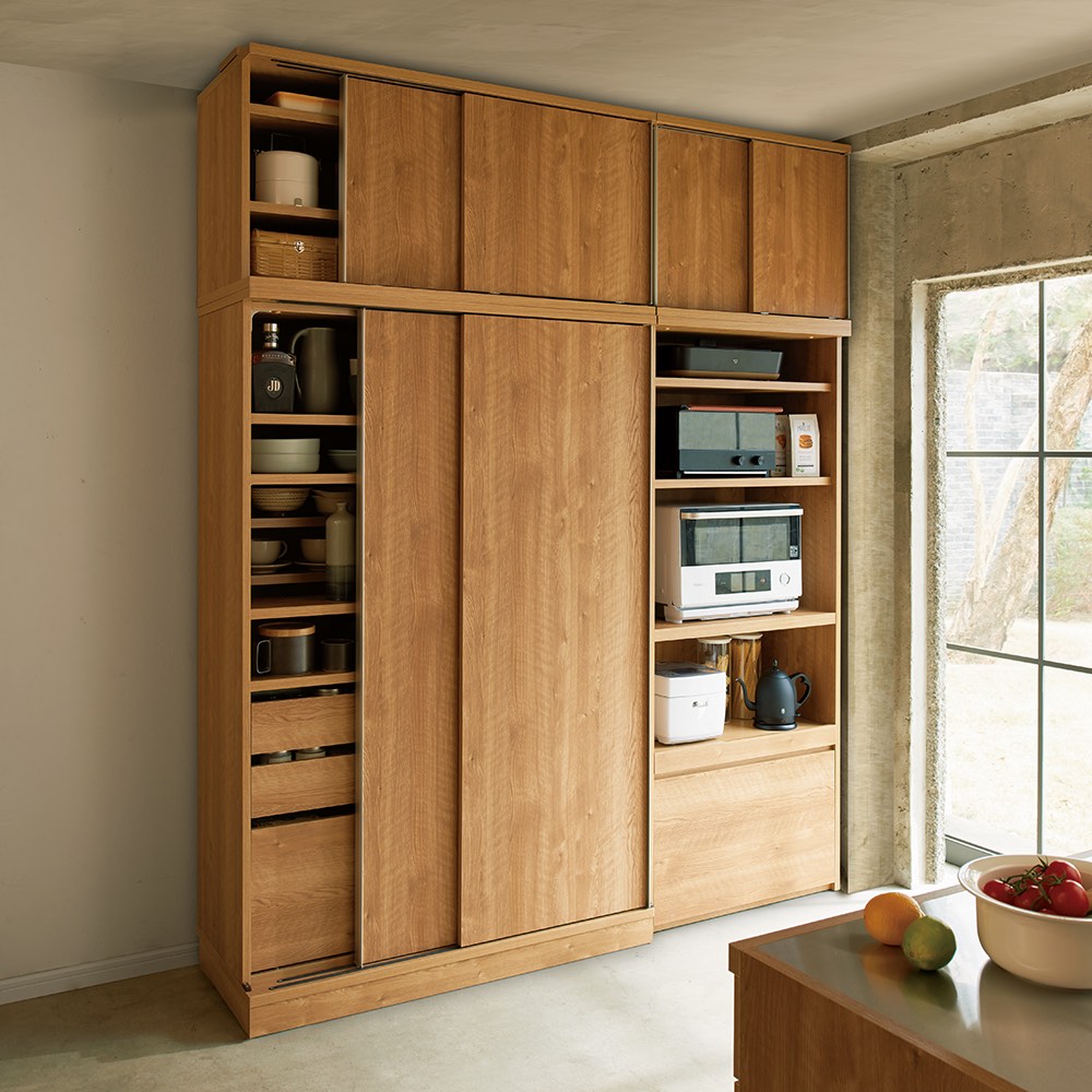キッチンをリフォーム気分で収納力アップできる収納庫。限られた空間で効率よく収納する工夫と、開閉スペース不要な引き戸式。憧れのパントリーをキッチン収納家具で実現して。食器までひとまとめにすっきり収納。リフォームみたいにキッチンすっきり!引き戸式パントリー食器棚シリーズどんなにキレイにしていても雑多な雰囲気がどうしても拭えないキッチン周り。そんなダイニングキッチンをあっという間にすっきり空間に変えるアイデア収納シリーズです。収納物の一覧性・管理のしやすさ・効率の良い収納力を考え設計された収納庫でまるでリフォームしたかのような無駄のない収納術でおしゃれなキッチンプランが完成します。開閉に幅を取らない引き戸式と、豊富なサイズ展開で狭いキッチンやオープンキッチンにもピッタリ。同シリーズの家電収納・家電台と組み合わせれば、キッチンに必要なものをひとまとめに管理できます。収納物の一覧性と省スペースを実現する、引き戸ダイニングボード◆開閉にスペースを取らない引き戸タイプなので、狭いスペースへの設置や扉をあけっぱなしにしての作業に適し他ダイニングボードです。◆大きな2枚の扉で大きく開けて中身をぱっと見渡せるので、在庫管理のしやすい食品ストッカーとして重宝します。◆引き戸には開閉滑らかなローラーを内蔵し、大きな扉でも軽い力で開け閉めできます。位置が選べる開け閉めしやすい、レール付き引き出しでキッチンストッカーにも◆大きな引き戸の中には3杯の引き出しを装備。こまごましたものを浅い引き出しに、重たいものを深引き出しに収納すれば出し入れも簡単なキッチンストッカーとしても。◆引き出しにはストッパー付きスライドレールを採用し、スムーズに開閉できます。◆引き出しの位置はご注文の際に向かって右側、左側のどちらかをお選びいただけます。間取りに合わせてお好きな位置をご選択ください。幅木カット付きで、壁にピッタリつけておしゃれなキッチンに。◆幅木カットのサイズは7.5cm×1.5cmで、一般的な家屋に対応するサイズです。天井までの隙間も収納に変える、専用上置きでたっぷり収納。◆天井高208cm〜272cmまでに対応。ご希望のお客様はシリーズ一覧をご確認ください。空間を有効活用できる『段違い棚』で無駄なくしまう、アイデア収納。◆引き戸の中のたなは段違い仕様。手前と奥でそれぞれ棚板の位置を設定できます。◆段違い棚は手前と奥で高さの違うものを収納しても、空間を無駄なく活用できます。◆高さの違う缶詰や瓶、食器もまとめて収納できる『食品庫』兼『食器棚』です。◆段違い棚は中身の一覧性も高いので、在庫の確認も簡単。買い忘れや、重複買いの予防にも。◆棚板1枚の耐荷重は5kg。棚板は全部で20枚セットされています。キッチンにふさわしい、お手入れ簡単なキッチン収納の秘密◆大きな引き戸の扉にはお手入れが簡単な素材『ピアフィール』を採用。◆艶やかで透明感のある光沢が美しいだけでなく、汚れをふき取りやすい素材です。安心と信頼の国内生産品のキッチンボード◆熟練の家具職人がひとつずつ丁寧に仕上げたワンランク上のカップボード・食器棚です。◆細部の丁寧な仕上がりなど、国産品ならではの高品質なキッチンボードを台所に置いてお楽しみください。