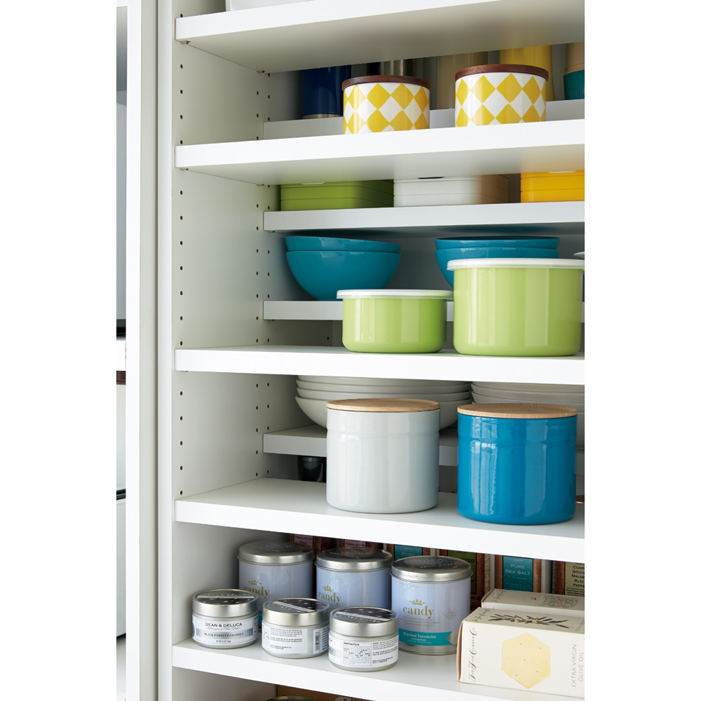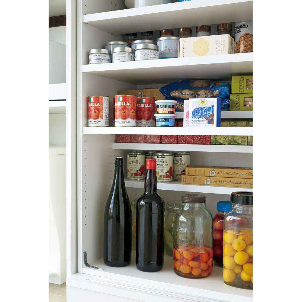 中身を一覧できる大きな引き戸と、限られた空間にたくさん収納する工夫で、憧れのパントリーを家具で実現。 ※扉を外して撮影しています。 ※写真は同シリーズ幅148cmです。
