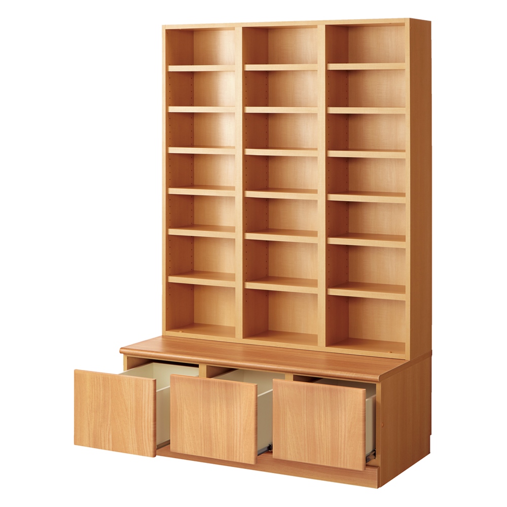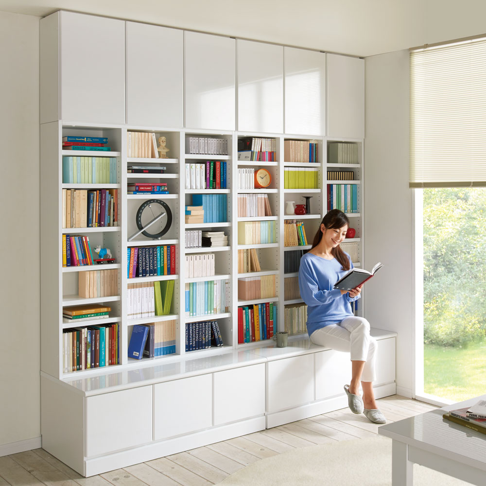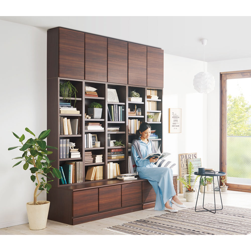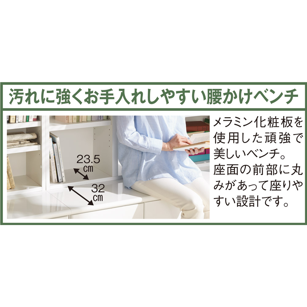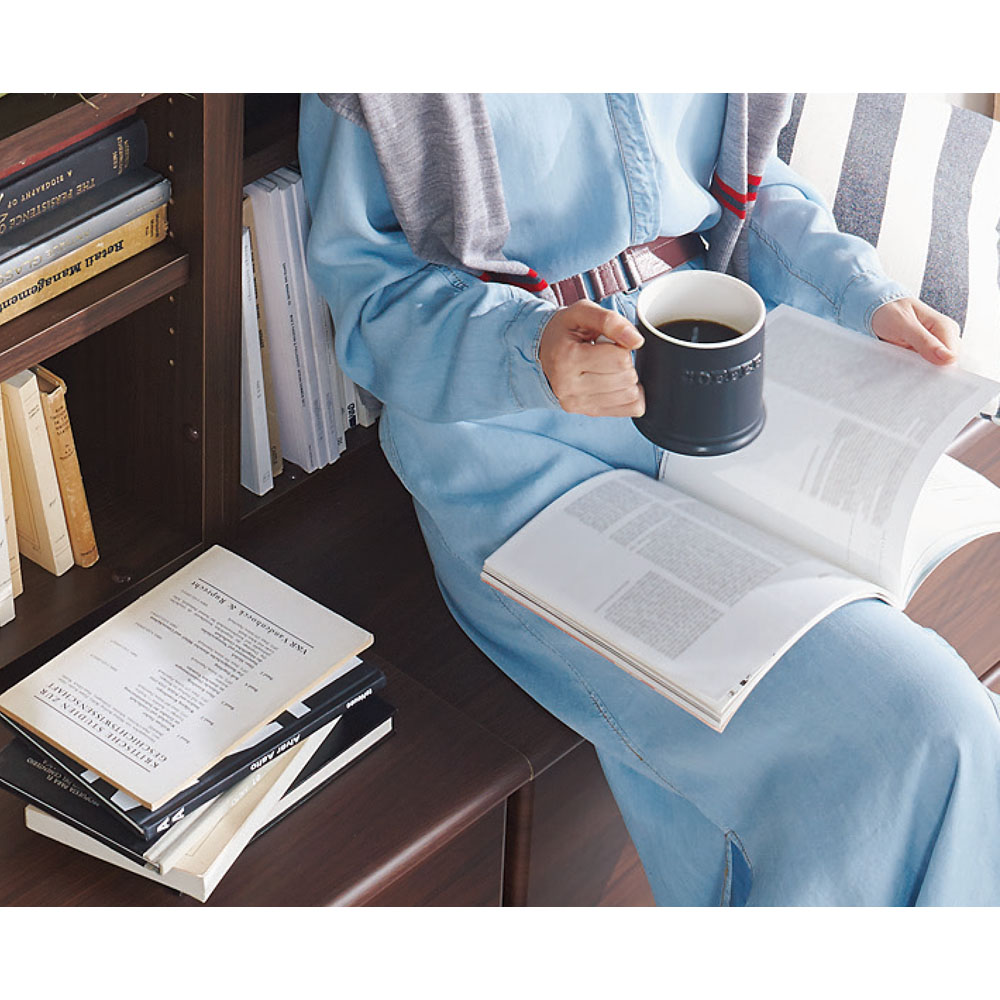 悠々とした贅沢時間に包まれる、至福のギャラリースタイル。ベンチ機能が付いた引き出し付き本棚で、新しいライフスタイルを楽しめます。別売りの高さサイズオーダー上置きを設置すると、造り付けのような高級感も。ディノス家具ロングセラーアイテムです。本棚とベンチが合体しました!時間を忘れるように、ゆったりとした気分で読書に没頭したい…そんな想いに応えるために企画した、収納ベンチ付き書棚のご紹介です。「頑丈な本棚」に「頑丈なベンチ」を組み合わせたことによって、『大量収納』+『その場読みできる機能性』を兼備。まるで本屋さんやブックカフェのような、ライブラリー空間を実現します。|座れる|ゆったりとほんと過ごすリッチなひととき。ベンチカフェが、毎日の特等席に。|飾れる|ベンチにはお気に入りの本を飾ってもオシャレ。最新号の指定席としても便利。|見つかる|棚板は幅が短く、全段3cm間隔可動式。分類しやすく検索性もアップ。★ココが違う★とにかく強度にこだわった【日本製】。大量収納するとたわみがちな棚板は、厚みを増した頑丈仕様。1枚1枚の棚幅もあえて短くしているので、ビッシリと収納いただけます。(本の平置きや雑貨をディスプレイしてもオシャレ!)もちろんベンチや引き出しもガッチリと安定感があるので、安心してご使用いただけます。≪日々の使いやすさを考えた細かな機能≫●ベンチに座りながらラクに本を探し読みできるので、検索性も高まります。●次の巻や号もすぐに取れ、高い所の出し入れにも便利。●ベンチ部は表紙を上向きにディスプレイして、かっこよくスタイリングすることも可能。●お気に入りの本や雑貨、オブジェを収納るディスプレイラックとしてもおすすめのオープンタイプ。●CDラック・DVDラックとしても大活躍。●安定感があり、圧迫感も少ないおしゃれなピアノ型のシルエットも、人気の理由の1つです。●ベンチの天板は丸みをもたせた優しい仕上げで、お手入れもしやすい素材です。●ベンチには引き出しが付いており、A4ファイルサイズに対応する高さ設計です。●ストッパー付きフルスライドレールで開閉もラクラク。●3cmピッチ可動棚板は、たわみにくい頑丈仕様で大量収納もお任せ。長くお使いいただけます。●幅木よけカットが施されており、壁にぴったりと設置が可能。●シリーズ商品の、高さオーダー突っ張り上置き収納庫と併せると、突っ張り壁面収納本棚として活躍。上品なたたずまいと、細部の使いやすさにこだわった「引き出し付きオープンラック書棚」。リビング収納やホームオフィス、子供部屋にもオススメの、ディノス家具ロングセラーアイテムです。ご愛用いただいているお客様コラムへ!