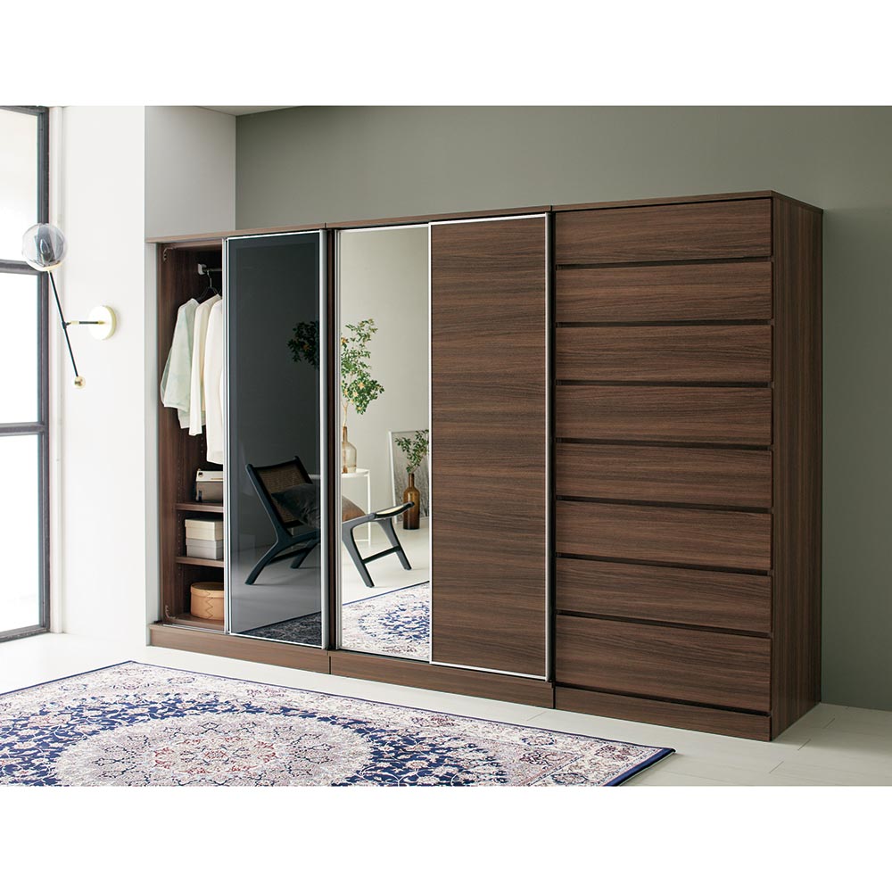 ダークブラウン色コーディネート例 ※写真は奥からガラス扉幅100.5cm、ミラー扉幅100.5cm、タワーチェストです