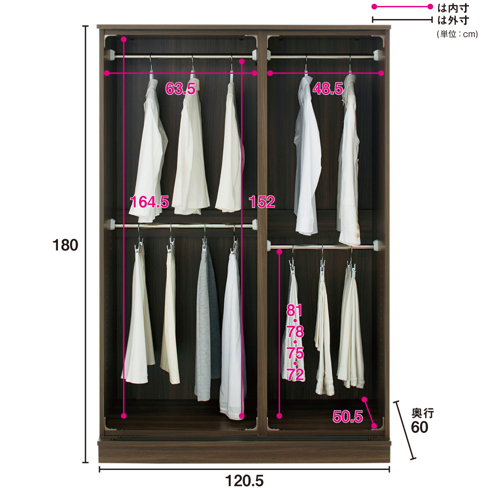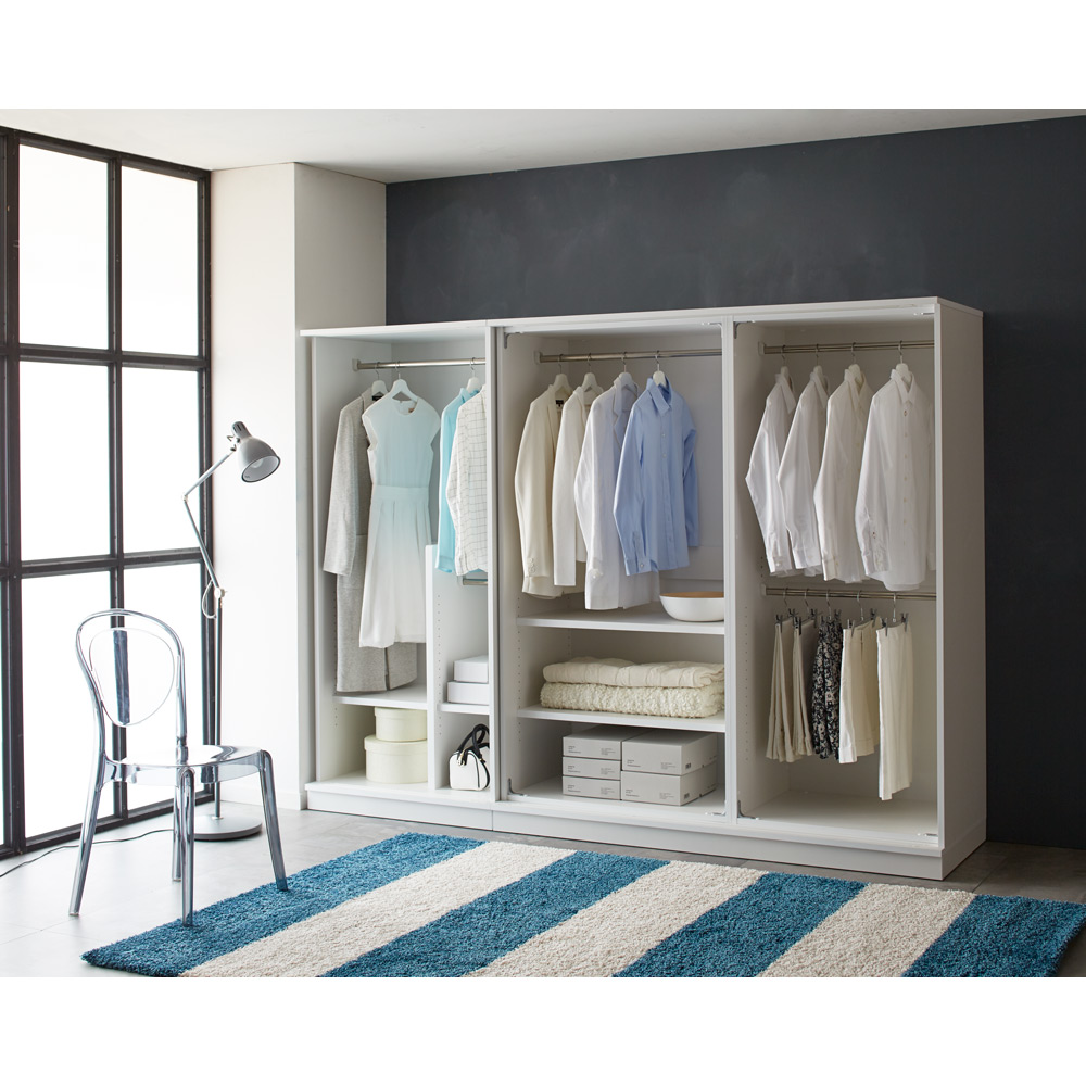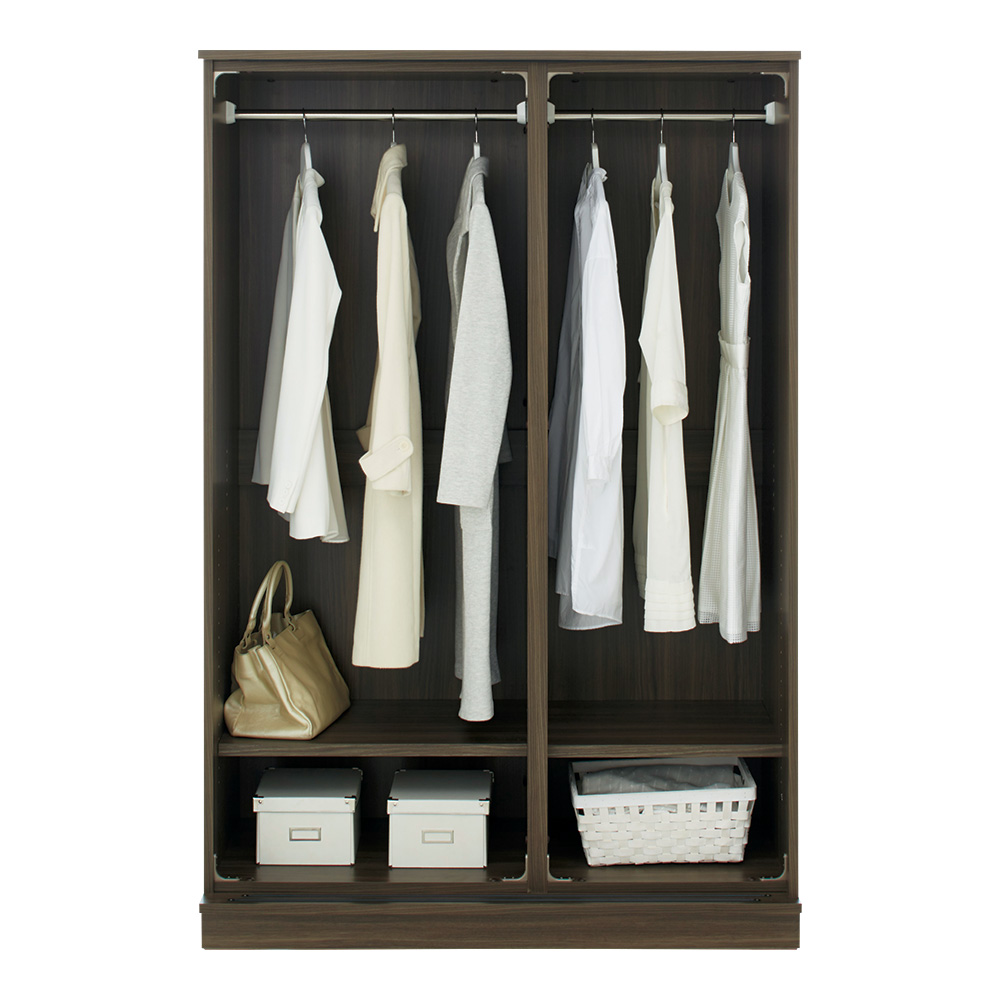 扉を外した内部の様子。ハンガー4本 内部はハンガーパイプのみのシンプル仕様で、収納の自由度を高めました。チェストや棚板をプラスすることで、収納物に合わせてお好みのスタイルにアレンジできます。
