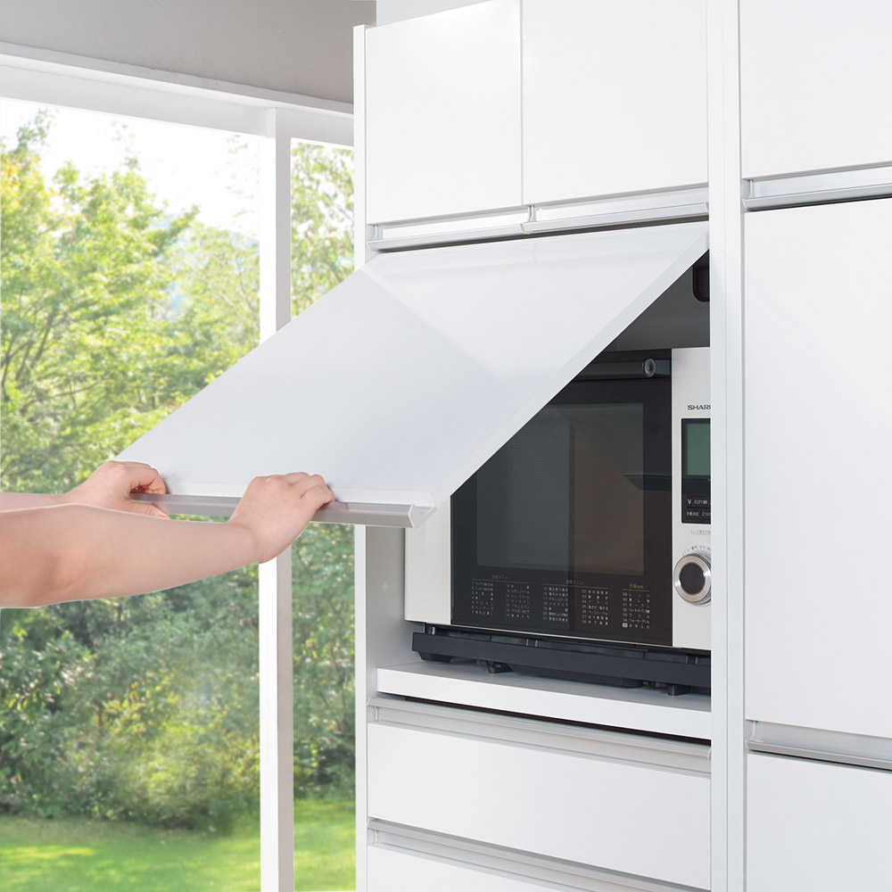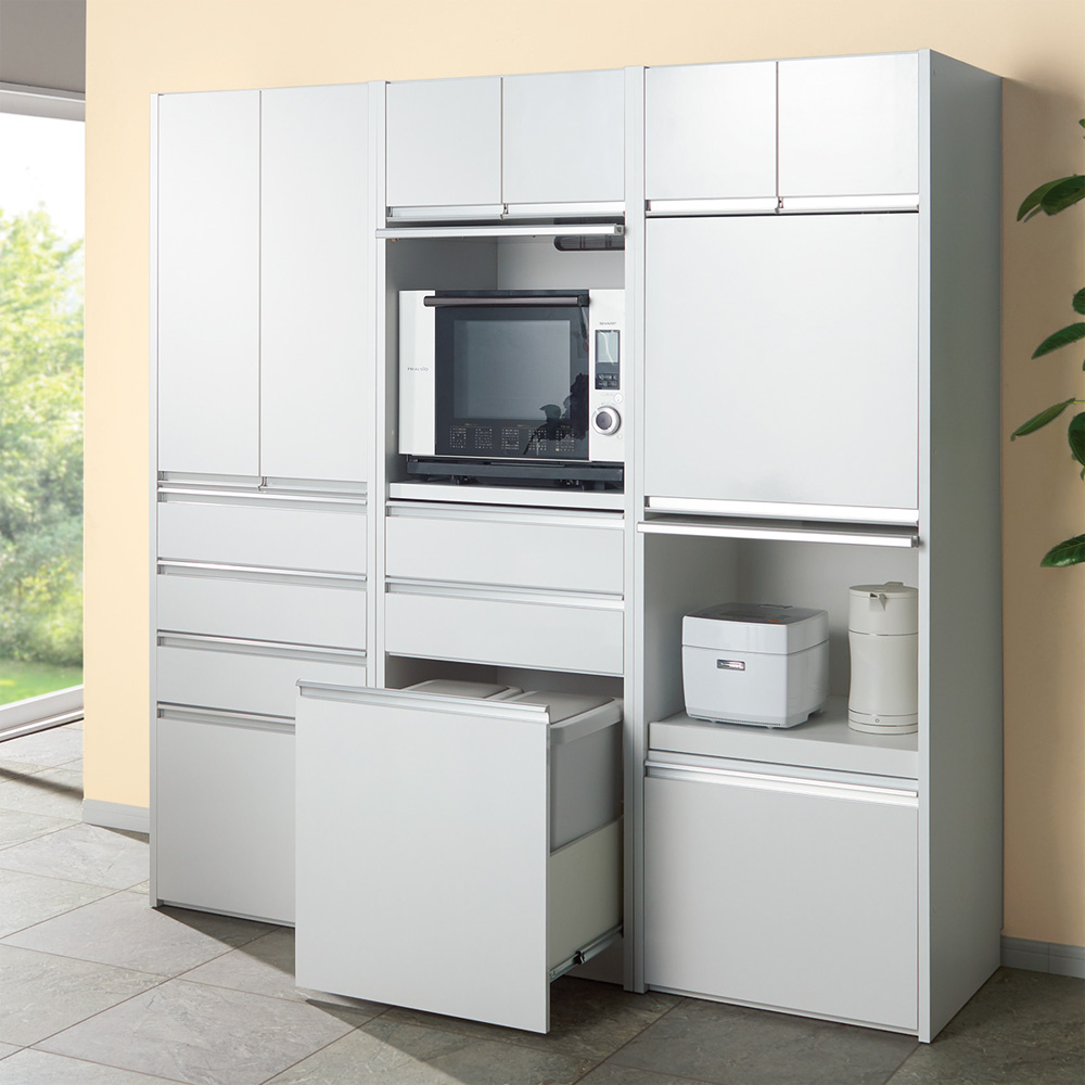 大型レンジも家電も簡単に扉で隠せるスタイリッシュキッチン収納シリーズ。アルミ製の取っ手や美しい前板などデザイン性にもこだわりました。ダストボックスが入るユニットが登場。大型レンジも家電も隠して美しくスタイリッシュ。ごちゃつきを簡単に扉で隠せるキッチン収納シリーズ。奥行があり大型電子レンジやスチームレンジも隠せます。キッチン家電や電子レンジを隠すと、お洒落な雰囲気に。シリーズの上置きは高さオーダー可能で作り付けのよう。細部までこだわり機能が満載の高機能シリーズです。大型レンジが隠せる扉付き。急な来客も安心■見せると隠す、相反する要素を兼ね備えたレンジ収納。■大きな家電も扉ですっぽり隠してすっきり。■家電を使用する際は扉を内部に収納。■開けたままにしておけるので調理もスムーズ。■どうしても散らかりがちなレンジ周りを目隠し。大型スチームレンジ対応。奥行内寸たっぷりで安心■スチームレンジは奥行が広く台に収まらないことも。■この家電ラックは天板部分の奥行が広い心強い家電台。■レンジラックでなくコーヒーメーカー・トースターも。■炊飯器・ホットプレート等のキッチン家電もぴったり。■狭い空間にキッチン家電をまとめて収納できます。ダストボックスも収まる大きな引出し付き◆下部に大きな物もおさまる深引出しを設置しました。■お手持ちのごみ箱や別売りダストボックスが収納可能。■キッチンごみ箱を隠すとより空間が片付いた印象に。開閉スムーズのフルスライドレール引出し■引出し全段にフルスライドレールを採用。■奥まで開閉スムーズで出し入れ楽々。■カトラリー・小皿などのキッチンアイテムも安心収納。■食品ストッカー・キッチンストッカーとして。水汚れに強い表面材を使用■前面には水汚れに強い強化紙を使用しています。■すっきりした圧迫感のないホワイトはキッチンの定番。■木目をリアルに再現したブラウンはシックな雰囲気。スムーズな家事のための細部のこだわり。■横に長く掴みやすい取っ手は忙しい家事を意識し設計。■引出し内部はクリーンなホワイト調で収納物に配慮。■扉に耐震ラッチを装備、揺れを感知し自動でロック。■収納物の飛び出し・滑り落ちを防ぎます。巾木カット付きで壁ぴったり設置できるアイデア収納■薄型収納でも壁との間に無駄なスペースがあると残念。■7.5×1.5cmの巾木カットで壁ぴったりに設置。安心と信頼の職人技が光る国産のキッチン収納熟練の家具職人がひとつずつ丁寧に仕上げたワンランク上のダイニングボード・食器棚です。細部の丁寧な仕上がりなど日本製の高品質なキッチンボード・カップボードをお楽しみください。