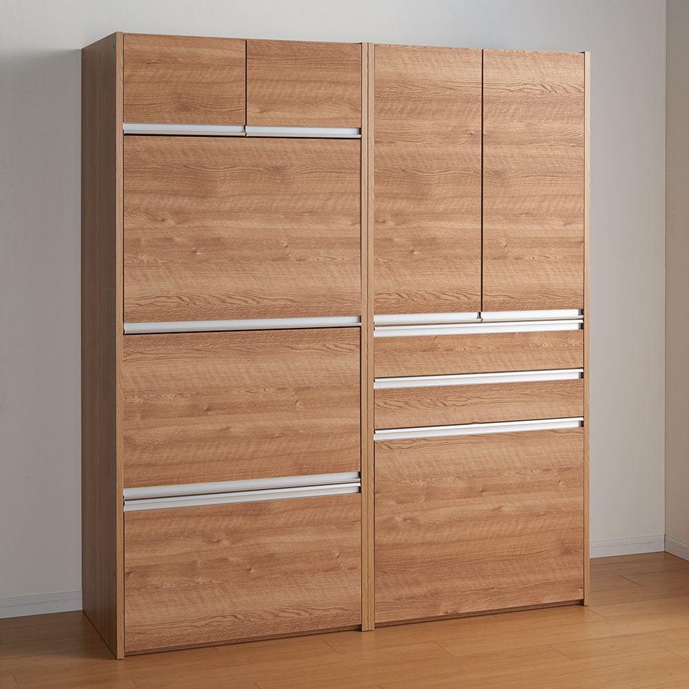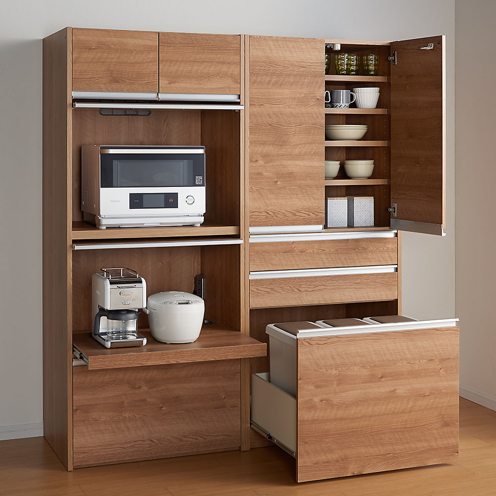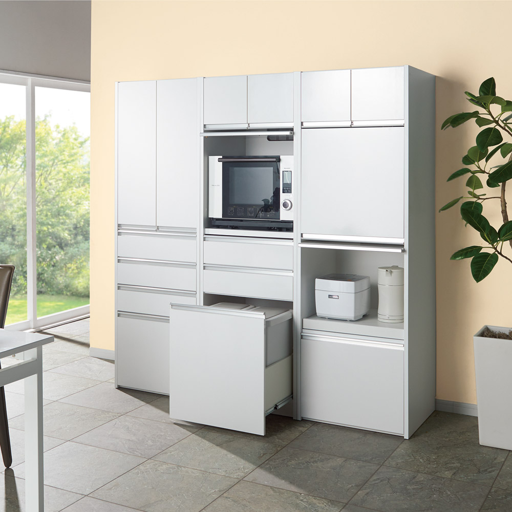 大型レンジも家電も簡単に扉で隠せるスタイリッシュキッチン収納シリーズ。アルミ製の取っ手や美しい前板などデザイン性にもこだわりました。ダストボックスが入るユニットが登場。大型レンジも家電も隠して美しくスタイリッシュ。ごちゃつきを簡単に扉で隠せるキッチン収納シリーズ。奥行があり大型電子レンジやスチームレンジも隠せます。キッチン家電や電子レンジを隠すと、お洒落な雰囲気に。シリーズの上置きは高さオーダー可能で作り付けのよう。細部までこだわり機能が満載の高機能シリーズです。ダストボックスも収まる大きな引出し付き◆下部に大きな物もおさまる深引出しを設置しました。■お手持ちのごみ箱や別売りダストボックスが収納可能。■キッチンごみ箱を隠すとより空間が片付いた印象に。開閉スムーズのフルスライドレール引出し■引出し全段にフルスライドレールを採用。■奥まで開閉スムーズで出し入れ楽々。■カトラリー・小皿などのキッチンアイテムも安心収納。■食品ストッカー・キッチンストッカーとして。水汚れに強い表面材を使用■前面には水汚れに強い強化紙を使用しています。■すっきりした圧迫感のないホワイトはキッチンの定番。■木目をリアルに再現したブラウンはシックな雰囲気。スムーズな家事のための細部のこだわり。■横に長く掴みやすい取っ手は忙しい家事を意識し設計。■引出し内部はクリーンなホワイト調で収納物に配慮。■扉に耐震ラッチを装備、揺れを感知し自動でロック。■収納物の飛び出し・滑り落ちを防ぎます。巾木カット付きで壁ぴったり設置できるアイデア収納■薄型収納でも壁との間に無駄なスペースがあると残念。■7.5×1.5cmの巾木カットで壁ぴったりに設置。安心と信頼の職人技が光る国産のキッチン収納熟練の家具職人がひとつずつ丁寧に仕上げたワンランク上のダイニングボード・食器棚です。細部の丁寧な仕上がりなど日本製の高品質なキッチンボード・カップボードをお楽しみください。