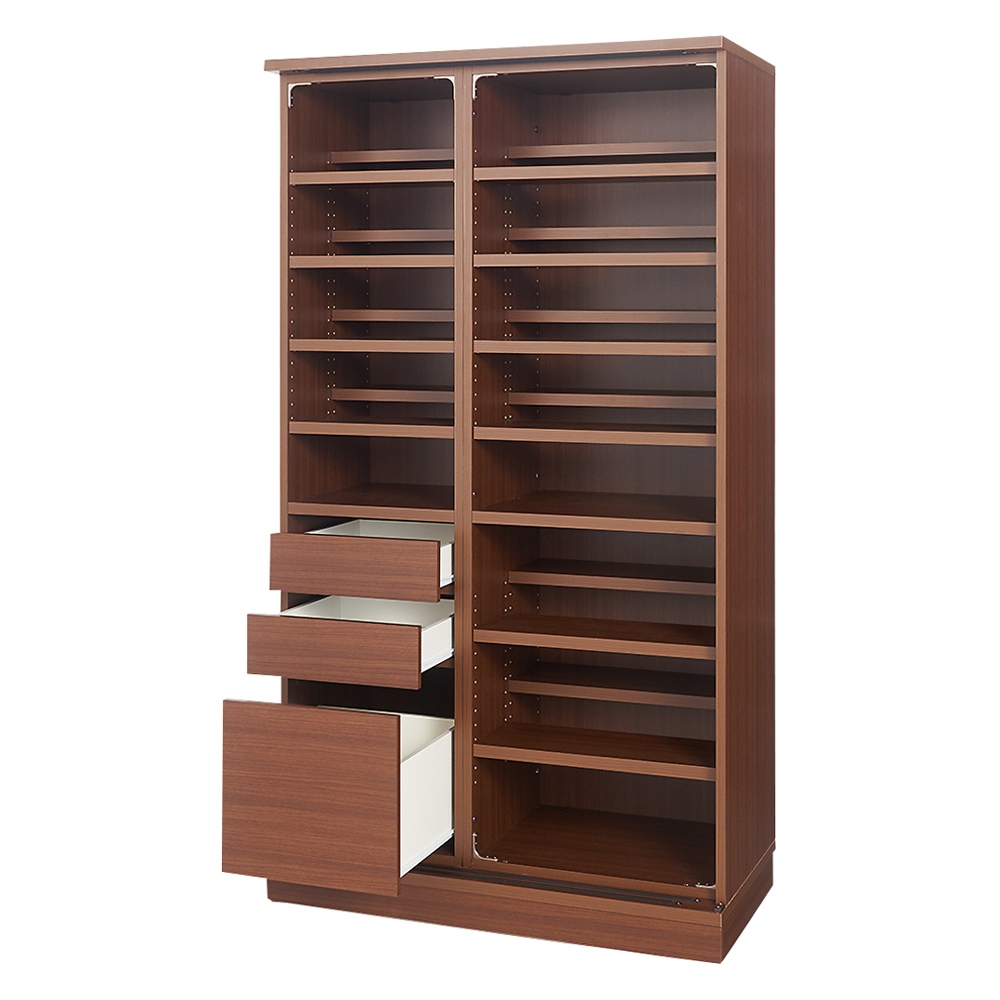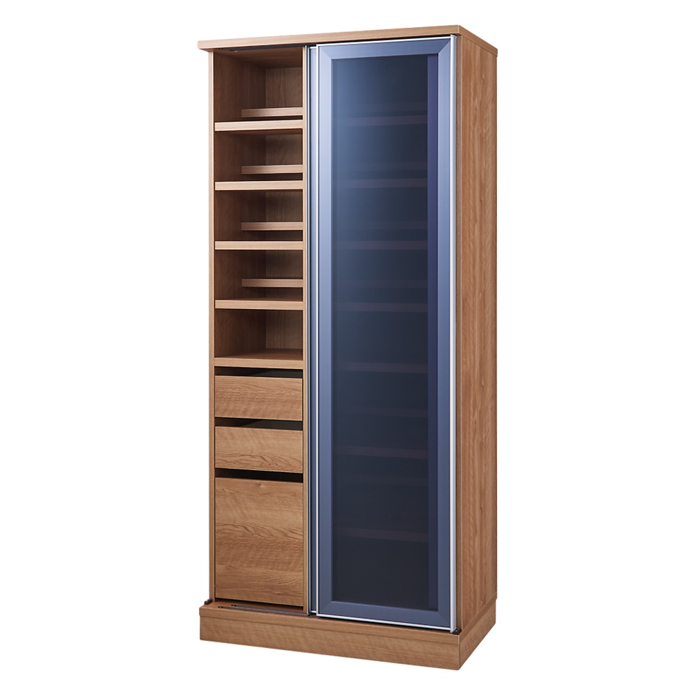 キッチンをリフォーム気分で収納力アップできる収納庫。限られた空間で効率よく収納する工夫と、開閉スペース不要な引き戸式。憧れのパントリーをキッチン収納家具で実現して。食器までひとまとめにすっきり収納。リフォームみたいにキッチンすっきり!引き戸式パントリー食器棚シリーズどんなにキレイにしていても雑多な雰囲気がどうしても拭えないキッチン周り。そんなダイニングキッチンをあっという間にすっきり空間に変えるアイデア収納シリーズです。収納物の一覧性・管理のしやすさ・効率の良い収納力を考え設計された収納庫でまるでリフォームしたかのような無駄のない収納術でおしゃれなキッチンプランが完成します。開閉に幅を取らない引き戸式と、豊富なサイズ展開で狭いキッチンやオープンキッチンにもピッタリ。同シリーズの家電収納・家電台と組み合わせれば、キッチンに必要なものをひとまとめに管理できます。収納物の一覧性と省スペースを実現する、引き戸ダイニングボード◆開閉にスペースを取らない引き戸タイプなので、狭いスペースへの設置や扉をあけっぱなしにしての作業に適し他ダイニングボードです。◆大きな2枚の扉で大きく開けて中身をぱっと見渡せるので、在庫管理のしやすい食品ストッカーとして重宝します。◆引き戸には開閉滑らかなローラーを内蔵し、大きな扉でも軽い力で開け閉めできます。位置が選べる開け閉めしやすい、レール付き引き出しでキッチンストッカーにも◆大きな引き戸の中には3杯の引き出しを装備。こまごましたものを浅い引き出しに、重たいものを深引き出しに収納すれば出し入れも簡単なキッチンストッカーとしても。◆引き出しにはストッパー付きスライドレールを採用し、スムーズに開閉できます。◆引き出しの位置はご注文の際に向かって右側、左側のどちらかをお選びいただけます。間取りに合わせてお好きな位置をご選択ください。幅木カット付きで、壁にピッタリつけておしゃれなキッチンに。◆幅木カットのサイズは7.5cm×1.5cmで、一般的な家屋に対応するサイズです。天井までの隙間も収納に変える、専用上置きでたっぷり収納。◆天井高208cm〜272cmまでに対応。ご希望のお客様はシリーズ一覧をご確認ください。空間を有効活用できる『段違い棚』で無駄なくしまう、アイデア収納。◆引き戸の中のたなは段違い仕様。手前と奥でそれぞれ棚板の位置を設定できます。◆段違い棚は手前と奥で高さの違うものを収納しても、空間を無駄なく活用できます。◆高さの違う缶詰や瓶、食器もまとめて収納できる『食品庫』兼『食器棚』です。◆段違い棚は中身の一覧性も高いので、在庫の確認も簡単。買い忘れや、重複買いの予防にも。◆棚板1枚の耐荷重は5kg。棚板は全部で20枚セットされています。キッチンにふさわしい、お手入れ簡単なキッチン収納の秘密◆大きな引き戸の扉にはお手入れが簡単な素材『ピアフィール』を採用。◆艶やかで透明感のある光沢が美しいだけでなく、汚れをふき取りやすい素材です。安心と信頼の国内生産品のキッチンボード◆熟練の家具職人がひとつずつ丁寧に仕上げたワンランク上のカップボード・食器棚です。◆細部の丁寧な仕上がりなど、国産品ならではの高品質なキッチンボードを台所に置いてお楽しみください。