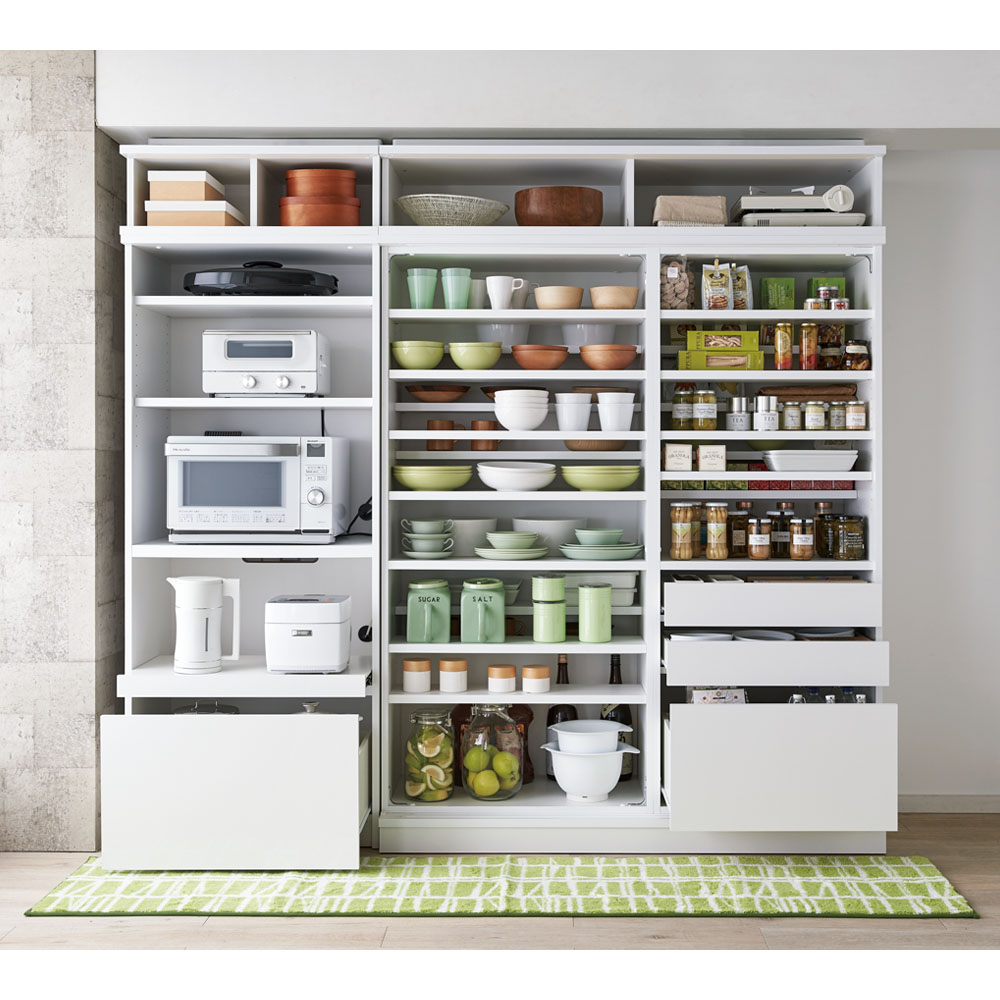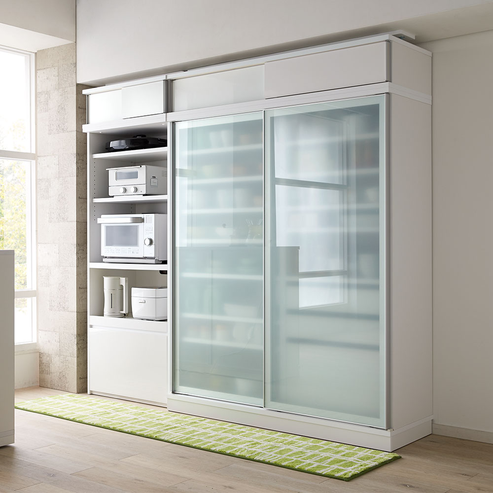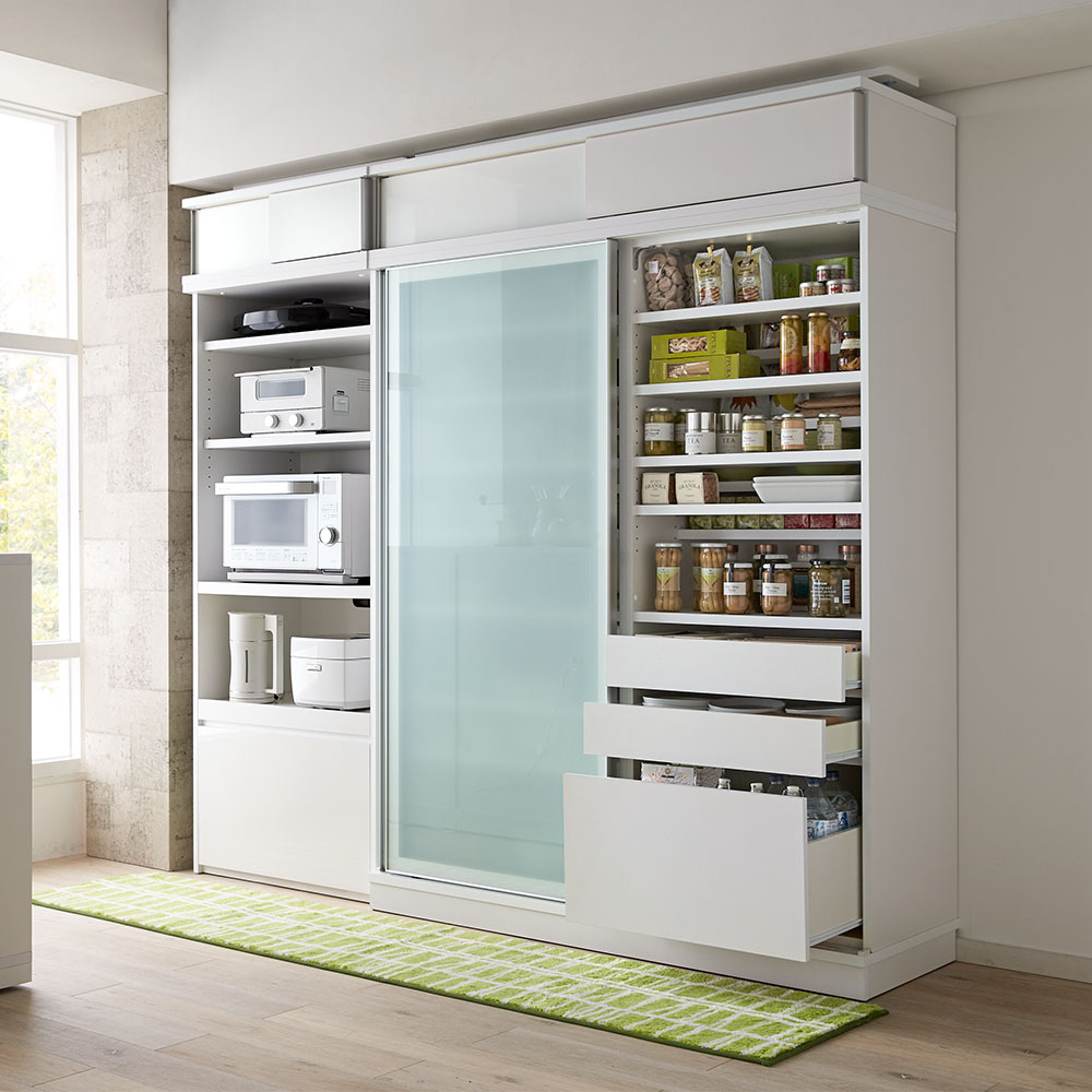 キッチンをリフォーム気分で収納力アップできる収納庫。限られた空間で効率よく収納する工夫と、開閉スペース不要な引き戸式。憧れのパントリーをキッチン収納家具で実現して。食器までひとまとめにすっきり収納。リフォームみたいにキッチンすっきり!引き戸式パントリー食器棚シリーズどんなにキレイにしていても雑多な雰囲気がどうしても拭えないキッチン周り。そんなダイニングキッチンをあっという間にすっきり空間に変えるアイデア収納シリーズです。収納物の一覧性・管理のしやすさ・効率の良い収納力を考え設計された収納庫でまるでリフォームしたかのような無駄のない収納術でおしゃれなキッチンプランが完成します。開閉に幅を取らない引き戸式と、豊富なサイズ展開で狭いキッチンやオープンキッチンにもピッタリ。同シリーズの家電収納・家電台と組み合わせれば、キッチンに必要なものをひとまとめに管理できます。収納物の一覧性と省スペースを実現する、引き戸ダイニングボード◆開閉にスペースを取らない引き戸タイプなので、狭いスペースへの設置や扉をあけっぱなしにしての作業に適し他ダイニングボードです。◆大きな2枚の扉で大きく開けて中身をぱっと見渡せるので、在庫管理のしやすい食品ストッカーとして重宝します。◆引き戸には開閉滑らかなローラーを内蔵し、大きな扉でも軽い力で開け閉めできます。位置が選べる開け閉めしやすい、レール付き引き出しでキッチンストッカーにも◆大きな引き戸の中には3杯の引き出しを装備。こまごましたものを浅い引き出しに、重たいものを深引き出しに収納すれば出し入れも簡単なキッチンストッカーとしても。◆引き出しにはストッパー付きスライドレールを採用し、スムーズに開閉できます。◆引き出しの位置はご注文の際に向かって右側、左側のどちらかをお選びいただけます。間取りに合わせてお好きな位置をご選択ください。幅木カット付きで、壁にピッタリつけておしゃれなキッチンに。◆幅木カットのサイズは7.5cm×1.5cmで、一般的な家屋に対応するサイズです。天井までの隙間も収納に変える、専用上置きでたっぷり収納。◆天井高208cm〜272cmまでに対応。ご希望のお客様はシリーズ一覧をご確認ください。空間を有効活用できる『段違い棚』で無駄なくしまう、アイデア収納。◆引き戸の中のたなは段違い仕様。手前と奥でそれぞれ棚板の位置を設定できます。◆段違い棚は手前と奥で高さの違うものを収納しても、空間を無駄なく活用できます。◆高さの違う缶詰や瓶、食器もまとめて収納できる『食品庫』兼『食器棚』です。◆段違い棚は中身の一覧性も高いので、在庫の確認も簡単。買い忘れや、重複買いの予防にも。◆棚板1枚の耐荷重は5kg。棚板は全部で20枚セットされています。キッチンにふさわしい、お手入れ簡単なキッチン収納の秘密◆大きな引き戸の扉にはお手入れが簡単な素材『ピアフィール』を採用。◆艶やかで透明感のある光沢が美しいだけでなく、汚れをふき取りやすい素材です。安心と信頼の国内生産品のキッチンボード◆熟練の家具職人がひとつずつ丁寧に仕上げたワンランク上のカップボード・食器棚です。◆細部の丁寧な仕上がりなど、国産品ならではの高品質なキッチンボードを台所に置いてお楽しみください。