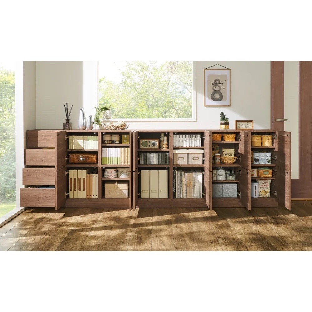 端正なスクエアデザインでお部屋に高級感を添えるカウンター下収納庫。整理整頓された空間を作り出す、正方形デザインの収納庫◆モダンな印象のスクエア扉がおしゃれなカウンター下収納です。◆リビングやダイニングの生活感を隠すことができます。◆薄型でコンパクトなのでベッドルームの本棚や玄関、廊下収納としてもおすすめです。使い勝手にこだわった機能性◆扉はプッシュオープン式で開け閉めスムーズ。◆(ア)(イ)前面は美しい光沢素材でお手入れも簡単です。(ウ)は摩擦に強く、傷が目立ちにくいため、美しい表情を長く保ちます。◆コンパクトな奥行でもたっぷりの収納力。◆収納棚は3cm間隔5段階で高さ調節可能。◆本や食器、食品ストックの収納にも便利です。選べる2サイズの奥行設計◆奥行29cmは薄型で狭い場所でも圧迫感を軽減。デッドスペースを収納として活用できます。◆奥行34cmはスリムなサイズと収納力を両立。キッチン収納やリビング収納におすすめです。シックで温かみのある3色の木目柄お部屋のインテリアに合わせてお選びいただける人気の3色をご用意しました。(ア)ホワイト 繊細な白い木目模様が、お部屋に美しく溶け込みます。(イ)ブラック シックでモダンな黒の輝きで、ワンランク上のおしゃれなリビングルームに。(ウ)ウォルナット 無垢のウォルナット材をリアルに表現した質感でどんなお部屋にも美しく調和します。