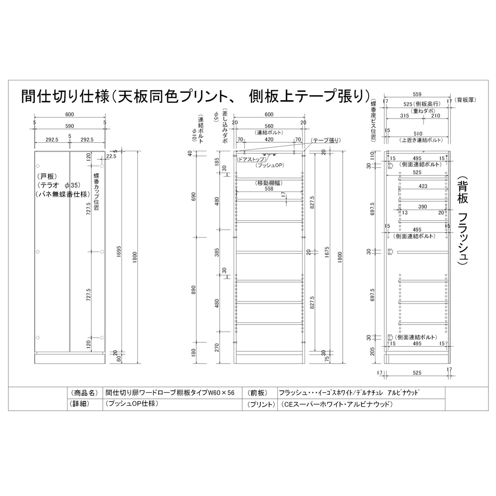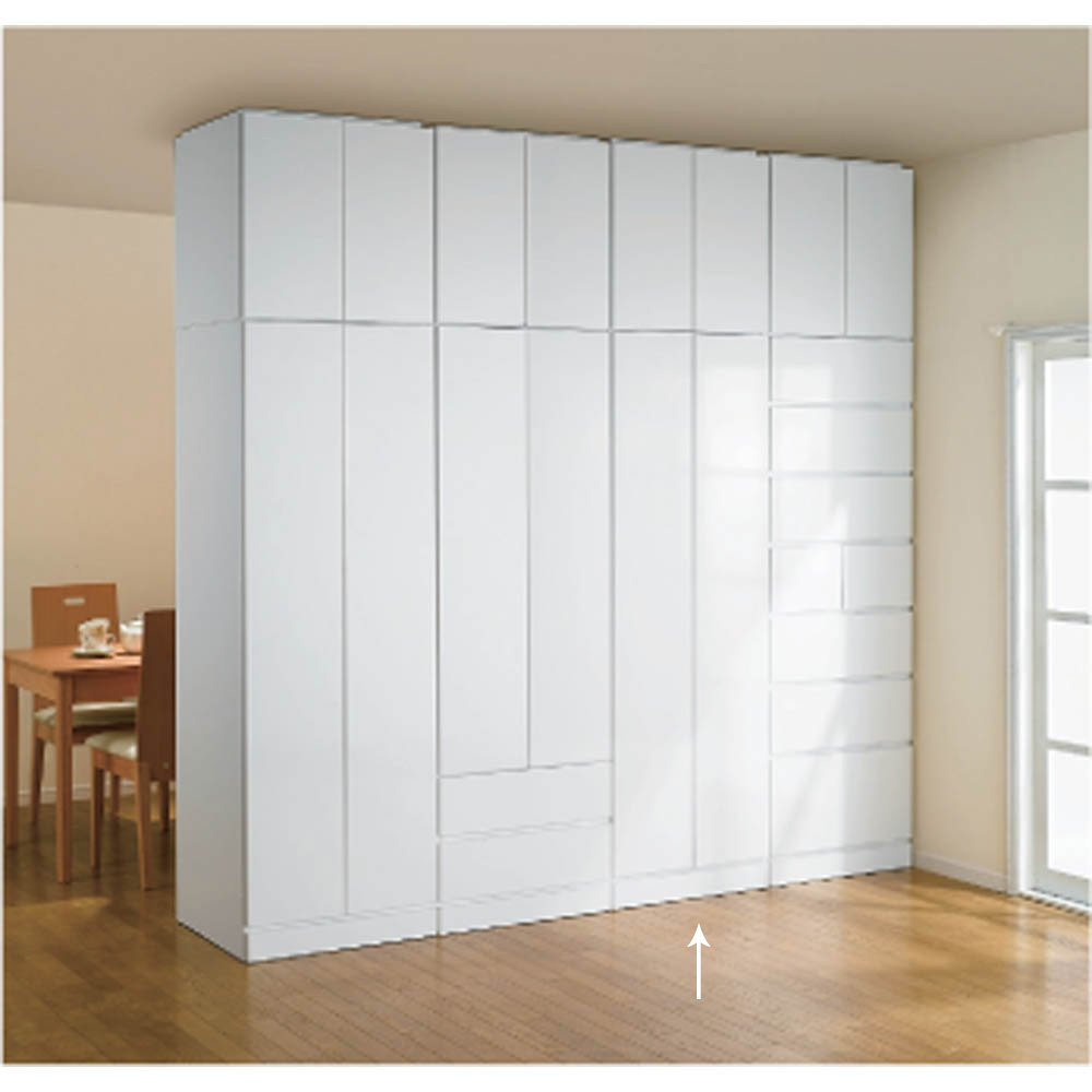 ワードローブ(クローゼットロッカー)と間仕切り機能の1台2役 間仕切り家具 ・裏面はすっきりした間仕切り壁面を活かせます ・表面は間仕切り収納方法はいろんなタイプから選べますまるで造りつけのような壁面間仕切りワードローブシリーズ。デザインも落ち着いた印象の木目の横柄と、高級感のある光沢ホワイトから選べます。空間を間仕切りながら、大容量収納まで叶えてくれる間仕切り収納。寝室やリビングルーム置いても使いやすく、様になるクローゼットハンガーです。【Check Point 1】高級感のある横目のダークブラウン木目柄。そして清潔感あふれる光沢仕様のホワイト色の壁面衣類収納。・お部屋のインテリアになじみやすい、落ち着いた印象のダークブラウン色の横目木目柄。建具に合わせてリビングルームでも、寝室、ウォークインクローゼットでも置き場所を選びません。・間仕切り仕様の背面も木パネルを貼り合わせた高級仕様。間仕切り家具として使用した場合でもしっかりと壁面になってくれます。・光沢感のある前板が美しいホワイト色は大きな家具でも圧迫感が少なく、お部屋を広く演出してくれます。【Check Point 2】収納物や使い勝手に応じて、8タイプ(+上置き)を自由に組み合わせてお使いいただけます。・商品の幅は60cmと80cmの2サイズをご用意致しました。・収納タイプも上下ハンガー2段・ブレザー(上段:ハンガー・下段:チェスト)・棚・タワーチェストの4タイプをご用意。・使う場所や収納物、収納量に応じてお好みで上置きもご購入できます。日本の住宅では上に収納力を伸ばすのが賢い選択です。【Check Point 3】取っ手のないシンプルデザイン、住宅事情を考えた機能、そしてワードローブとしての収納力を備えてます。・並べて置いてもすっきり見えるよう、取っ手のないプッシュ扉を採用しています。・扉の内側には防塵フラップがついているので、衣類へのほこりの付着を防ぎます。・上置きと本体はジョイントねじでしっかり連結できます。・タワーチェストは全段スライドレール付きなので、衣類の出し入れもラクラク。【Check Point 4】収納力をUPさせながら、本体をしっかりと固定する突っ張り式上置きが別売であります。・上置き(別売り)は1cm単位でオーダーできます。・上置きとの組合せ次第(高さの低いタイプと、高いタイプがあります)で天井高208〜272cmに対応。・上置きを使用すると壁面収納家具として収納力をさらにUPできます。