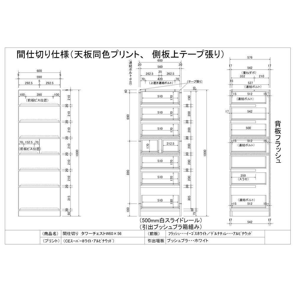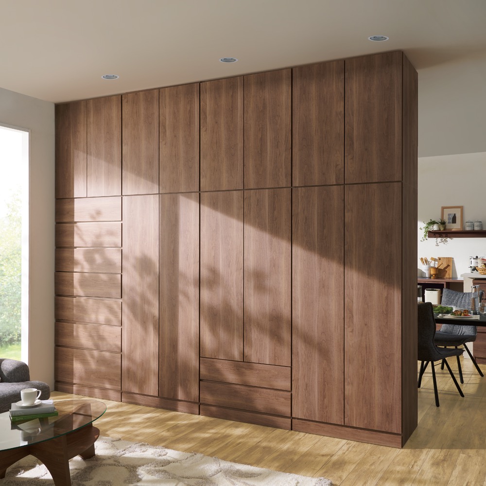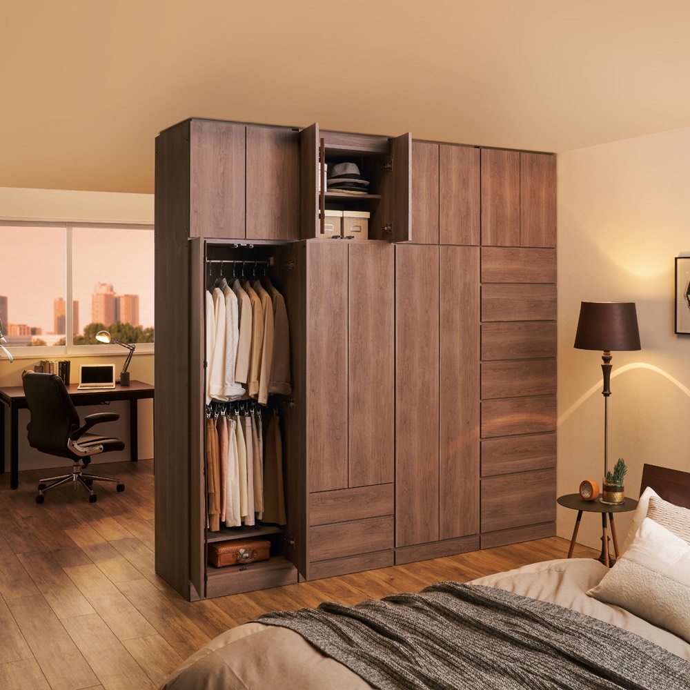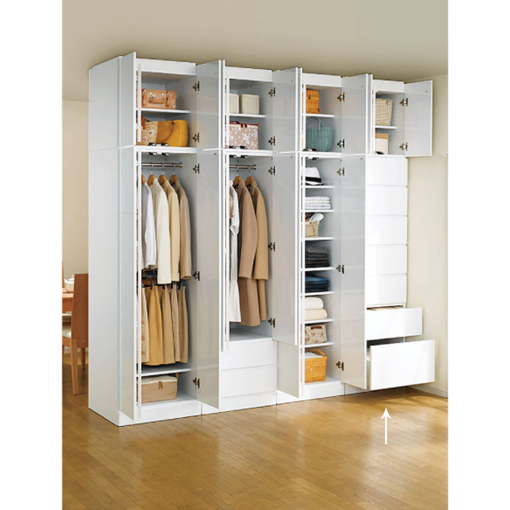 ワードローブ(クローゼットロッカー)と間仕切り機能の1台2役 間仕切り家具 ・裏面はすっきりした間仕切り壁面を活かせます ・表面は間仕切り収納方法はいろんなタイプから選べますまるで造りつけのような壁面間仕切りワードローブシリーズ。デザインも落ち着いた印象の木目の横柄と、高級感のある光沢ホワイトから選べます。空間を間仕切りながら、大容量収納まで叶えてくれる間仕切り収納。寝室やリビングルーム置いても使いやすく、様になるクローゼットハンガーです。【Check Point 1】高級感のある横目のダークブラウン木目柄。そして清潔感あふれる光沢仕様のホワイト色の壁面衣類収納。・お部屋のインテリアになじみやすい、落ち着いた印象のダークブラウン色の横目木目柄。建具に合わせてリビングルームでも、寝室、ウォークインクローゼットでも置き場所を選びません。・間仕切り仕様の背面も木パネルを貼り合わせた高級仕様。間仕切り家具として使用した場合でもしっかりと壁面になってくれます。・光沢感のある前板が美しいホワイト色は大きな家具でも圧迫感が少なく、お部屋を広く演出してくれます。【Check Point 2】収納物や使い勝手に応じて、8タイプ(+上置き)を自由に組み合わせてお使いいただけます。・商品の幅は60cmと80cmの2サイズをご用意致しました。・収納タイプも上下ハンガー2段・ブレザー(上段:ハンガー・下段:チェスト)・棚・タワーチェストの4タイプをご用意。・使う場所や収納物、収納量に応じてお好みで上置きもご購入できます。日本の住宅では上に収納力を伸ばすのが賢い選択です。【Check Point 3】取っ手のないシンプルデザイン、住宅事情を考えた機能、そしてワードローブとしての収納力を備えてます。・並べて置いてもすっきり見えるよう、取っ手のないプッシュ扉を採用しています。・扉の内側には防塵フラップがついているので、衣類へのほこりの付着を防ぎます。・上置きと本体はジョイントねじでしっかり連結できます。・タワーチェストは全段スライドレール付きなので、衣類の出し入れもラクラク。【Check Point 4】収納力をUPさせながら、本体をしっかりと固定する突っ張り式上置きが別売であります。・上置き(別売り)は1cm単位でオーダーできます。・上置きとの組合せ次第(高さの低いタイプと、高いタイプがあります)で天井高208〜272cmに対応。・上置きを使用すると壁面収納家具として収納力をさらにUPできます。