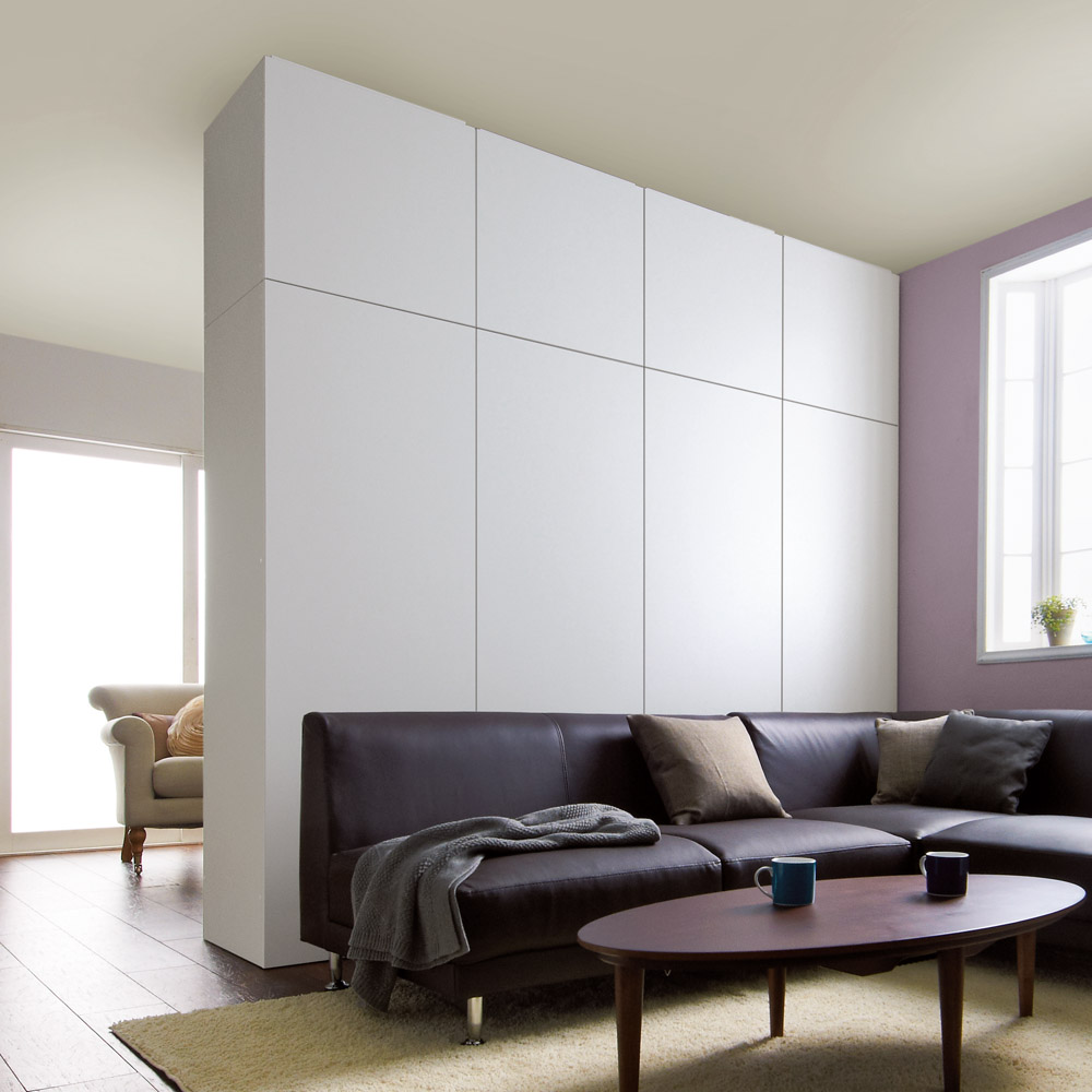 ワードローブ(クローゼットロッカー)と間仕切り機能の1台2役 間仕切り家具 ・裏面はすっきりした間仕切り壁面を活かせます ・表面は間仕切り収納方法はいろんなタイプから選べますまるで造りつけのような壁面間仕切りワードローブシリーズ。デザインも落ち着いた印象の木目の横柄と、高級感のある光沢ホワイトから選べます。空間を間仕切りながら、大容量収納まで叶えてくれる間仕切り収納。寝室やリビングルーム置いても使いやすく、様になるクローゼットハンガーです。【Check Point 1】高級感のある横目のダークブラウン木目柄。そして清潔感あふれる光沢仕様のホワイト色の壁面衣類収納。・お部屋のインテリアになじみやすい、落ち着いた印象のダークブラウン色の横目木目柄。建具に合わせてリビングルームでも、寝室、ウォークインクローゼットでも置き場所を選びません。・間仕切り仕様の背面も木パネルを貼り合わせた高級仕様。間仕切り家具として使用した場合でもしっかりと壁面になってくれます。・光沢感のある前板が美しいホワイト色は大きな家具でも圧迫感が少なく、お部屋を広く演出してくれます。【Check Point 2】収納物や使い勝手に応じて、8タイプ(+上置き)を自由に組み合わせてお使いいただけます。・商品の幅は60cmと80cmの2サイズをご用意致しました。・収納タイプも上下ハンガー2段・ブレザー(上段:ハンガー・下段:チェスト)・棚・タワーチェストの4タイプをご用意。・使う場所や収納物、収納量に応じてお好みで上置きもご購入できます。日本の住宅では上に収納力を伸ばすのが賢い選択です。【Check Point 3】取っ手のないシンプルデザイン、住宅事情を考えた機能、そしてワードローブとしての収納力を備えてます。・並べて置いてもすっきり見えるよう、取っ手のないプッシュ扉を採用しています。・扉の内側には防塵フラップがついているので、衣類へのほこりの付着を防ぎます。・上置きと本体はジョイントねじでしっかり連結できます。・タワーチェストは全段スライドレール付きなので、衣類の出し入れもラクラク。【Check Point 4】収納力をUPさせながら、本体をしっかりと固定する突っ張り式上置きが別売であります。・上置き(別売り)は1cm単位でオーダーできます。・上置きとの組合せ次第(高さの低いタイプと、高いタイプがあります)で天井高208〜272cmに対応。・上置きを使用すると壁面収納家具として収納力をさらにUPできます。