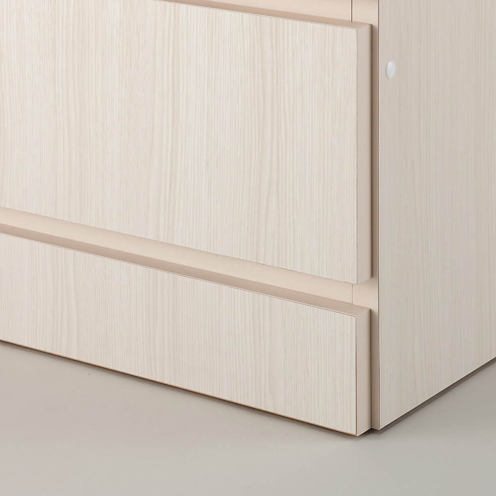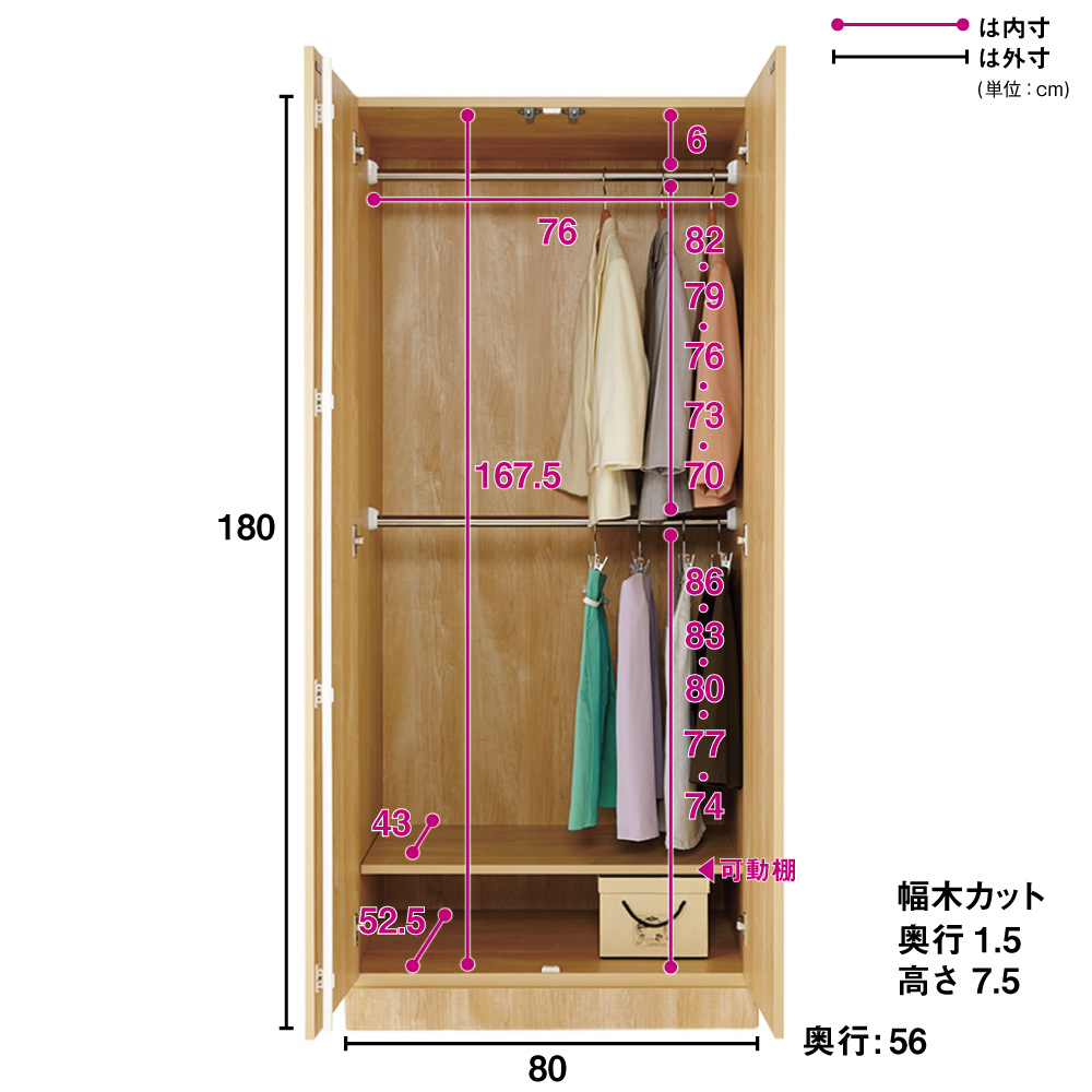 さまざまな部屋にマッチする自由自在のワードローブ。まるで備え付けのような上品で美しい定番ワードローブ。リビングや家事室、寝室などでも、たっぷりの収納力を発揮。突っ張り式の上置き(別売り)使用で天井までギッシリ収納スペースに!●【POINT1】収納物に応じて選べる全14タイプ幅は60cmと80cmの2タイプ、そして収納タイプも用途に応じてハンガー2段・ハンガー&引き出し・棚タイプ・タワーチェスト(+上置き)からお選びいただけます。《ハンガー2段》上段にシャツやジャケットを、下段にパンツやスカート類などを効率よく大量に収納することができます。下段ハンガーパイプ(3cmピッチ5段階可動式)は取り外し可能ですので、コートなどの丈の長い衣類も収納できます。可動棚板1枚付き。《ハンガー&引き出し》上の観音扉内にシャツやジャケットをハンガー掛けで、下の引き出しにTシャツやパンツ、下着類をたたんで効率よく収納することができます。《棚タイプ》パンツやTシャツ、タオルなどをたたんで収納したりバッグや帽子など並べて収納したり様々なアイテムを収納できます。3cm間隔で4枚の可動棚板を動かせますので、収納物に合わせてフレキシブルに対応できます。《タワーチェスト》引き出しは全段ストッパー付きスライドレールで収納時などはスムーズに開閉できます。下の段には普段頻繁に使用する衣類を、上の段にはオフシーズン衣類を収納すると便利です。上から1〜3段目と5・6段目は入れ替えができますので、簡単に衣替えができます。●【POINT2】お手入れがしやすく、どんなインテリアにも合わせやすい表面材色は3色をご用意。お部屋のインテリアや好みに応じてお選びいただけます。・ホワイト木目:うっすらと木目が見える癖のない色。お部屋を広く演出してくれます・ブラウン:スタイリッシュな空間を演出する天然木調の横木目柄・ナチュラル:北欧テイストにもピッタリ。まるで本物の木目のようなぬくもりがあります●【POINT3】使いやすいこだわりのポイントが随所に・扉はプッシュラッチ式で、ホコリの侵入を防ぐ防塵フラップ付きです。・幅木よけカットで壁面にぴったり設置できます。・床から扉の底辺までは約10cmの台輪付きなので、開閉時にラグなどを引きずることもありません。・突っ張り式上置き(別売)との組合せで天井高229〜255cmに突っ張ることができます