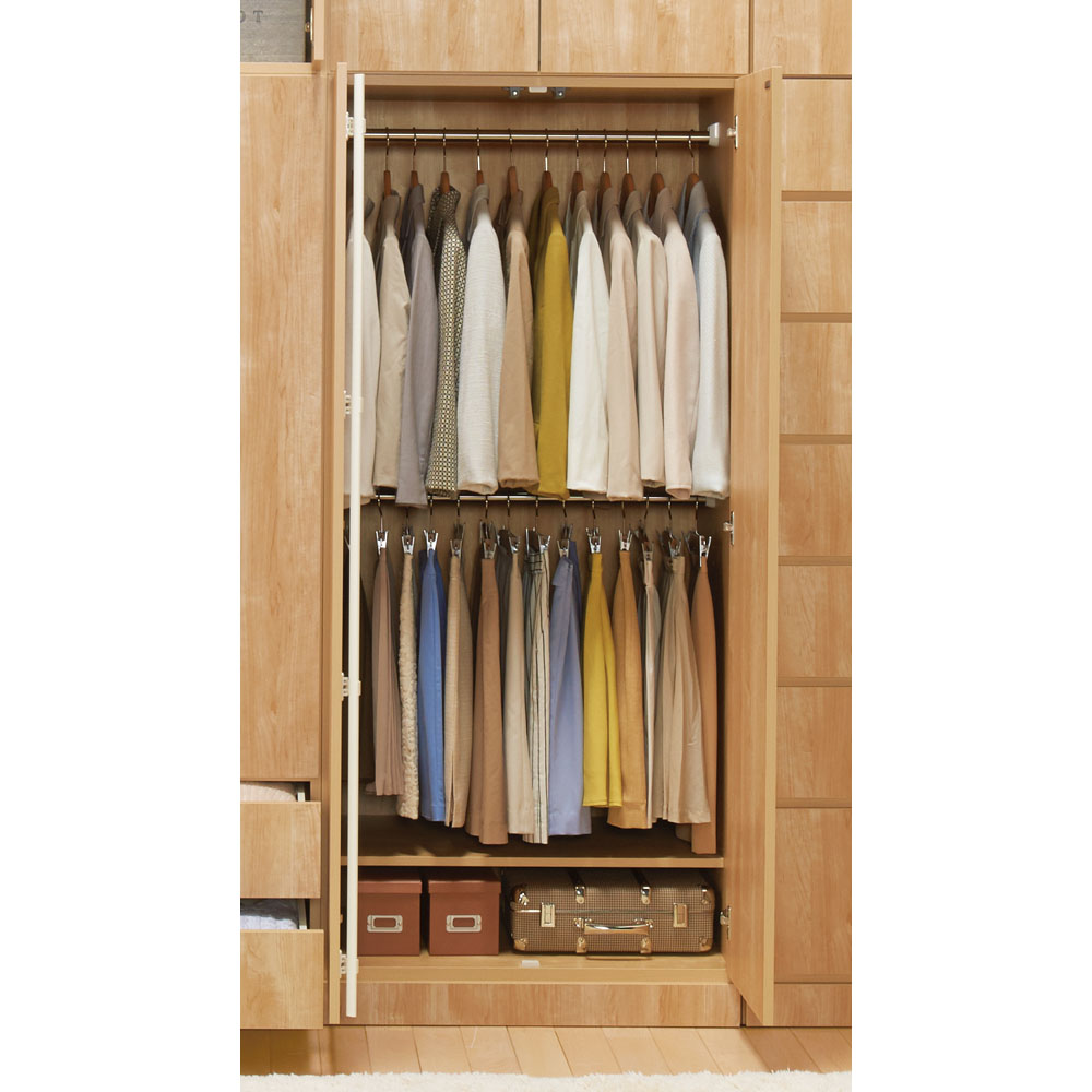 下段ハンガーパイプ(3cmピッチ5段階可動式)は取り外し可能ですので、コートなどの丈の長い衣類も収納できます。