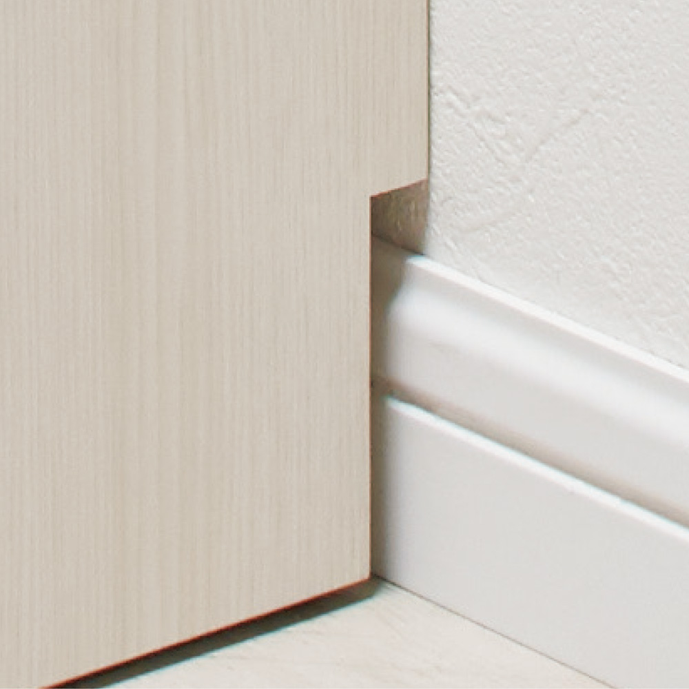 幅木をよけて壁ぴったりに設置できます。幅木カット(7.5×1.5cm)