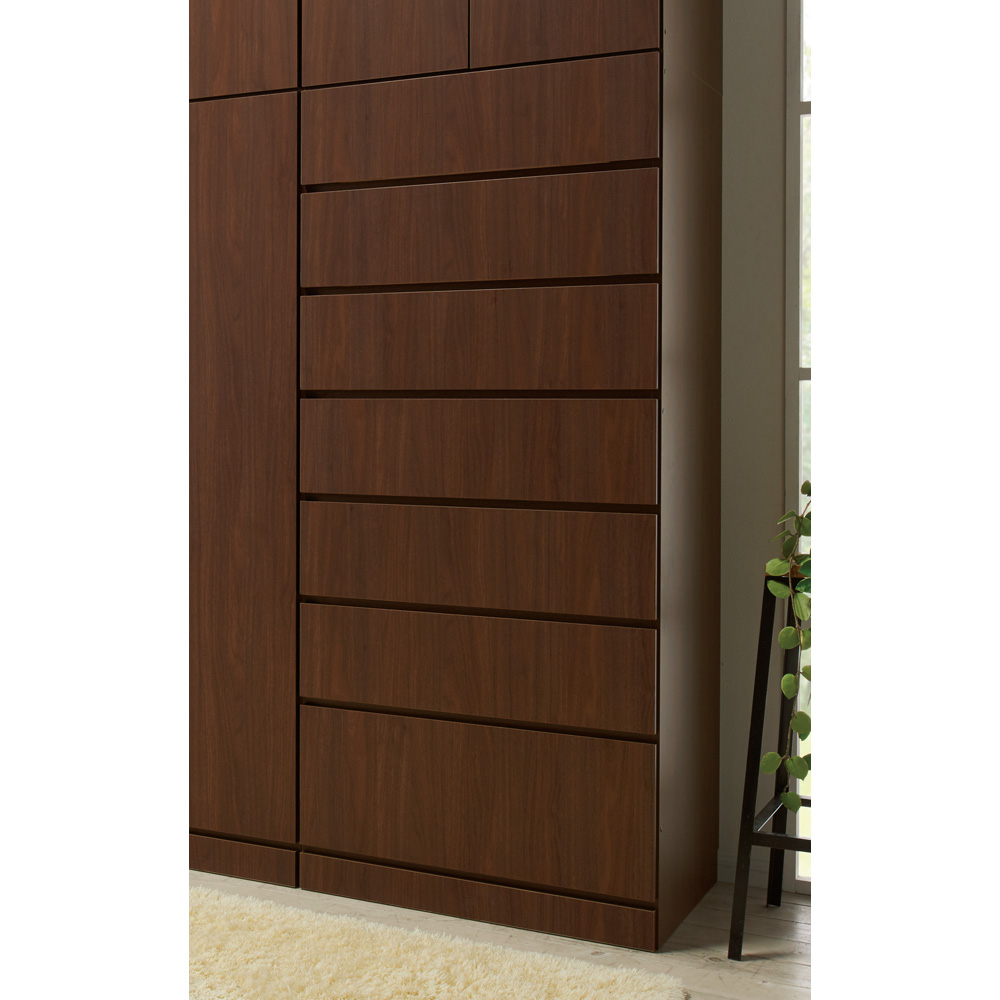 さまざまな部屋にマッチする自由自在のワードローブ。まるで備え付けのような上品で美しい定番ワードローブ。リビングや家事室、寝室などでも、たっぷりの収納力を発揮。突っ張り式の上置き(別売り)使用で天井までギッシリ収納スペースに!●【POINT1】収納物に応じて選べる全14タイプ幅は60cmと80cmの2タイプ、そして収納タイプも用途に応じてハンガー2段・ハンガー&引き出し・棚タイプ・タワーチェスト(+上置き)からお選びいただけます。《ハンガー2段》上段にシャツやジャケットを、下段にパンツやスカート類などを効率よく大量に収納することができます。下段ハンガーパイプ(3cmピッチ5段階可動式)は取り外し可能ですので、コートなどの丈の長い衣類も収納できます。可動棚板1枚付き。《ハンガー&引き出し》上の観音扉内にシャツやジャケットをハンガー掛けで、下の引き出しにTシャツやパンツ、下着類をたたんで効率よく収納することができます。《棚タイプ》パンツやTシャツ、タオルなどをたたんで収納したりバッグや帽子など並べて収納したり様々なアイテムを収納できます。3cm間隔で4枚の可動棚板を動かせますので、収納物に合わせてフレキシブルに対応できます。《タワーチェスト》引き出しは全段ストッパー付きスライドレールで収納時などはスムーズに開閉できます。下の段には普段頻繁に使用する衣類を、上の段にはオフシーズン衣類を収納すると便利です。上から1〜3段目と5・6段目は入れ替えができますので、簡単に衣替えができます。●【POINT2】お手入れがしやすく、どんなインテリアにも合わせやすい表面材色は3色をご用意。お部屋のインテリアや好みに応じてお選びいただけます。・ホワイト木目:うっすらと木目が見える癖のない色。お部屋を広く演出してくれます・ブラウン:スタイリッシュな空間を演出する天然木調の横木目柄・ナチュラル:北欧テイストにもピッタリ。まるで本物の木目のようなぬくもりがあります●【POINT3】使いやすいこだわりのポイントが随所に・扉はプッシュラッチ式で、ホコリの侵入を防ぐ防塵フラップ付きです。・幅木よけカットで壁面にぴったり設置できます。・床から扉の底辺までは約10cmの台輪付きなので、開閉時にラグなどを引きずることもありません。・突っ張り式上置き(別売)との組合せで天井高229〜255cmに突っ張ることができます