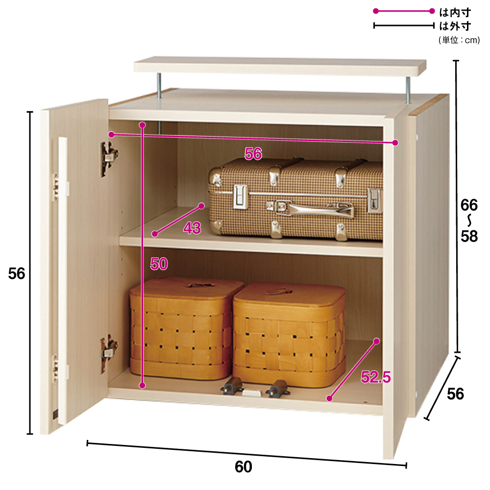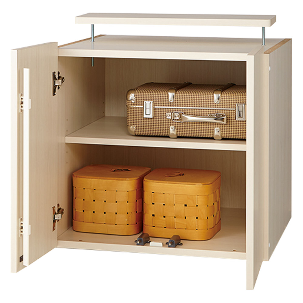 内部の構造(ア)ホワイト(木目調) 棚板3cmピッチ5段階調整。扉はプッシュ式。
