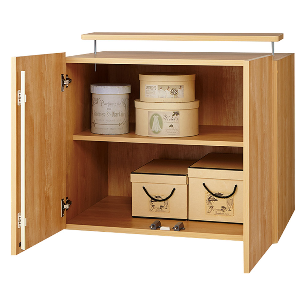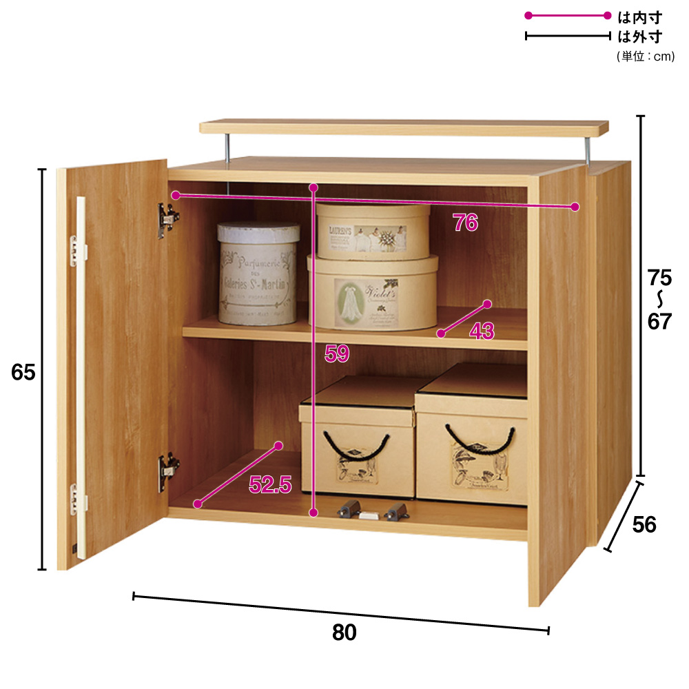 内部の構造(イ)ナチュラル 棚板3cmピッチ5段階調整。扉はプッシュ式。