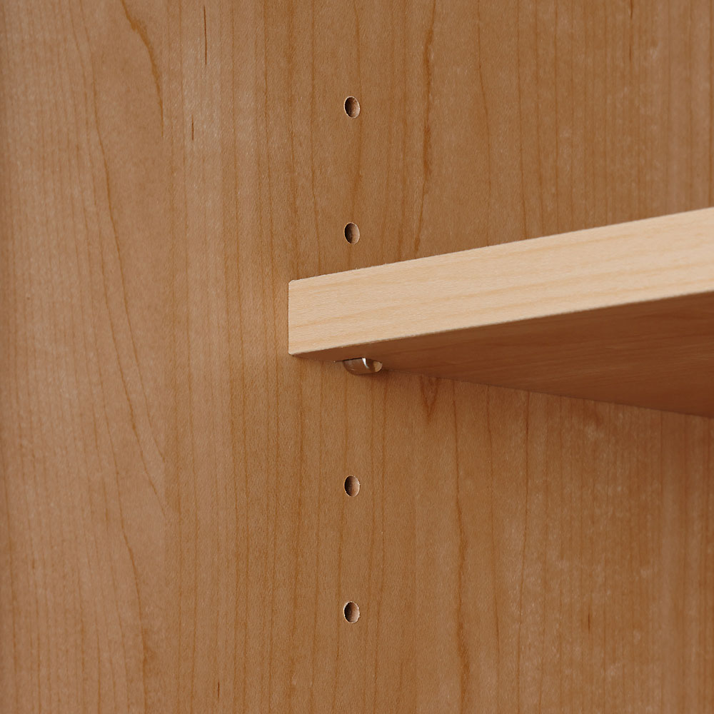可動棚板は3cm間隔で調節可能。また、飛び出しや跳ね上がりも防ぐストッパー付きダボ(金具)で固定します。
