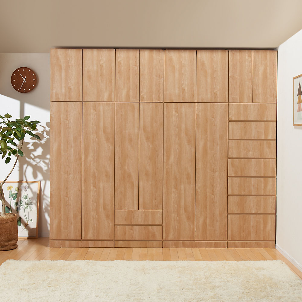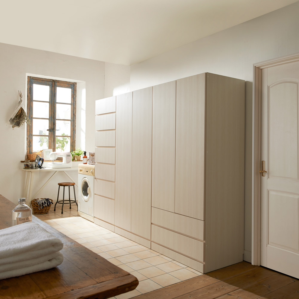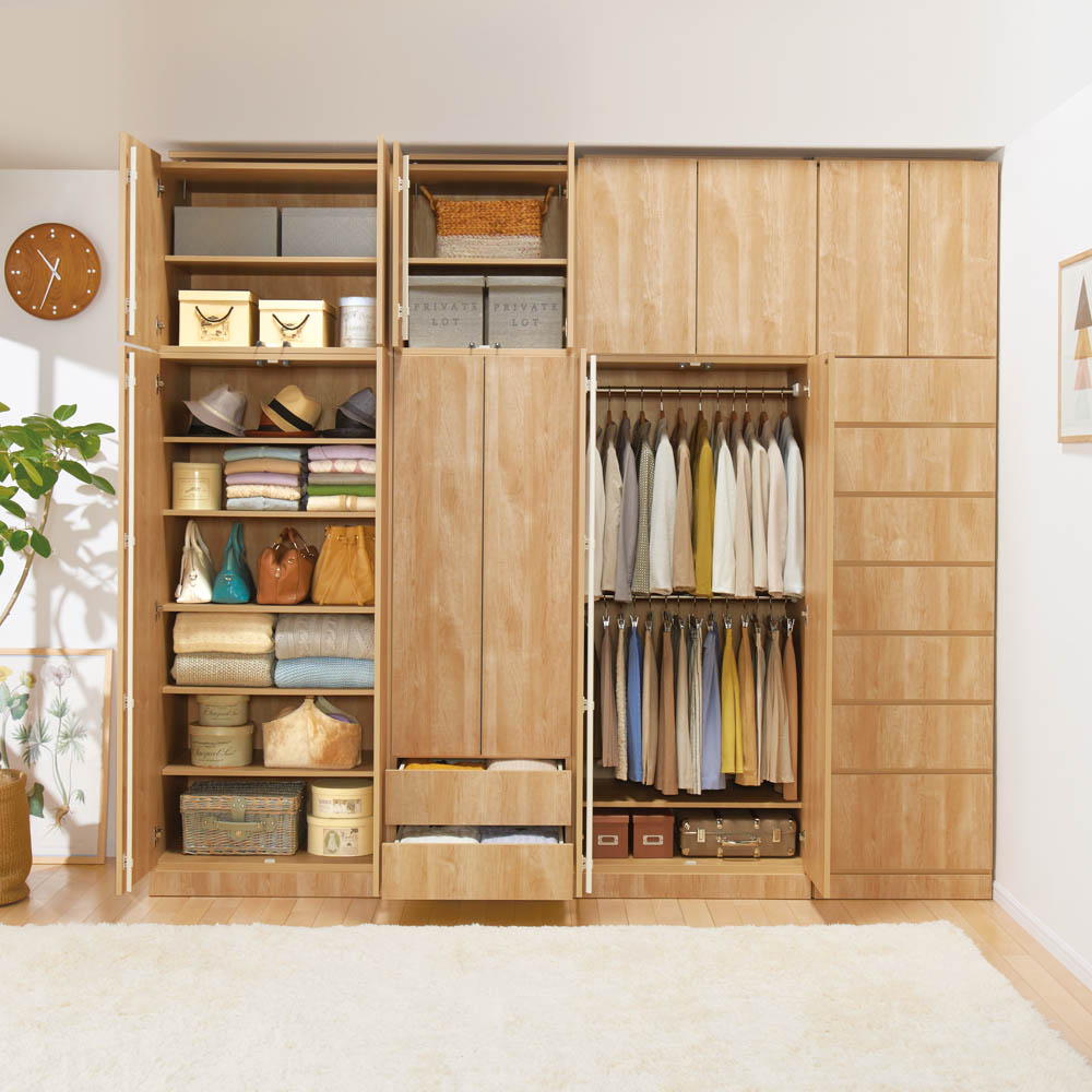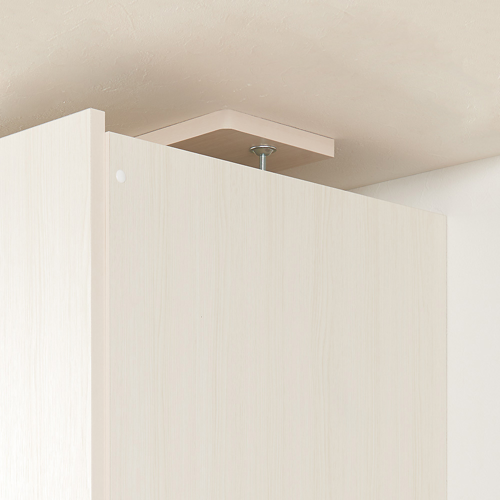さまざまな部屋にマッチする自由自在のワードローブ。まるで備え付けのような上品で美しい定番ワードローブ。リビングや家事室、寝室などでも、たっぷりの収納力を発揮。突っ張り式の上置き使用で天井までギッシリ収納スペースに!【突っ張り対応天井高さ=247〜255cm】廻り縁があっても突っ張れる上置き仕様。さまざまな部屋にマッチする自由自在のワードローブシリーズの上置きです。まるで備え付けのような上品さと美しさ。リビングや家事室、寝室などでも、たっぷりの収納力を発揮。色はホワイト(木目調)、ナチュラル、ブラウンの3色からお選びいただけます。扉はプッシュラッチ式で、ホコリよけの防塵フラップ付き。可動棚板1枚付き。同シリーズのワードロ−ブやタワーチェストなどと組み合わせてご使用ください。天井高247〜255cmに対応します。同シリーズ商品との設置の際に便利な連結機能(連結ボルト)を備えております。同シリーズ本体と組み合わせることで収納力を強化することができます。水拭き可能です。