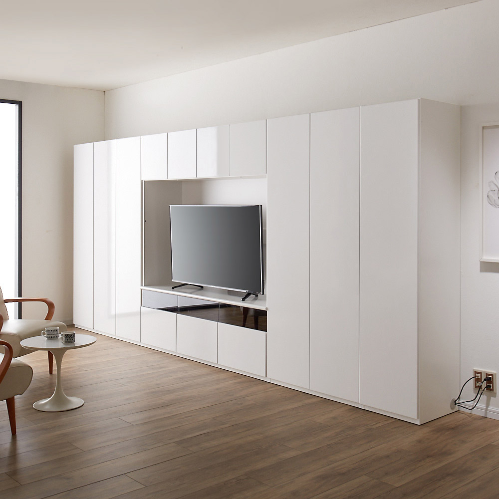 雑多な生活用品をキレイに隠してたっぷりしまえるシステム壁面収納。ライフスタイルに合わせて豊富なラインナップから組み合わせができます。別売りの高さオーダー突っ張り式上置きをジョイントすれば天井ぴったりの収納空間が実現します。前板の色見本は無料です。機能満載!様々なスペースに設置することを考えたシステム壁面収納家具が登場!●シリーズのテレビ台の種類は幅、奥行、テレビ設置高さ、デッキ類収納数、カラーで選べる24種類。●本体同士をつなげる側面の配線穴にコードを横に通せば壁際をはわせていたコードをすっきり隠せます。●配線に配慮した家具シリーズなので、テレビ、パソコン、オーディオ、AV機器類周りの壁面収納にピッタリ。●しかも奥行44cmの大容量収納タイプなので壁面いっぱいを収納スペースとして有効活用できます。●同シリーズのオーダー対応上置きと組み合わせれば、天井までのスペースいっぱいを収納棚としてご利用いただけます。●カラーは、ア)光沢感のあるホワイト イ)木目のやわらかい印象が特徴のナチュラル ウ)高級感あるウォルナット調のダークブラウン の3種類。●壁紙に合わせても、他の家具類や扉、窓枠、床色に合わせてもOK!★「生活感を隠す壁面収納シリーズ」は、扉タイプやテレビ台などいろいろなアイテムを組み合わせて使用いただけます。アイテムを組み合わせた際の完成イメージが一目でわかるシミュレータをご用意しています!こちらのページ下部の「お部屋に合わせて選ぶ壁面収納」特集よりご使用ください。(スマートフォンには対応していません。)