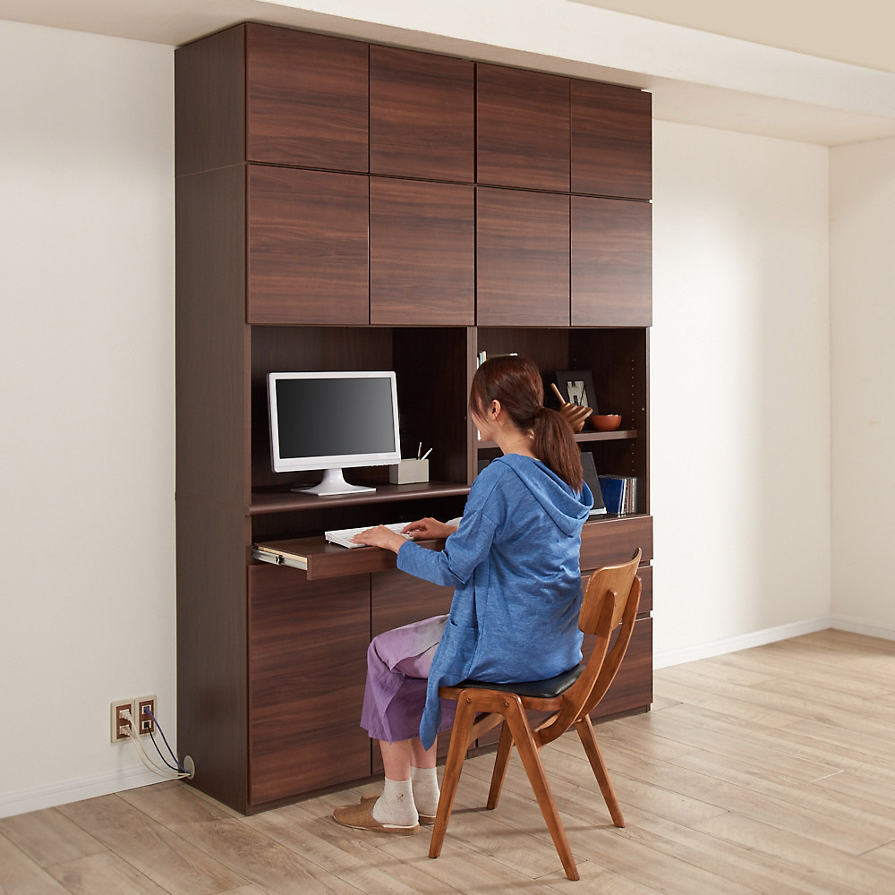 コーディネート例(ウ)ダークブラウン PCデスクや配線自在のオープン棚で、実現できる機能的なホームオフィス。 ※写真の梁下高さ220cm