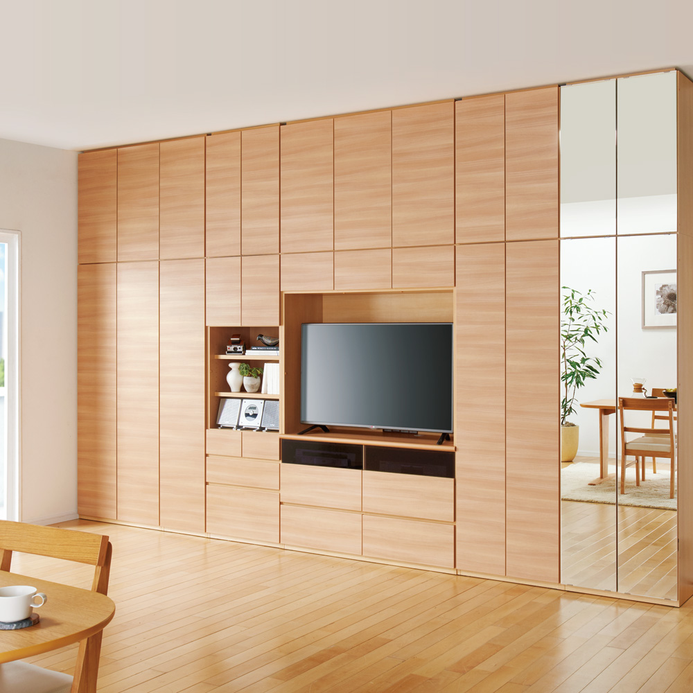 雑多な生活用品をキレイに隠してたっぷりしまえるシステム壁面収納。ライフスタイルに合わせて豊富なラインナップから組み合わせができます。別売りの高さオーダー突っ張り式上置きをジョイントすれば天井ぴったりの収納空間が実現します。前板の色見本は無料です。機能満載!様々なスペースに設置することを考えたシステム壁面収納家具が登場!●シリーズのテレビ台の種類は幅、奥行、テレビ設置高さ、デッキ類収納数、カラーで選べる24種類。●本体同士をつなげる側面の配線穴にコードを横に通せば壁際をはわせていたコードをすっきり隠せます。●配線に配慮した家具シリーズなので、テレビ、パソコン、オーディオ、AV機器類周りの壁面収納にピッタリ。●しかも奥行44cmの大容量収納タイプなので壁面いっぱいを収納スペースとして有効活用できます。●同シリーズのオーダー対応上置きと組み合わせれば、天井までのスペースいっぱいを収納棚としてご利用いただけます。●カラーは、ア)光沢感のあるホワイト イ)木目のやわらかい印象が特徴のナチュラル ウ)高級感あるウォルナット調のダークブラウン の3種類。●壁紙に合わせても、他の家具類や扉、窓枠、床色に合わせてもOK!