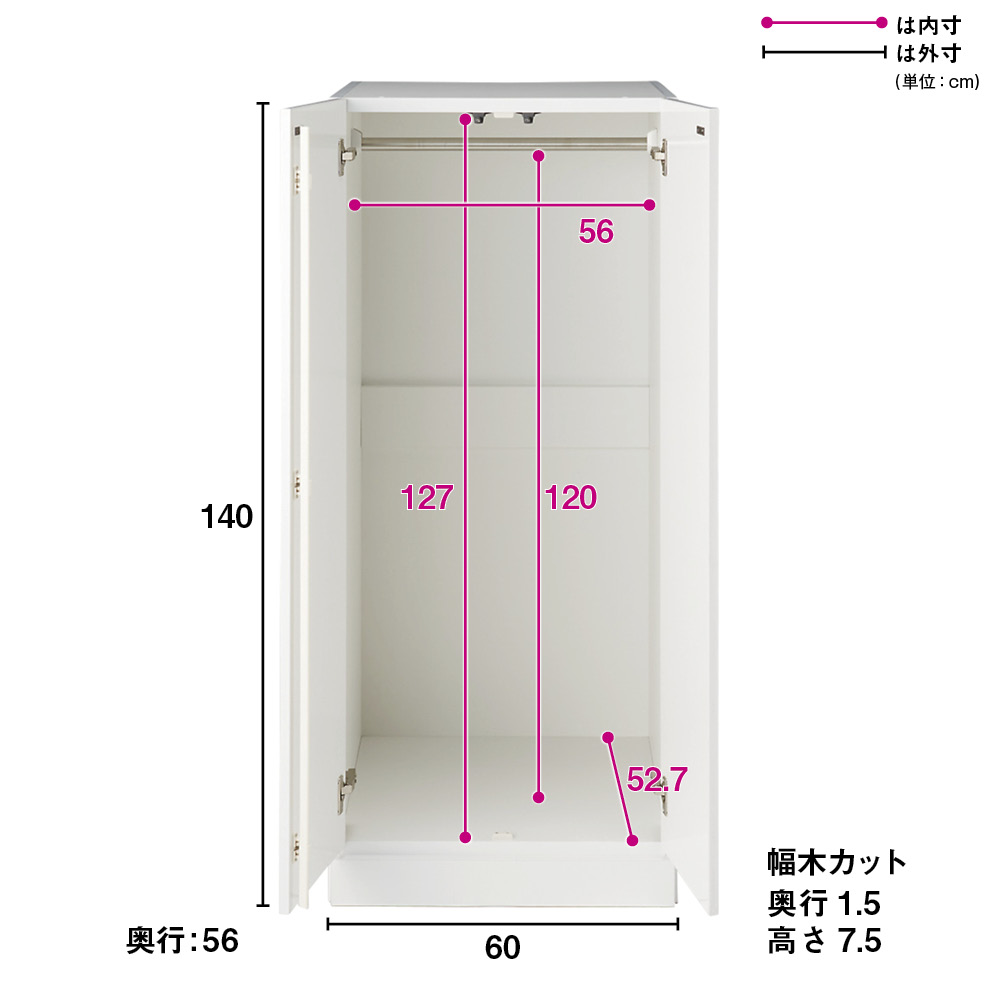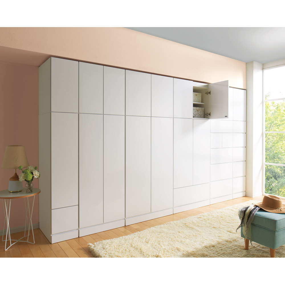 梁にぴったり、まるで備え付けのよう!これぞ壁面収納ワードローブの決定版!お部屋の複雑な天井構造にもしっかり対応してくれる一押しの機能派商品!天井の大きい梁、重なり合う梁、いろいろな梁下など、その構造で壁面収納を諦めざるを得なかった、そんな悩みを一気に解決する商品です。サイズやタイプの違う40種類から自由な組み合わせが可能なしたい衣類収納空間を実現する一押しの壁面収納ワードローブシリーズ!商品のポイントは3つあります(1)本体高さ140cmと180cmの2タイプあることにより対応する天井または梁下高さが168〜272cmとなり、対応範囲がとても広くなっております。(2)幅30cm、40cmの幅の狭い本体、上置きをご用意することで、縦方向の大きな梁下でも突っ張れるように考慮しております。(3)上置きの突っ張り板を隠して見た目をスッキリさせながら、(本体よりも)奥行の浅い梁下でも突っ張れるように、突っ張り板の奥行も浅くしつつ、後方に位置させております。上記のポイントから、大きな梁、高さはあるけど奥行は浅い梁、縦方向の大きな梁といった様々なタイプの梁下でも設置できるようになっている優れもの商品です。1.シリーズバリエーション40種類以上●幅は30cm、40cm、60cm、80cmの4サイズから。●奥行は56cmで全シリーズ共通です。●本体商品の高さは140cmと180cmの2タイプとなっております。●型タイプはハンガータイプ (※140cmはハンガーバー1本、高さ180cmはハンガーバー2本)ハンガー&引き出しタイプ棚タイプタワーチェストタイプからお選びいただけます。●商品カラーは清潔感のある優しい艶色のホワイト、自然の温もりを感じる横木目調のナチュラル、上質空間を演出する大人な横木目調のダークブラウンの3色からお選びいただけます。2.うれしい機能が充実な、こだわりの設計構造!●扉はプッシュ式扉になっているので、手で押すだけでスムーズに開閉できる仕様になっております。●引き出しが付いている商品はスライドレール仕様となっており、開け閉めがとてもラクラクです。●上置き商品は突っ張り式なので、商品と天井をしっかり支えることができとても安心です。●本体は床と接する部分の板を厚めにしており、床からのほこり侵入を開閉時も抑えることができます。●最下段の引き出しは、ラグなどを手前に敷いていても引っかからずにスムーズに開閉できます。●本体は幅木対応(1.5cm×7.5cm)となっておりますので、壁にピッタリの設置が出来ます。●転倒防止バンドもついておりますので、上置き購入がなく本体のみても安心してお使いいただけます。●こだわりのシートをぜいたくに使用しており、高級感のある商品に仕上がっております。●ホワイトは優しい艶感のある清潔感溢れる汚れに強いエクセルイーゴスシートを使用。●ナチュラルとダークブラウンには横木目が美しく映え、摩擦や傷にも強いオレフィンシートを使用しております。●飽きの来ないシンプルを追求した洗練デザインなので、どんなお部屋にもマッチし、末永くお使いいただけます。3.商品補足説明●本体幅30cmと幅40cmの扉タイプ商品のご購入を検討されている方は、扉の右開き、左開きを選択してご購入していただけます。(※タワーチェストタイプは除く)●もちろん梁のない壁面の天井でもばっちり設置可能ですので、マンションでも一戸建てにお住まいのお客様でもご使用いただけます。●上置きご希望の方は、本体の幅サイズに合わせて、高さ26〜90cmでオーダーできます。本体との組み合わせで天井【梁下】対応は168cm〜272cmとなります。