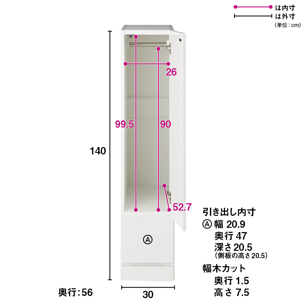 梁にぴったり、まるで備え付けのよう!これぞ壁面収納ワードローブの決定版!お部屋の複雑な天井構造にもしっかり対応してくれる一押しの機能派商品!天井の大きい梁、重なり合う梁、いろいろな梁下など、その構造で壁面収納を諦めざるを得なかった、そんな悩みを一気に解決する商品です。サイズやタイプの違う40種類から自由な組み合わせが可能なしたい衣類収納空間を実現する一押しの壁面収納ワードローブシリーズ!商品のポイントは3つあります(1)本体高さ140cmと180cmの2タイプあることにより対応する天井または梁下高さが168〜272cmとなり、対応範囲がとても広くなっております。(2)幅30cm、40cmの幅の狭い本体、上置きをご用意することで、縦方向の大きな梁下でも突っ張れるように考慮しております。(3)上置きの突っ張り板を隠して見た目をスッキリさせながら、(本体よりも)奥行の浅い梁下でも突っ張れるように、突っ張り板の奥行も浅くしつつ、後方に位置させております。上記のポイントから、大きな梁、高さはあるけど奥行は浅い梁、縦方向の大きな梁といった様々なタイプの梁下でも設置できるようになっている優れもの商品です。1.シリーズバリエーション40種類以上●幅は30cm、40cm、60cm、80cmの4サイズから。●奥行は56cmで全シリーズ共通です。●本体商品の高さは140cmと180cmの2タイプとなっております。●型タイプはハンガータイプ (※140cmはハンガーバー1本、高さ180cmはハンガーバー2本)ハンガー&引き出しタイプ棚タイプタワーチェストタイプからお選びいただけます。●商品カラーは清潔感のある優しい艶色のホワイト、自然の温もりを感じる横木目調のナチュラル、上質空間を演出する大人な横木目調のダークブラウンの3色からお選びいただけます。2.うれしい機能が充実な、こだわりの設計構造!●扉はプッシュ式扉になっているので、手で押すだけでスムーズに開閉できる仕様になっております。●引き出しが付いている商品はスライドレール仕様となっており、開け閉めがとてもラクラクです。●上置き商品は突っ張り式なので、商品と天井をしっかり支えることができとても安心です。●本体は床と接する部分の板を厚めにしており、床からのほこり侵入を開閉時も抑えることができます。●最下段の引き出しは、ラグなどを手前に敷いていても引っかからずにスムーズに開閉できます。●本体は幅木対応(1.5cm×7.5cm)となっておりますので、壁にピッタリの設置が出来ます。●転倒防止バンドもついておりますので、上置き購入がなく本体のみても安心してお使いいただけます。●こだわりのシートをぜいたくに使用しており、高級感のある商品に仕上がっております。●ホワイトは優しい艶感のある清潔感溢れる汚れに強いエクセルイーゴスシートを使用。●ナチュラルとダークブラウンには横木目が美しく映え、摩擦や傷にも強いオレフィンシートを使用しております。●飽きの来ないシンプルを追求した洗練デザインなので、どんなお部屋にもマッチし、末永くお使いいただけます。3.商品補足説明●本体幅30cmと幅40cmの扉タイプ商品のご購入を検討されている方は、扉の右開き、左開きを選択してご購入していただけます。(※タワーチェストタイプは除く)●もちろん梁のない壁面の天井でもばっちり設置可能ですので、マンションでも一戸建てにお住まいのお客様でもご使用いただけます。●上置きご希望の方は、本体の幅サイズに合わせて、高さ26〜90cmでオーダーできます。本体との組み合わせで天井【梁下】対応は168cm〜272cmとなります。