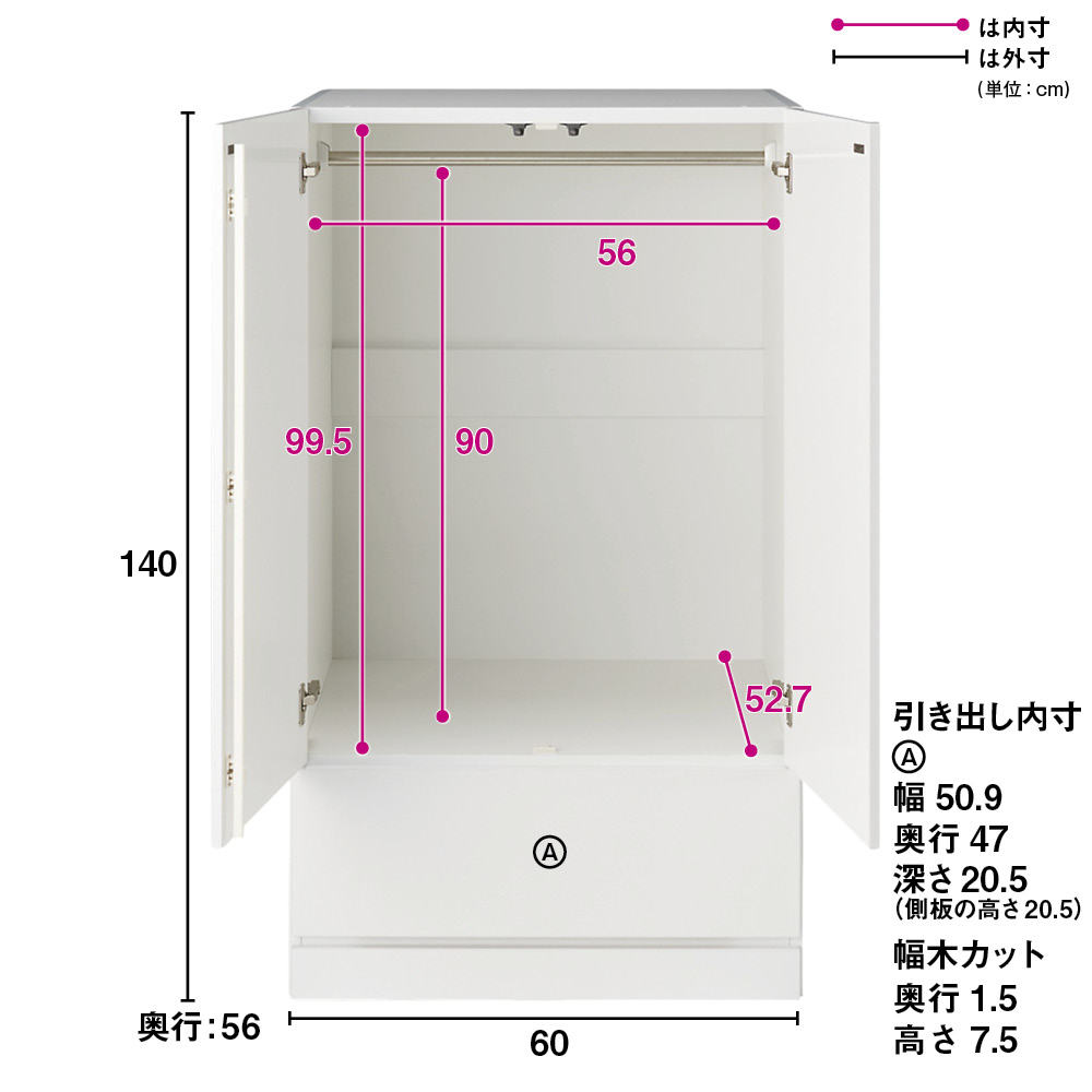 梁にぴったり、まるで備え付けのよう!これぞ壁面収納ワードローブの決定版!お部屋の複雑な天井構造にもしっかり対応してくれる一押しの機能派商品!天井の大きい梁、重なり合う梁、いろいろな梁下など、その構造で壁面収納を諦めざるを得なかった、そんな悩みを一気に解決する商品です。サイズやタイプの違う40種類から自由な組み合わせが可能なしたい衣類収納空間を実現する一押しの壁面収納ワードローブシリーズ!商品のポイントは3つあります(1)本体高さ140cmと180cmの2タイプあることにより対応する天井または梁下高さが168〜272cmとなり、対応範囲がとても広くなっております。(2)幅30cm、40cmの幅の狭い本体、上置きをご用意することで、縦方向の大きな梁下でも突っ張れるように考慮しております。(3)上置きの突っ張り板を隠して見た目をスッキリさせながら、(本体よりも)奥行の浅い梁下でも突っ張れるように、突っ張り板の奥行も浅くしつつ、後方に位置させております。上記のポイントから、大きな梁、高さはあるけど奥行は浅い梁、縦方向の大きな梁といった様々なタイプの梁下でも設置できるようになっている優れもの商品です。1.シリーズバリエーション40種類以上●幅は30cm、40cm、60cm、80cmの4サイズから。●奥行は56cmで全シリーズ共通です。●本体商品の高さは140cmと180cmの2タイプとなっております。●型タイプはハンガータイプ (※140cmはハンガーバー1本、高さ180cmはハンガーバー2本)ハンガー&引き出しタイプ棚タイプタワーチェストタイプからお選びいただけます。●商品カラーは清潔感のある優しい艶色のホワイト、自然の温もりを感じる横木目調のナチュラル、上質空間を演出する大人な横木目調のダークブラウンの3色からお選びいただけます。2.うれしい機能が充実な、こだわりの設計構造!●扉はプッシュ式扉になっているので、手で押すだけでスムーズに開閉できる仕様になっております。●引き出しが付いている商品はスライドレール仕様となっており、開け閉めがとてもラクラクです。●上置き商品は突っ張り式なので、商品と天井をしっかり支えることができとても安心です。●本体は床と接する部分の板を厚めにしており、床からのほこり侵入を開閉時も抑えることができます。●最下段の引き出しは、ラグなどを手前に敷いていても引っかからずにスムーズに開閉できます。●本体は幅木対応(1.5cm×7.5cm)となっておりますので、壁にピッタリの設置が出来ます。●転倒防止バンドもついておりますので、上置き購入がなく本体のみても安心してお使いいただけます。●こだわりのシートをぜいたくに使用しており、高級感のある商品に仕上がっております。●ホワイトは優しい艶感のある清潔感溢れる汚れに強いエクセルイーゴスシートを使用。●ナチュラルとダークブラウンには横木目が美しく映え、摩擦や傷にも強いオレフィンシートを使用しております。●飽きの来ないシンプルを追求した洗練デザインなので、どんなお部屋にもマッチし、末永くお使いいただけます。3.商品補足説明●本体幅30cmと幅40cmの扉タイプ商品のご購入を検討されている方は、扉の右開き、左開きを選択してご購入していただけます。(※タワーチェストタイプは除く)●もちろん梁のない壁面の天井でもばっちり設置可能ですので、マンションでも一戸建てにお住まいのお客様でもご使用いただけます。●上置きご希望の方は、本体の幅サイズに合わせて、高さ26〜90cmでオーダーできます。本体との組み合わせで天井【梁下】対応は168cm〜272cmとなります。
