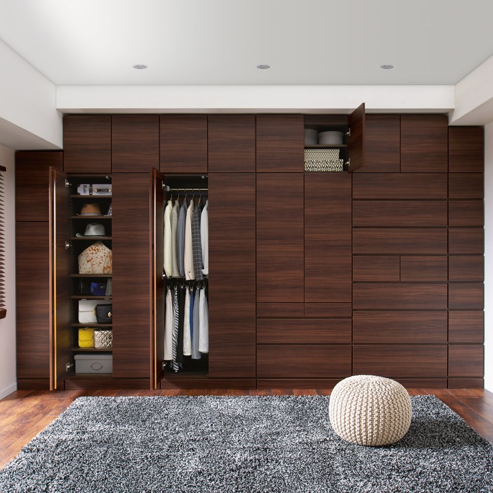 大きな梁、重なり合う梁下にも対応する突っ張り式壁面収納。サイズやタイプが異なる40種類から自由に組み合わせて、壁面全体を美しく効率的に活用できます。