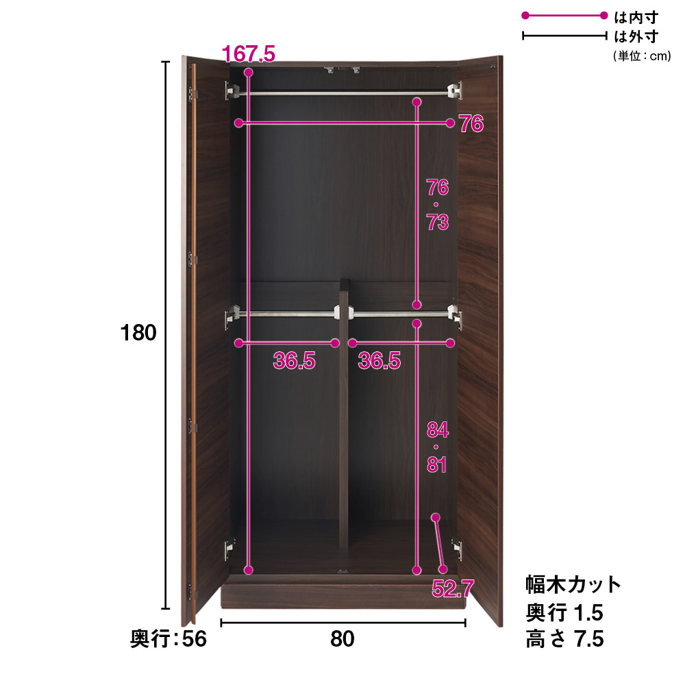 梁にぴったり、まるで備え付けのよう!これぞ壁面収納ワードローブの決定版!お部屋の複雑な天井構造にもしっかり対応してくれる一押しの機能派商品!天井の大きい梁、重なり合う梁、いろいろな梁下など、その構造で壁面収納を諦めざるを得なかった、そんな悩みを一気に解決する商品です。サイズやタイプの違う40種類から自由な組み合わせが可能なしたい衣類収納空間を実現する一押しの壁面収納ワードローブシリーズ!商品のポイントは3つあります(1)本体高さ140cmと180cmの2タイプあることにより対応する天井または梁下高さが168〜272cmとなり、対応範囲がとても広くなっております。(2)幅30cm、40cmの幅の狭い本体、上置きをご用意することで、縦方向の大きな梁下でも突っ張れるように考慮しております。(3)上置きの突っ張り板を隠して見た目をスッキリさせながら、(本体よりも)奥行の浅い梁下でも突っ張れるように、突っ張り板の奥行も浅くしつつ、後方に位置させております。上記のポイントから、大きな梁、高さはあるけど奥行は浅い梁、縦方向の大きな梁といった様々なタイプの梁下でも設置できるようになっている優れもの商品です。1.シリーズバリエーション40種類以上●幅は30cm、40cm、60cm、80cmの4サイズから。●奥行は56cmで全シリーズ共通です。●本体商品の高さは140cmと180cmの2タイプとなっております。●型タイプはハンガータイプ (※140cmはハンガーバー1本、高さ180cmはハンガーバー2本)ハンガー&引き出しタイプ棚タイプタワーチェストタイプからお選びいただけます。●商品カラーは清潔感のある優しい艶色のホワイト、自然の温もりを感じる横木目調のナチュラル、上質空間を演出する大人な横木目調のダークブラウンの3色からお選びいただけます。2.うれしい機能が充実な、こだわりの設計構造!●扉はプッシュ式扉になっているので、手で押すだけでスムーズに開閉できる仕様になっております。●引き出しが付いている商品はスライドレール仕様となっており、開け閉めがとてもラクラクです。●上置き商品は突っ張り式なので、商品と天井をしっかり支えることができとても安心です。●本体は床と接する部分の板を厚めにしており、床からのほこり侵入を開閉時も抑えることができます。●最下段の引き出しは、ラグなどを手前に敷いていても引っかからずにスムーズに開閉できます。●本体は幅木対応(1.5cm×7.5cm)となっておりますので、壁にピッタリの設置が出来ます。●転倒防止バンドもついておりますので、上置き購入がなく本体のみても安心してお使いいただけます。●こだわりのシートをぜいたくに使用しており、高級感のある商品に仕上がっております。●ホワイトは優しい艶感のある清潔感溢れる汚れに強いエクセルイーゴスシートを使用。●ナチュラルとダークブラウンには横木目が美しく映え、摩擦や傷にも強いオレフィンシートを使用しております。●飽きの来ないシンプルを追求した洗練デザインなので、どんなお部屋にもマッチし、末永くお使いいただけます。3.商品補足説明●本体幅30cmと幅40cmの扉タイプ商品のご購入を検討されている方は、扉の右開き、左開きを選択してご購入していただけます。(※タワーチェストタイプは除く)●もちろん梁のない壁面の天井でもばっちり設置可能ですので、マンションでも一戸建てにお住まいのお客様でもご使用いただけます。●上置きご希望の方は、本体の幅サイズに合わせて、高さ26〜90cmでオーダーできます。本体との組み合わせで天井【梁下】対応は168cm〜272cmとなります。
