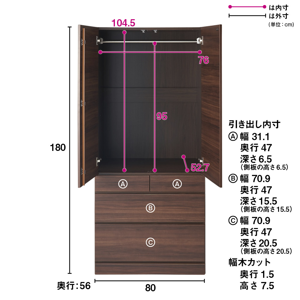 梁にぴったり、まるで備え付けのよう!これぞ壁面収納ワードローブの決定版!お部屋の複雑な天井構造にもしっかり対応してくれる一押しの機能派商品!天井の大きい梁、重なり合う梁、いろいろな梁下など、その構造で壁面収納を諦めざるを得なかった、そんな悩みを一気に解決する商品です。サイズやタイプの違う40種類から自由な組み合わせが可能なしたい衣類収納空間を実現する一押しの壁面収納ワードローブシリーズ!商品のポイントは3つあります(1)本体高さ140cmと180cmの2タイプあることにより対応する天井または梁下高さが168〜272cmとなり、対応範囲がとても広くなっております。(2)幅30cm、40cmの幅の狭い本体、上置きをご用意することで、縦方向の大きな梁下でも突っ張れるように考慮しております。(3)上置きの突っ張り板を隠して見た目をスッキリさせながら、(本体よりも)奥行の浅い梁下でも突っ張れるように、突っ張り板の奥行も浅くしつつ、後方に位置させております。上記のポイントから、大きな梁、高さはあるけど奥行は浅い梁、縦方向の大きな梁といった様々なタイプの梁下でも設置できるようになっている優れもの商品です。1.シリーズバリエーション40種類以上●幅は30cm、40cm、60cm、80cmの4サイズから。●奥行は56cmで全シリーズ共通です。●本体商品の高さは140cmと180cmの2タイプとなっております。●型タイプはハンガータイプ (※140cmはハンガーバー1本、高さ180cmはハンガーバー2本)ハンガー&引き出しタイプ棚タイプタワーチェストタイプからお選びいただけます。●商品カラーは清潔感のある優しい艶色のホワイト、自然の温もりを感じる横木目調のナチュラル、上質空間を演出する大人な横木目調のダークブラウンの3色からお選びいただけます。2.うれしい機能が充実な、こだわりの設計構造!●扉はプッシュ式扉になっているので、手で押すだけでスムーズに開閉できる仕様になっております。●引き出しが付いている商品はスライドレール仕様となっており、開け閉めがとてもラクラクです。●上置き商品は突っ張り式なので、商品と天井をしっかり支えることができとても安心です。●本体は床と接する部分の板を厚めにしており、床からのほこり侵入を開閉時も抑えることができます。●最下段の引き出しは、ラグなどを手前に敷いていても引っかからずにスムーズに開閉できます。●本体は幅木対応(1.5cm×7.5cm)となっておりますので、壁にピッタリの設置が出来ます。●転倒防止バンドもついておりますので、上置き購入がなく本体のみても安心してお使いいただけます。●こだわりのシートをぜいたくに使用しており、高級感のある商品に仕上がっております。●ホワイトは優しい艶感のある清潔感溢れる汚れに強いエクセルイーゴスシートを使用。●ナチュラルとダークブラウンには横木目が美しく映え、摩擦や傷にも強いオレフィンシートを使用しております。●飽きの来ないシンプルを追求した洗練デザインなので、どんなお部屋にもマッチし、末永くお使いいただけます。3.商品補足説明●本体幅30cmと幅40cmの扉タイプ商品のご購入を検討されている方は、扉の右開き、左開きを選択してご購入していただけます。(※タワーチェストタイプは除く)●もちろん梁のない壁面の天井でもばっちり設置可能ですので、マンションでも一戸建てにお住まいのお客様でもご使用いただけます。●上置きご希望の方は、本体の幅サイズに合わせて、高さ26〜90cmでオーダーできます。本体との組み合わせで天井【梁下】対応は168cm〜272cmとなります。